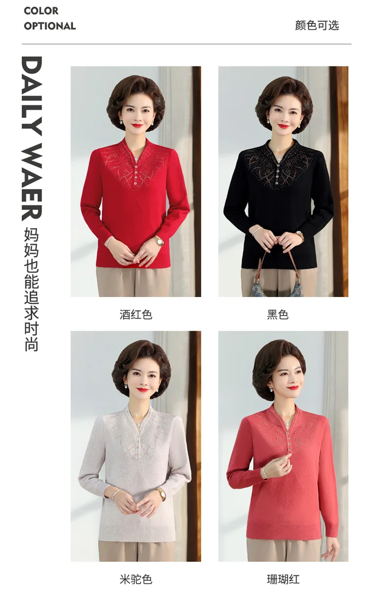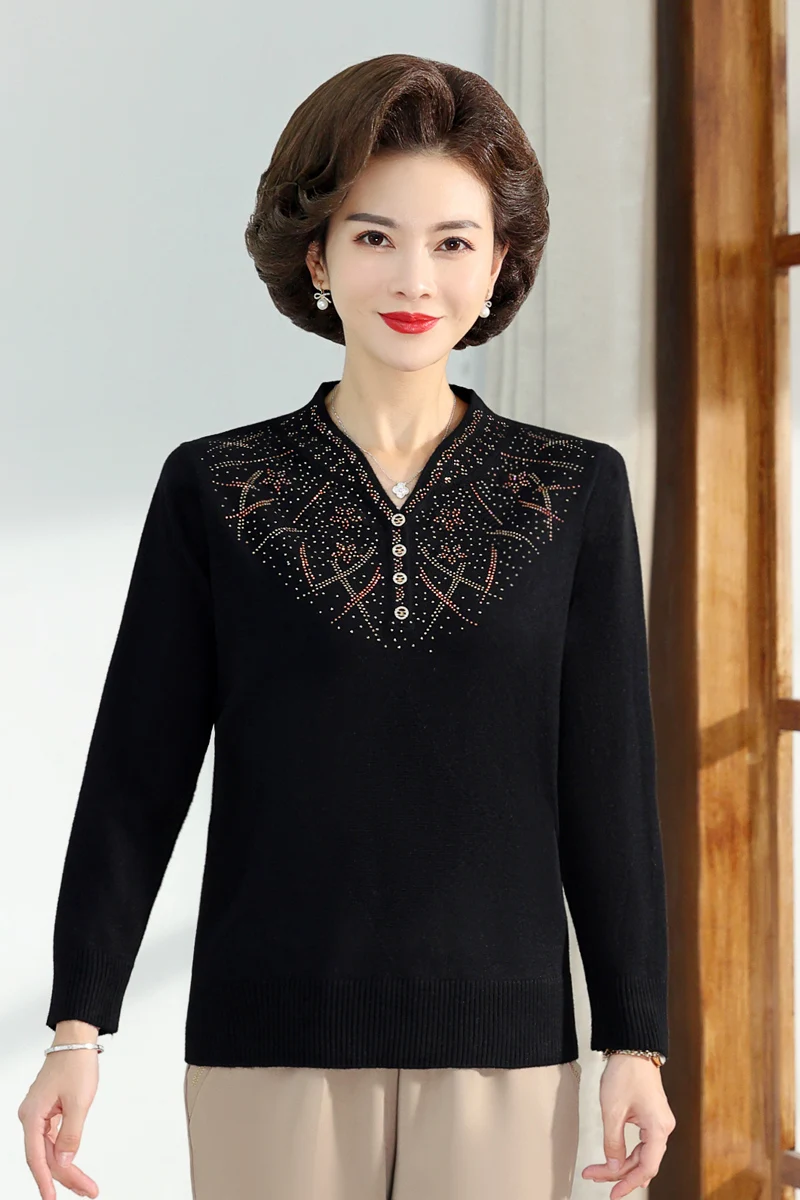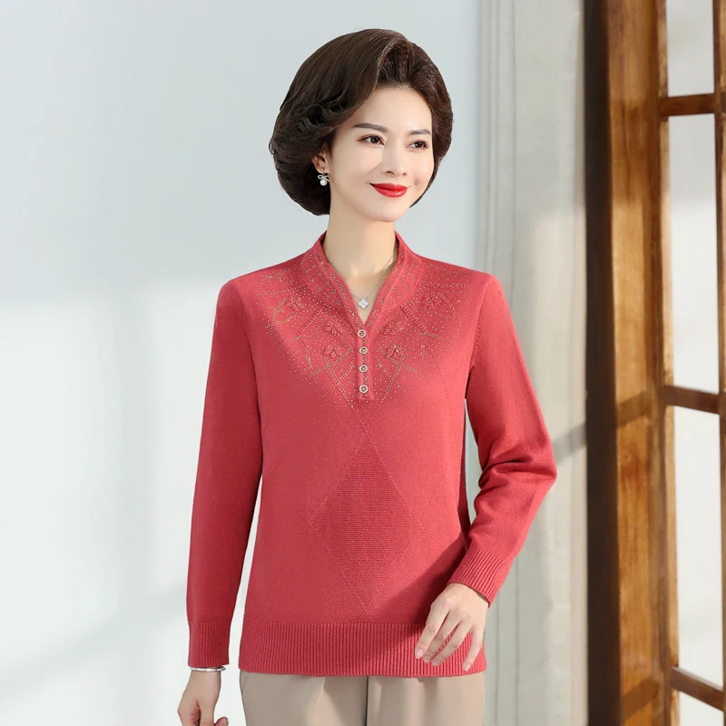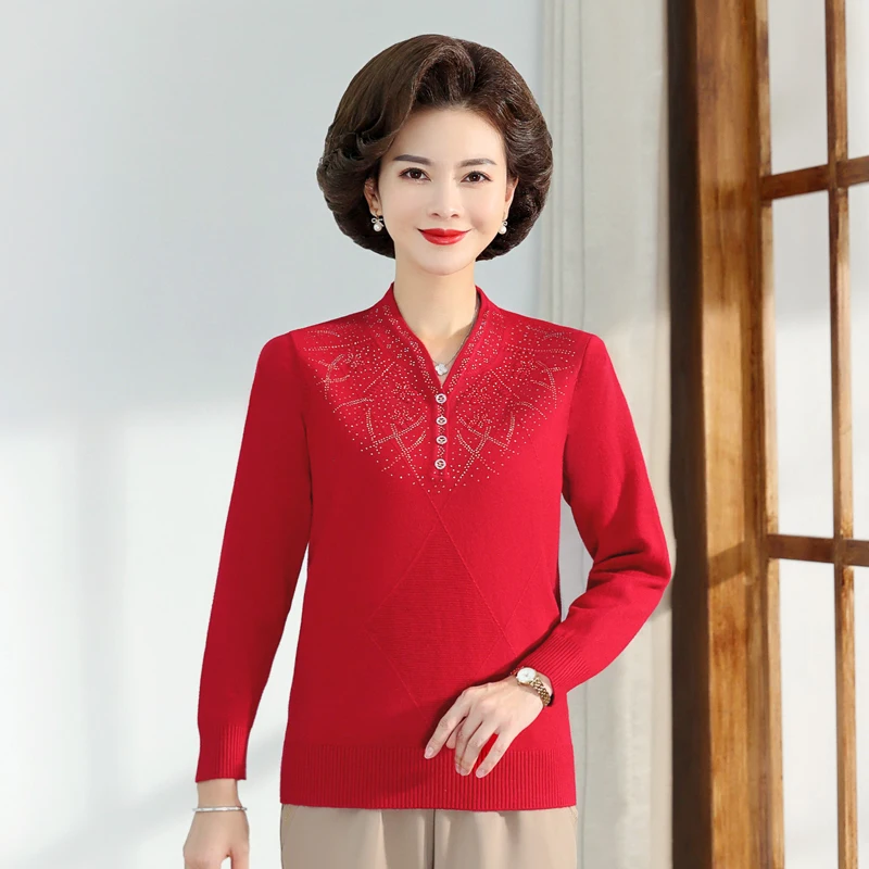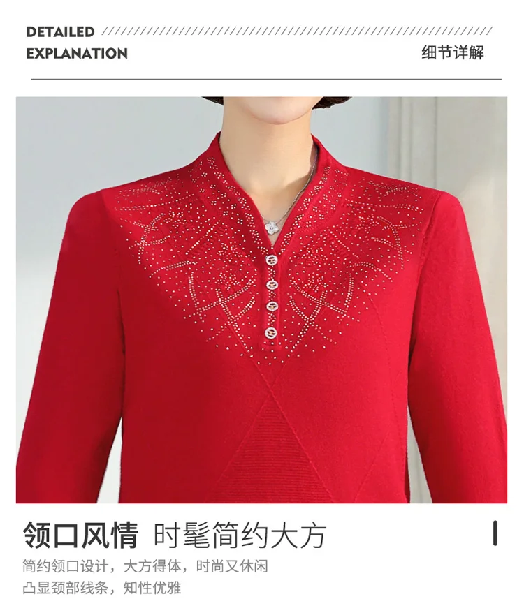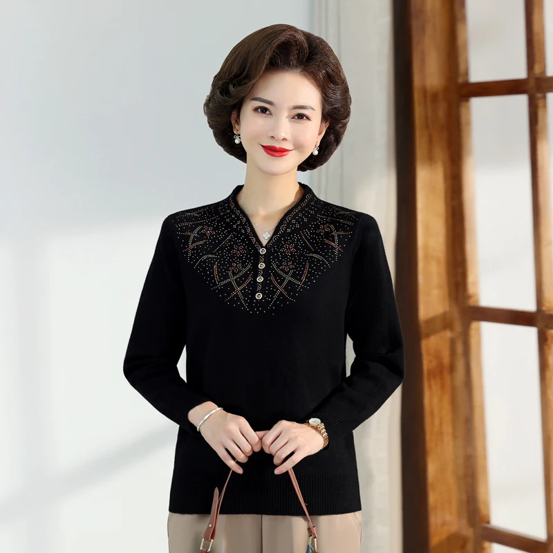 Middle-aged Women's Autumn Sweaters Pullovers V-neck JUmper Hot diamond Knitting Sweater Mother Dress Tops
