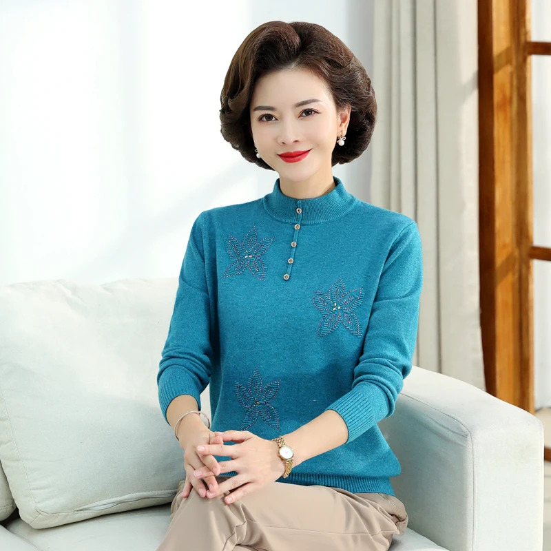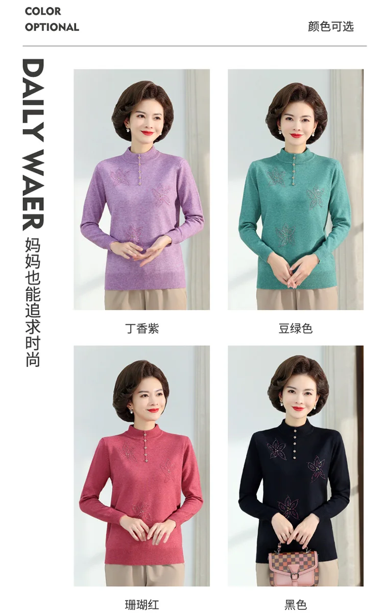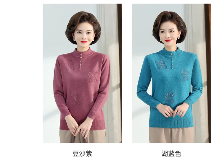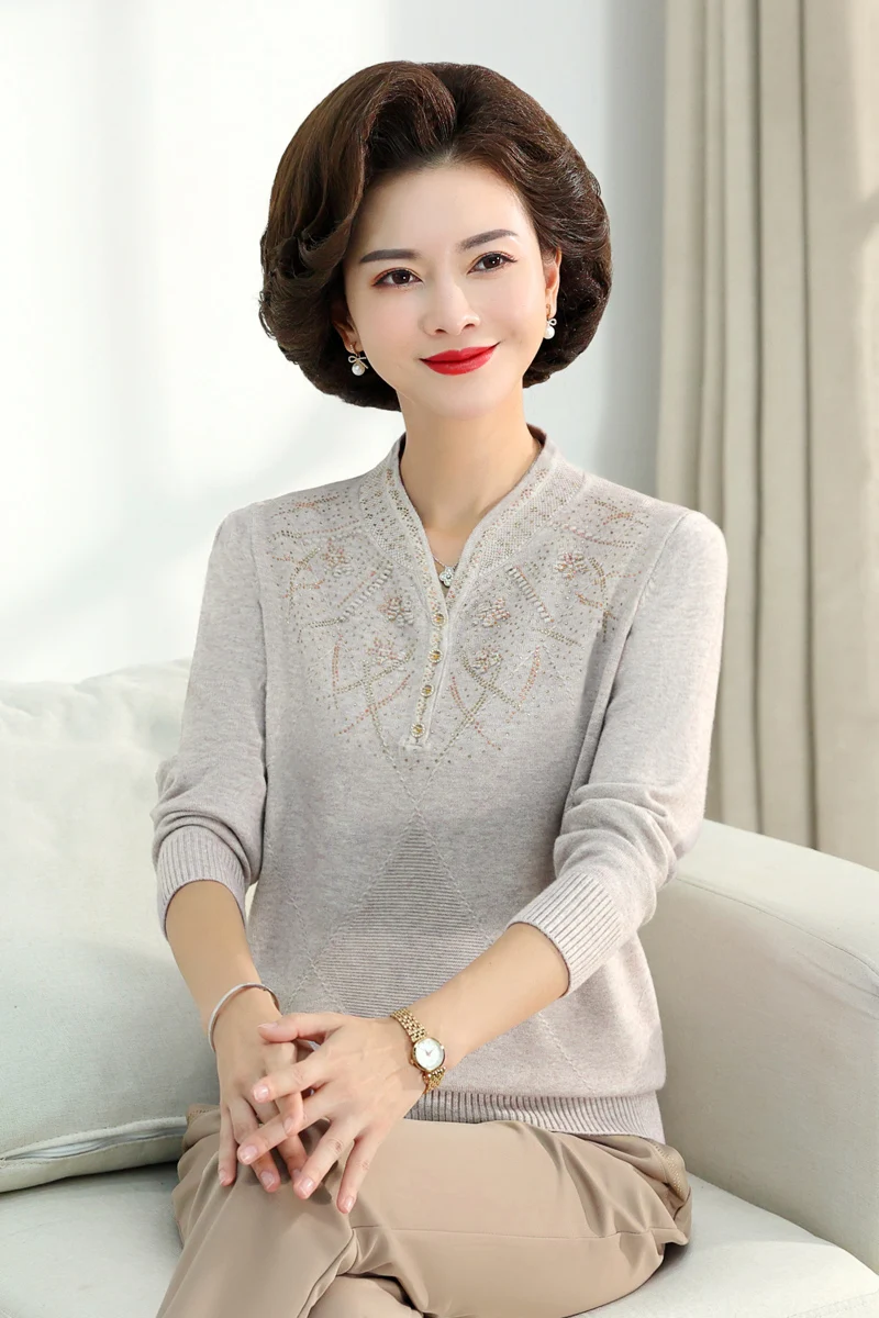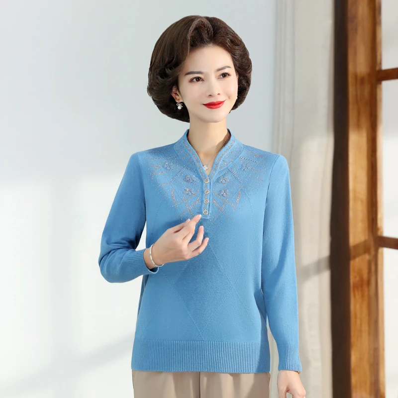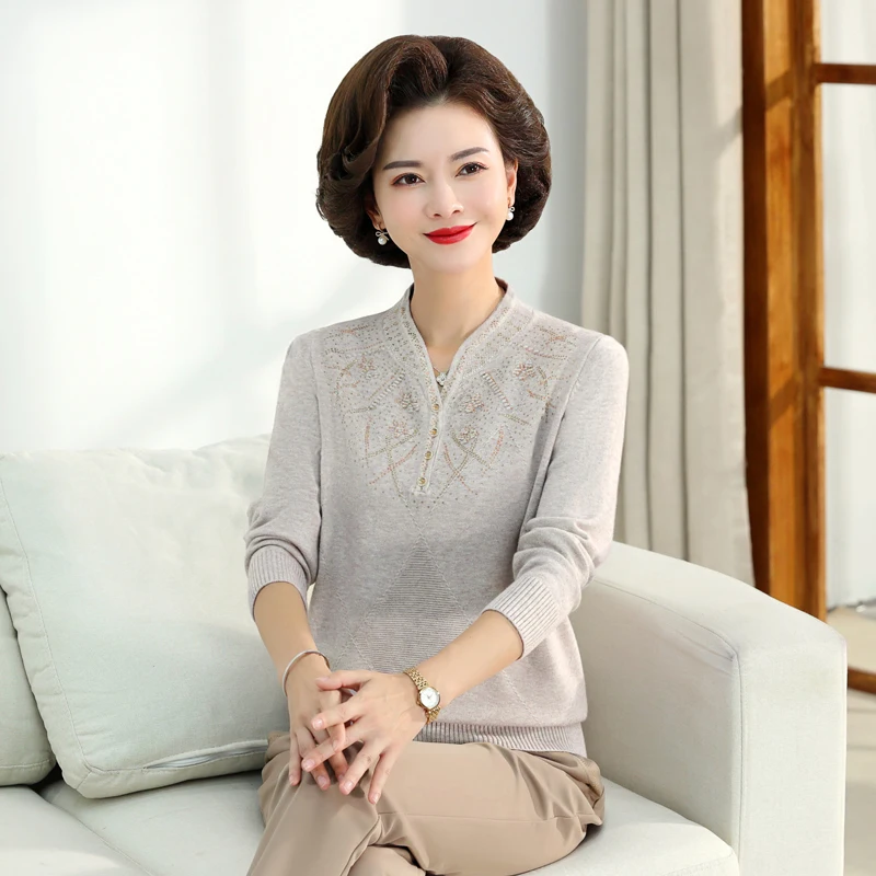 Middle-aged Women's Autumn Sweaters Pullovers V-neck JUmper Hot diamond Knitting Sweater Mother Dress Tops