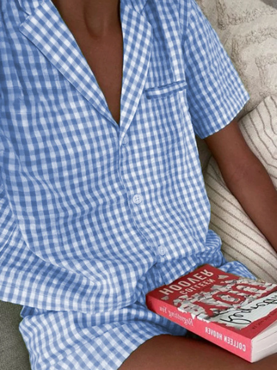 New Gingham Pajama Shorts set Women's 2 Piece Lounge Set Short Sleeve Lapel Plaid Shirt Tops Shorts Sleepwear Sets