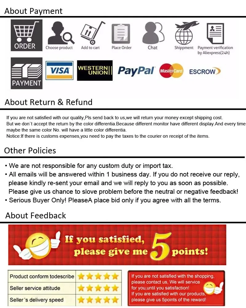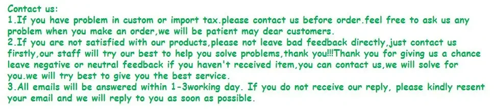 1.If you have any problems with the outcome of the transaction or product, please don't respond with negative feedback before contact us. We are very proud of our customer relations and our feedback rating and will endeavor to fix any problems.