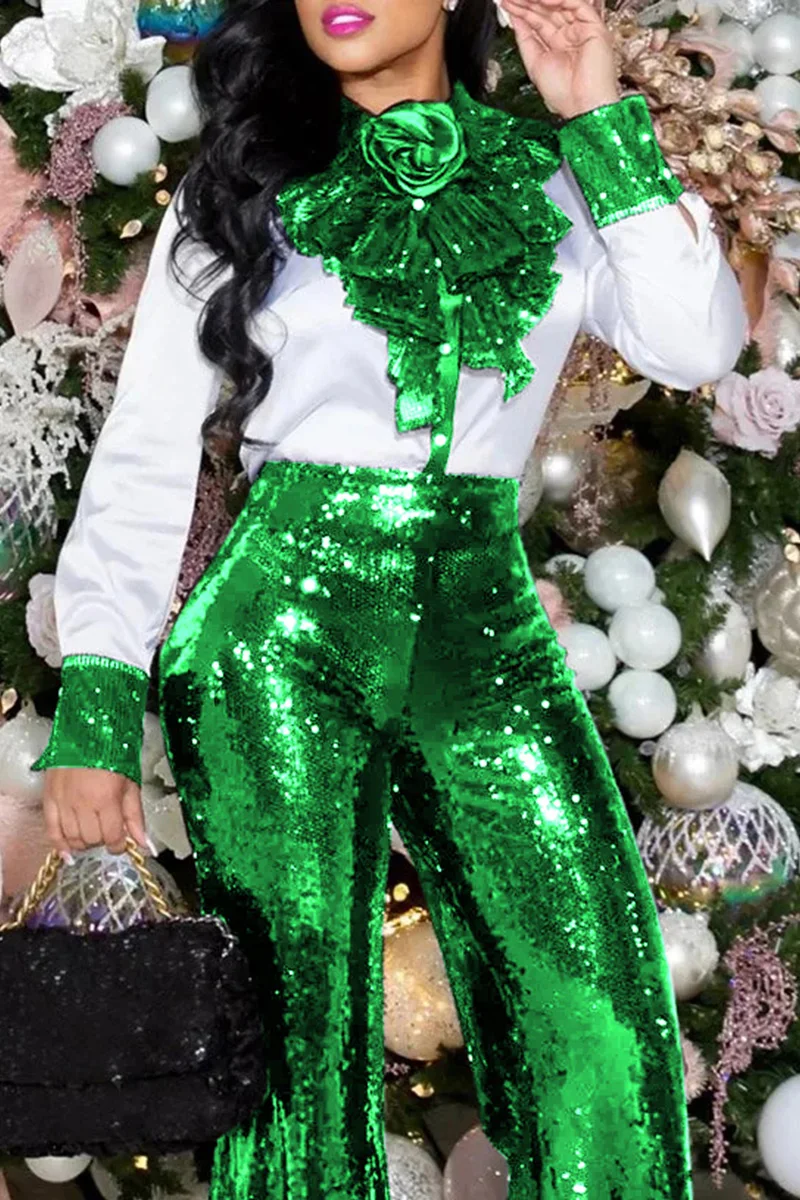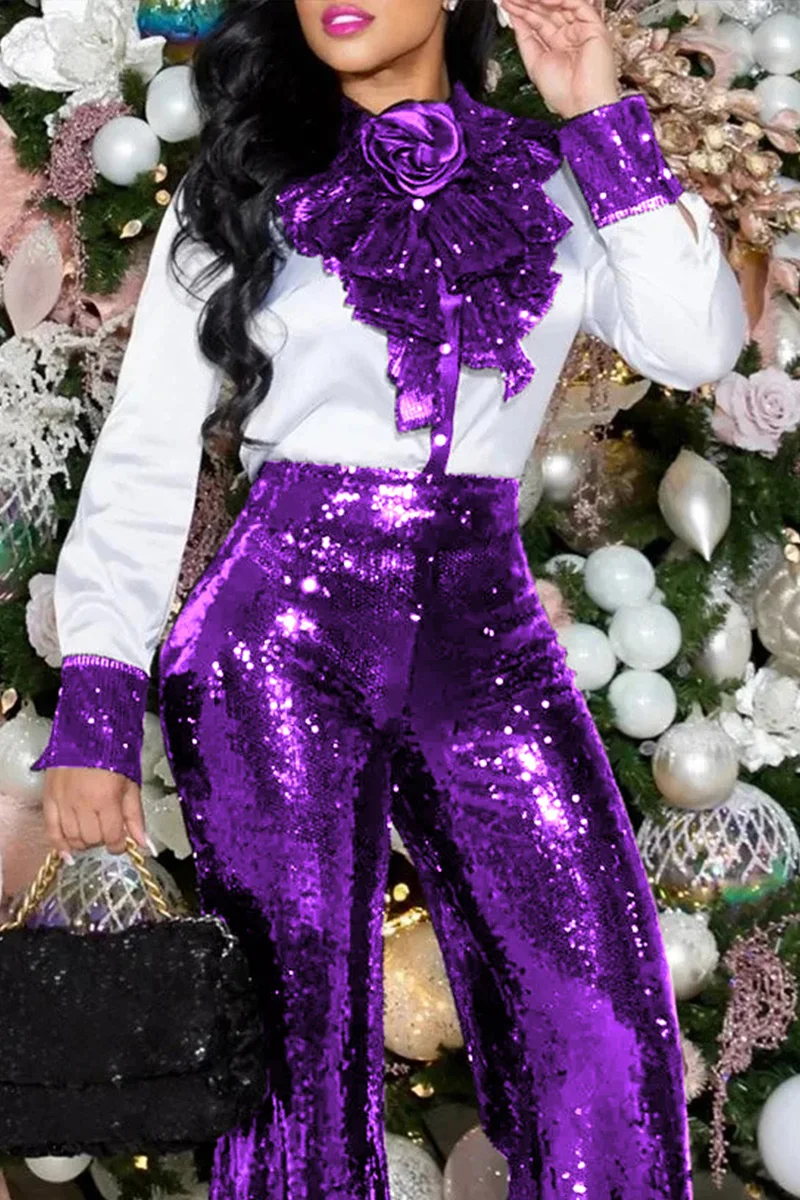 Plus Size White Daily Sequin Ruffle High Collar Long Sleeves Blouses
