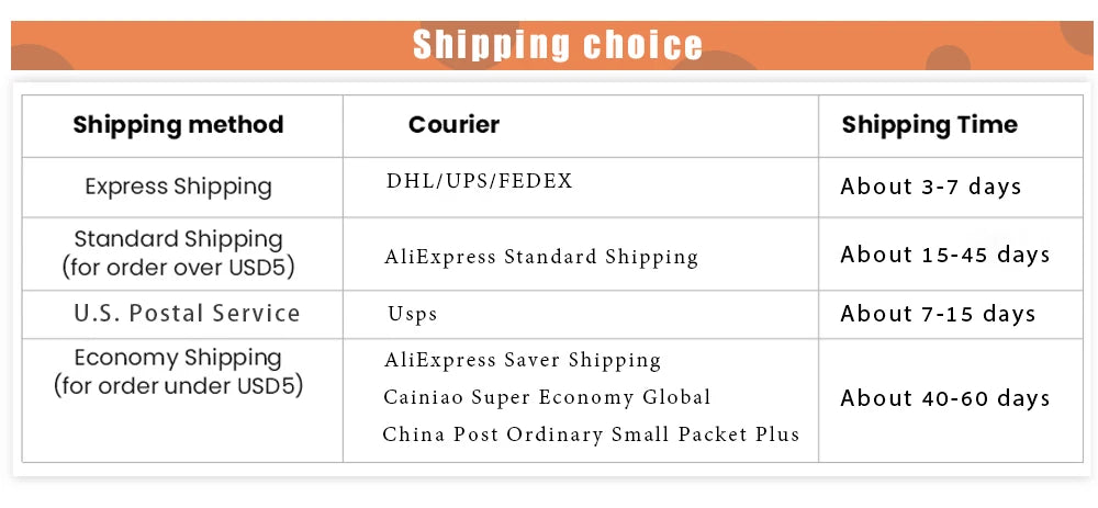 A: If you want to arrive as soon as possible, you can choose FedEx, about 3-7 days to arrive, but you need to pay a logistics fee of 30 US dollars. If your order exceeds $300, we can send you FedEx for free.