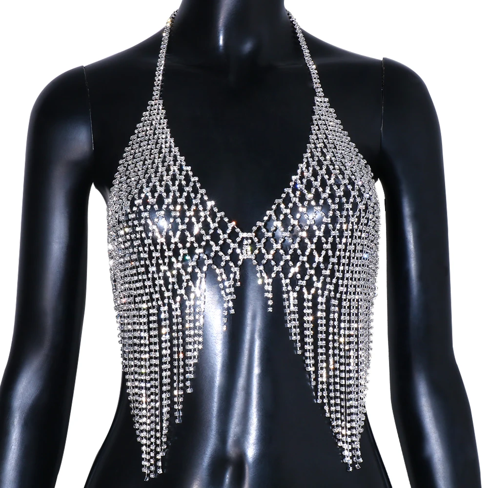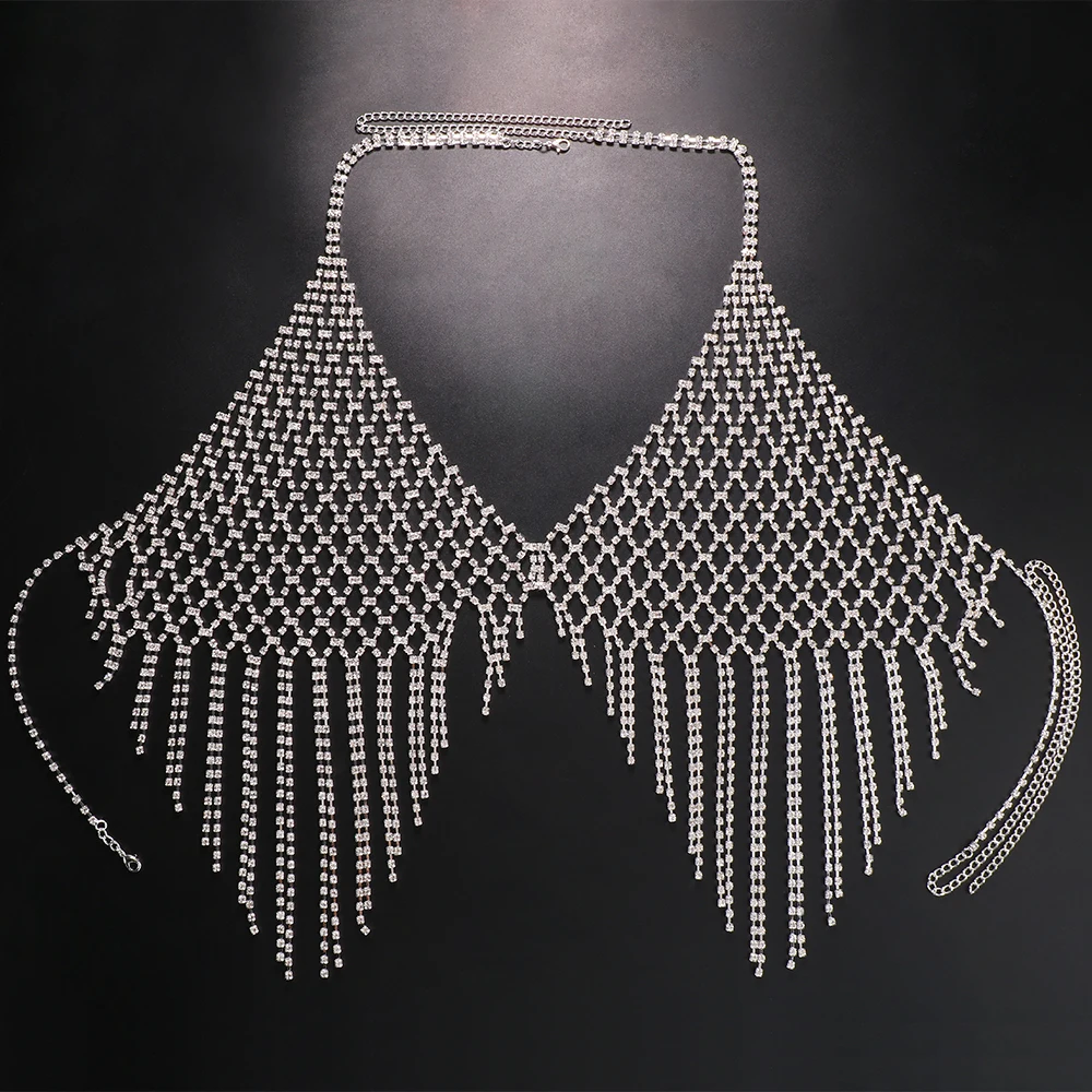 Stonefans Mesh Harness Rhinestone Tassel Bra Chain Nightclub Clothing Hollow Festival Tops Crystal Body Jewelry for Women