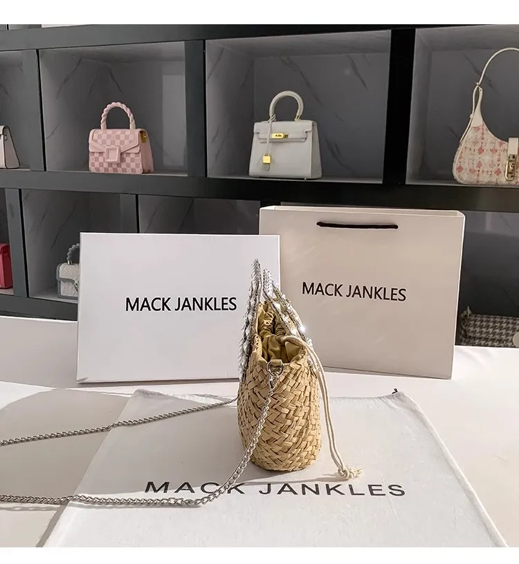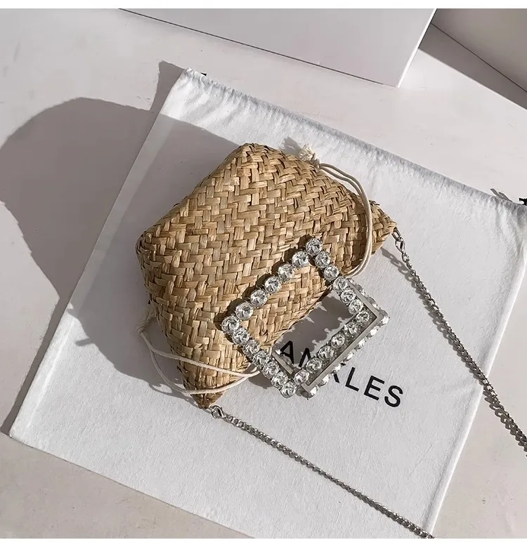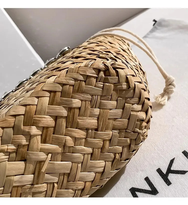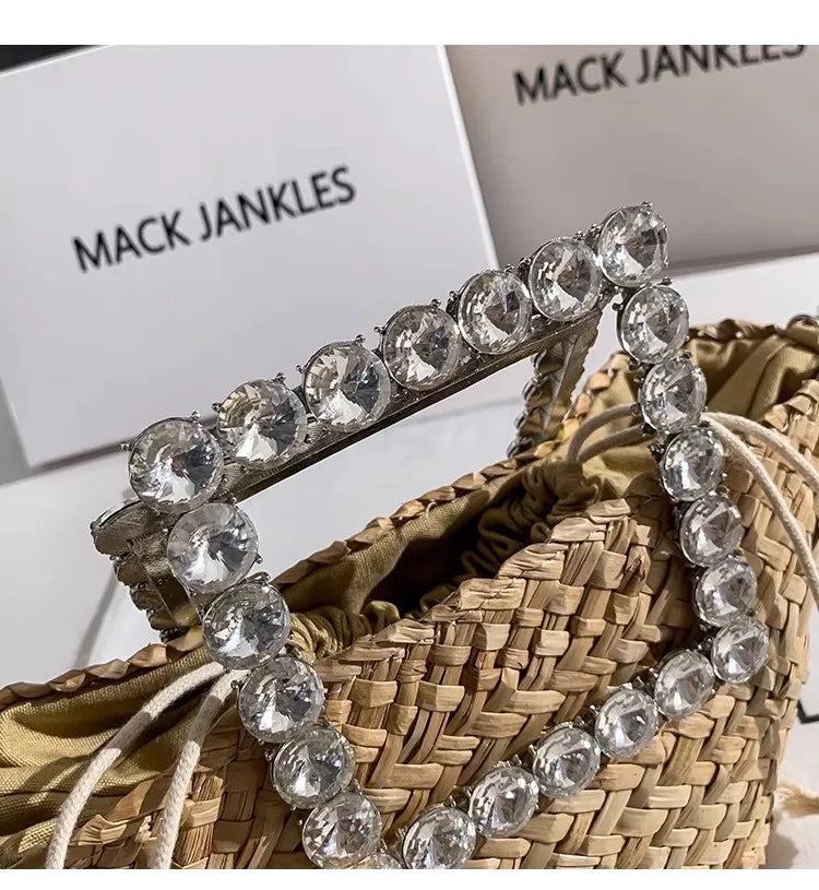 Straw Woven Handmade Bucket Bag Crystal Diamond Metal Handheld Women Handbag Lady Purse Shoulder Crossbody Bag Holiday Beach Bag