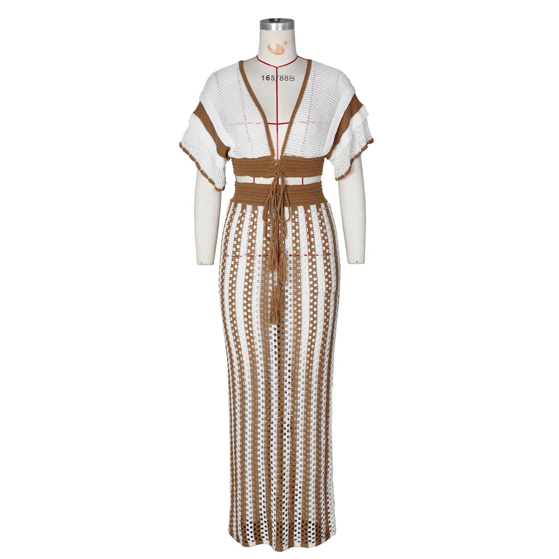 Striped Knitted Two Piece Set Women Outfit Y2K Clothes Clubwear Party Hollow Out V-neck Crop Top and Long Skirt Maxi Dress Sets