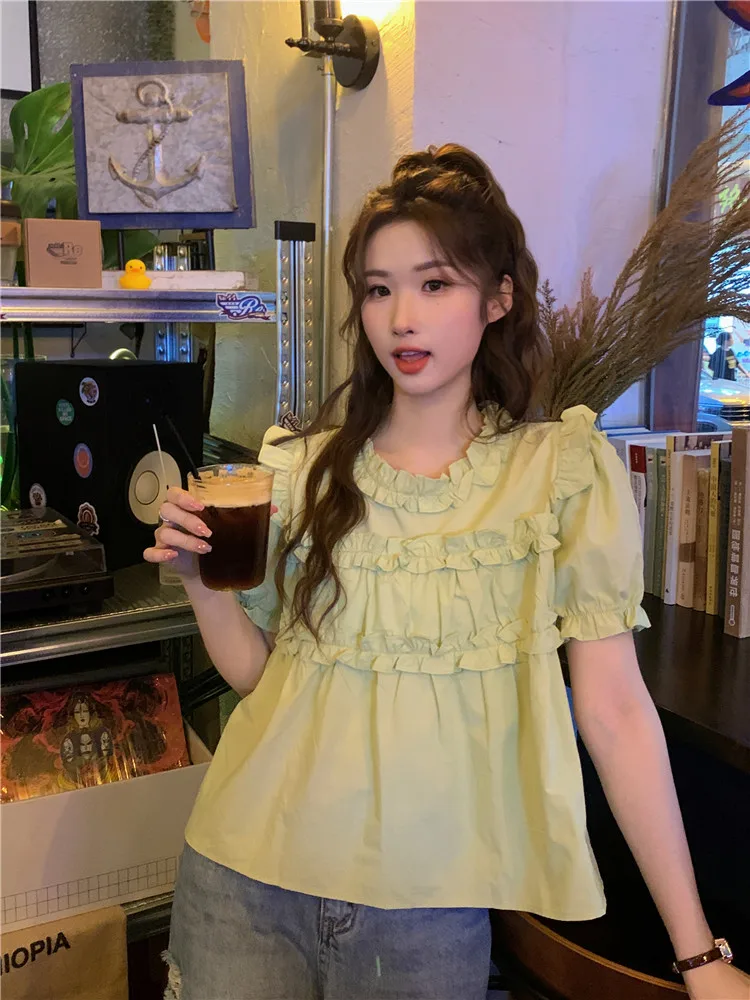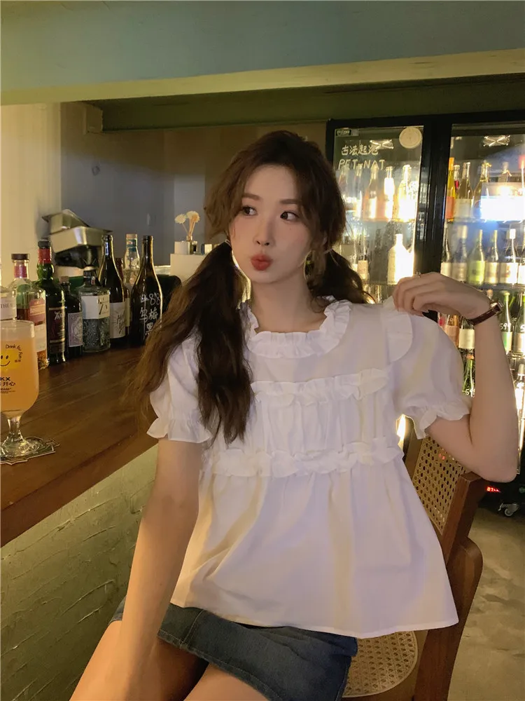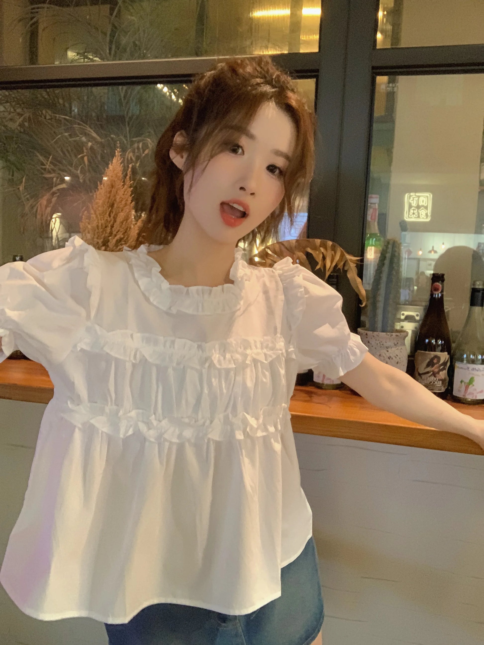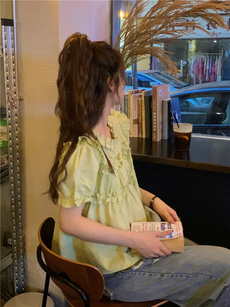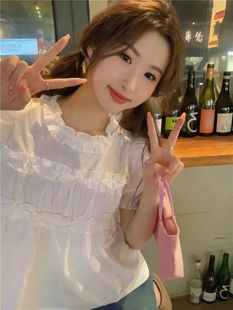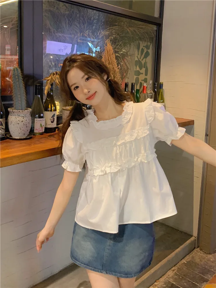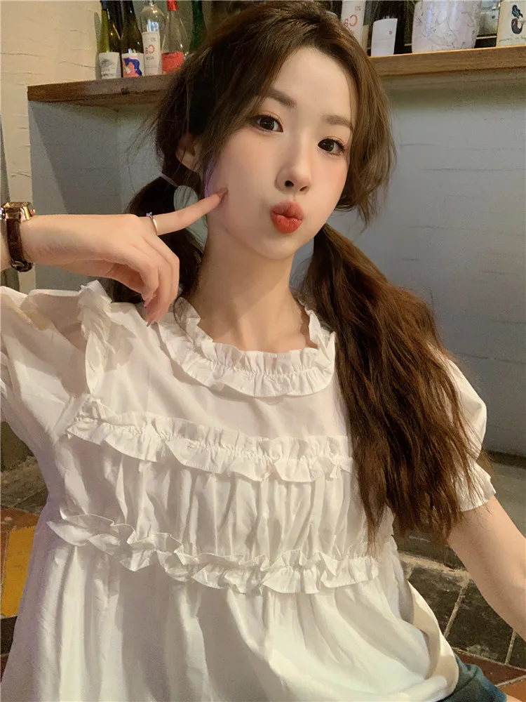 Summer petite wooden ear edge patchwork short sleeved French top with loose design, niche shirt