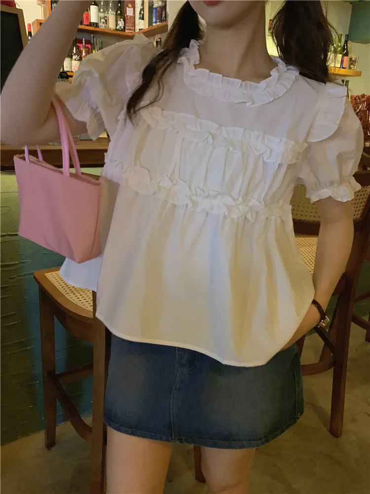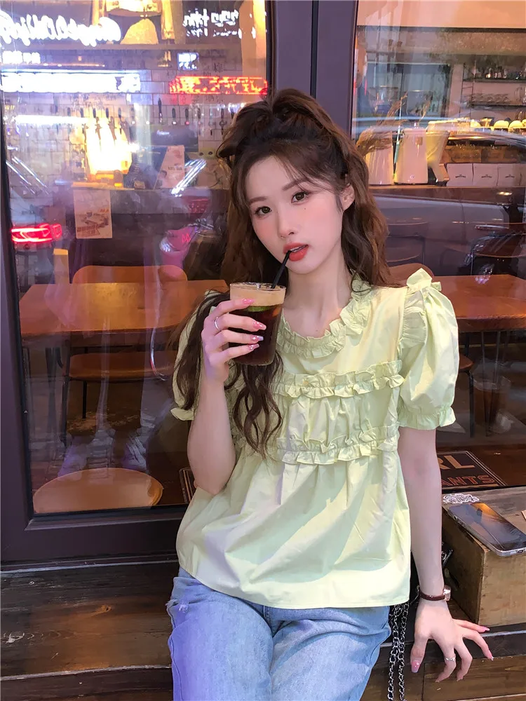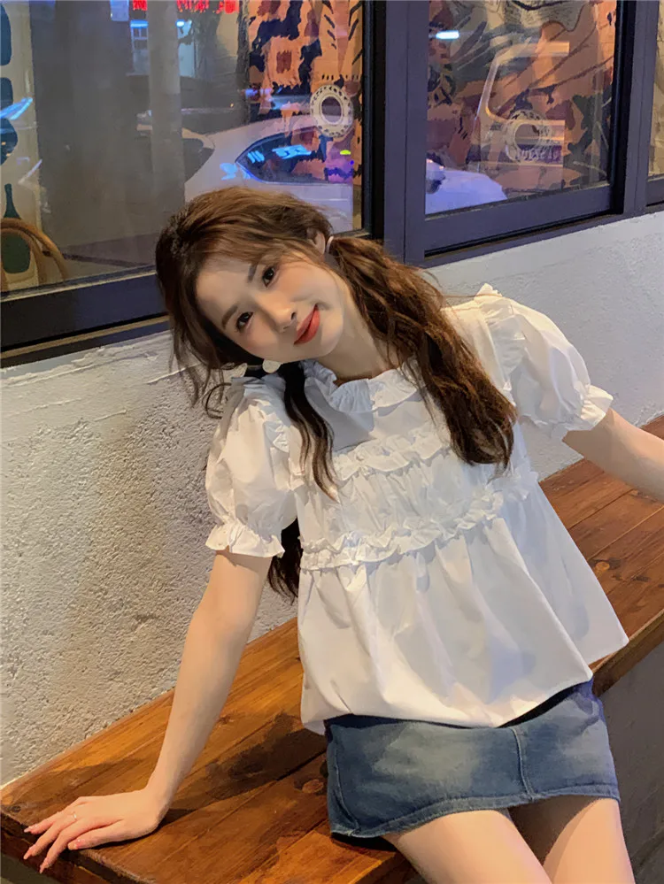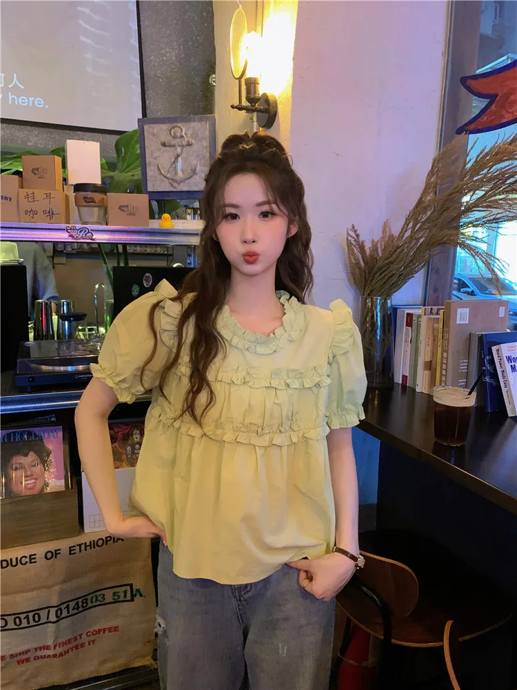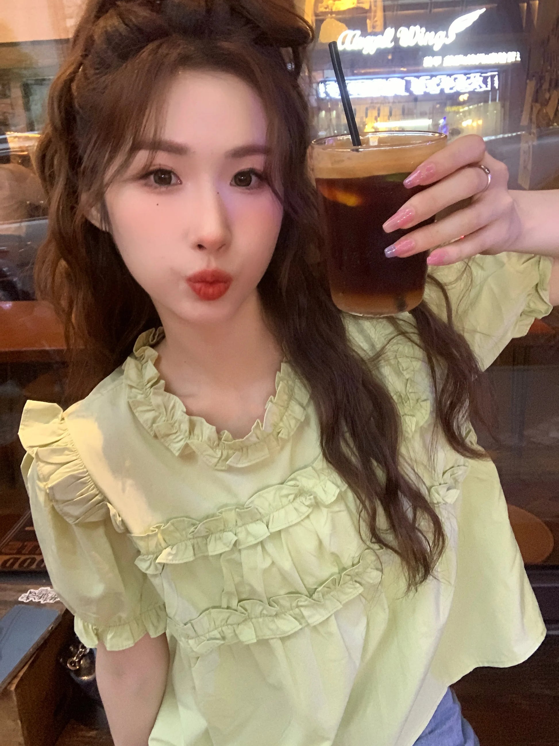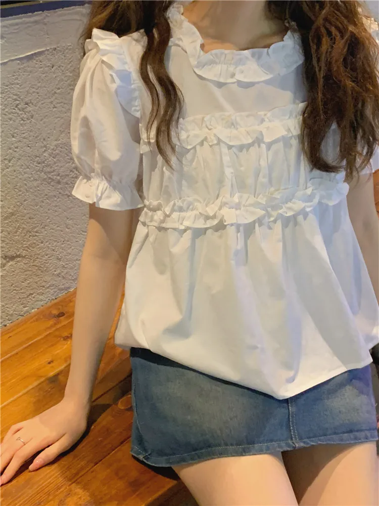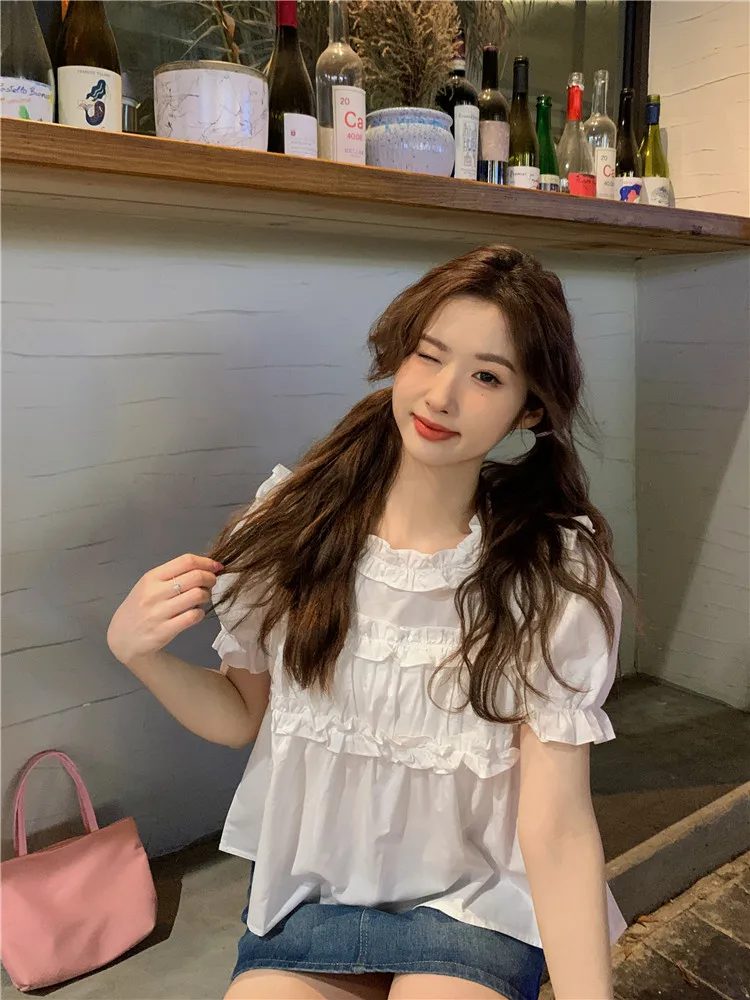 Summer petite wooden ear edge patchwork short sleeved French top with loose design, niche shirt