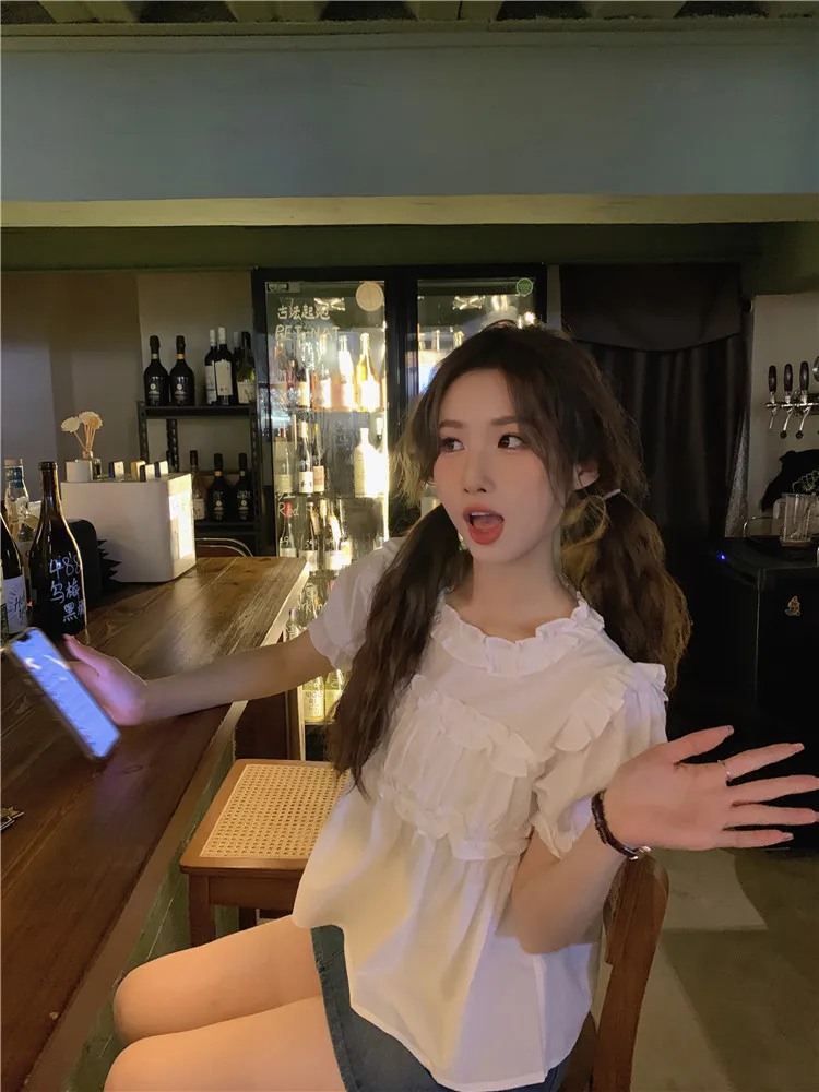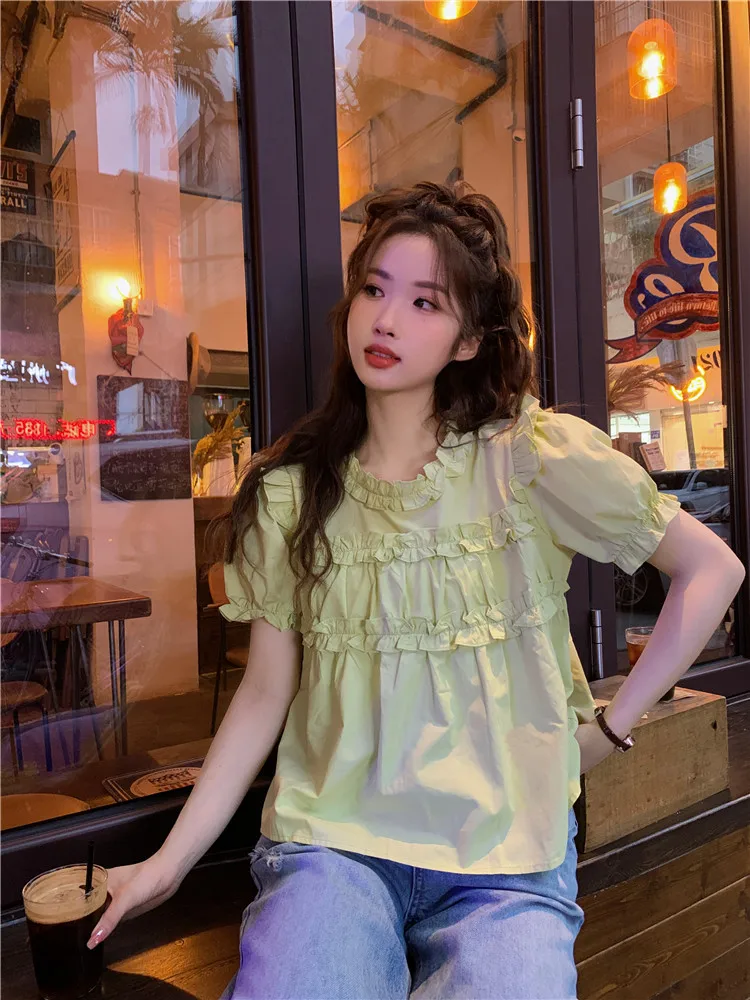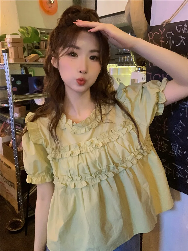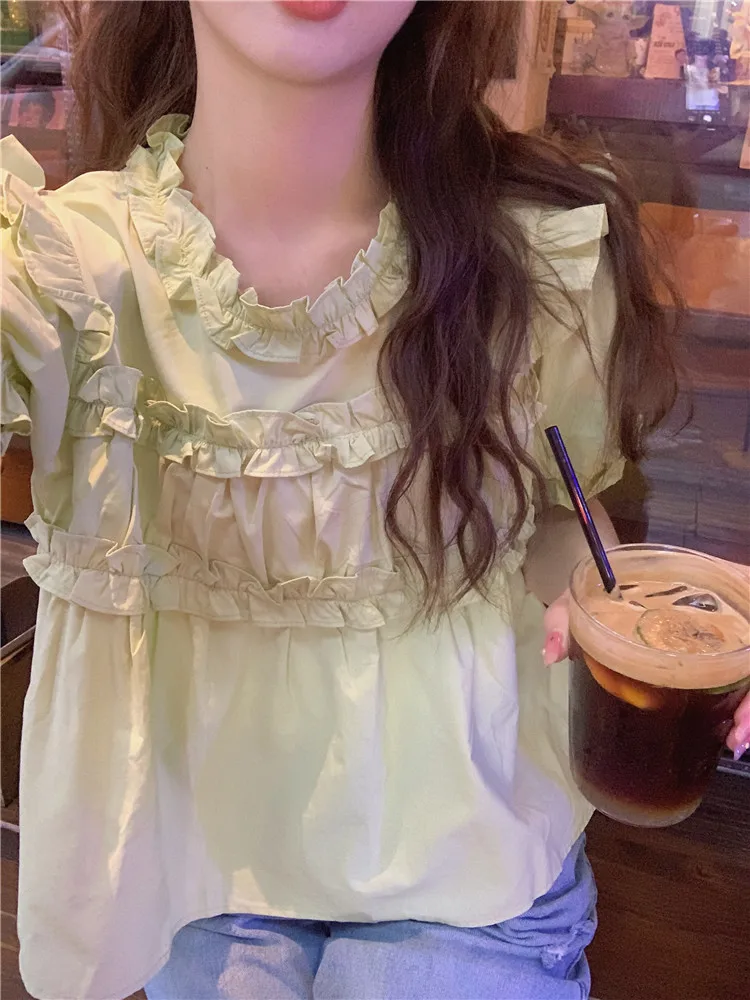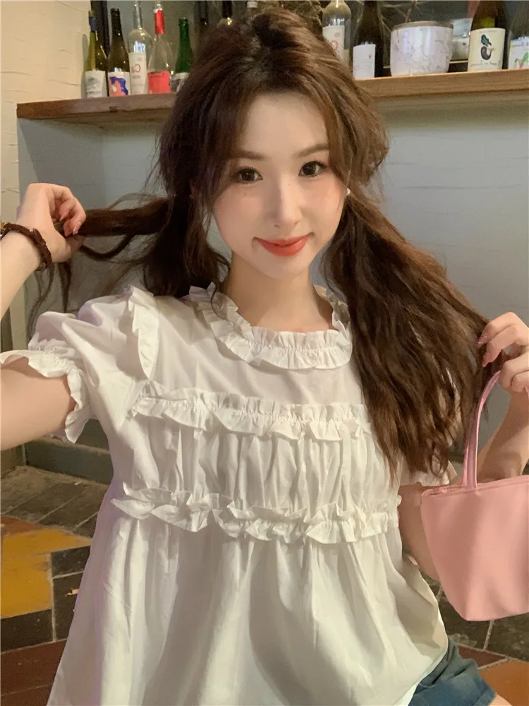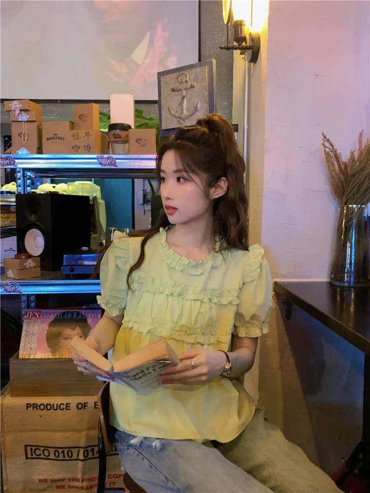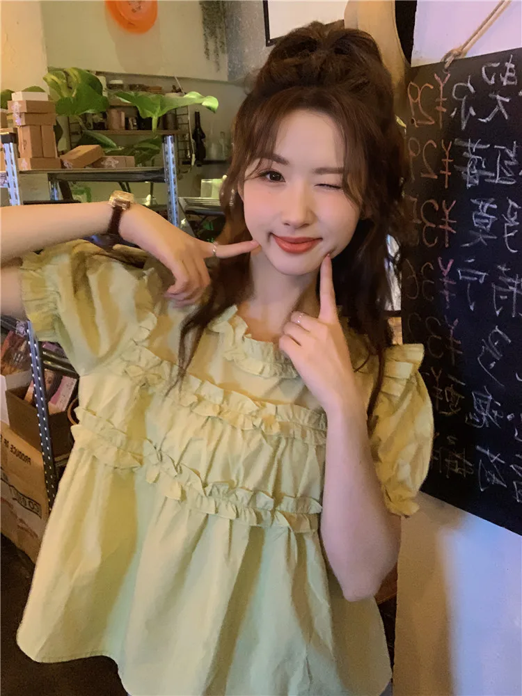 Summer petite wooden ear edge patchwork short sleeved French top with loose design, niche shirt