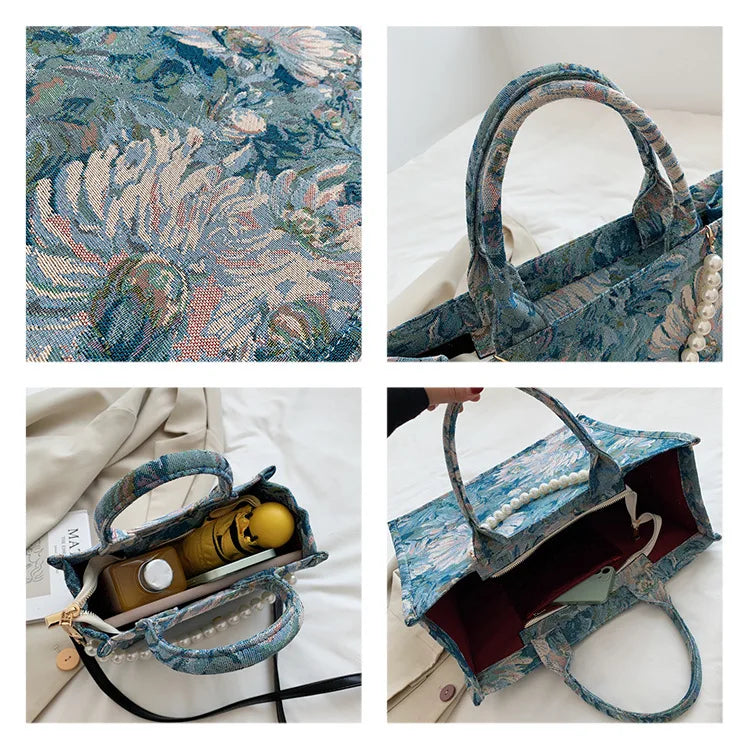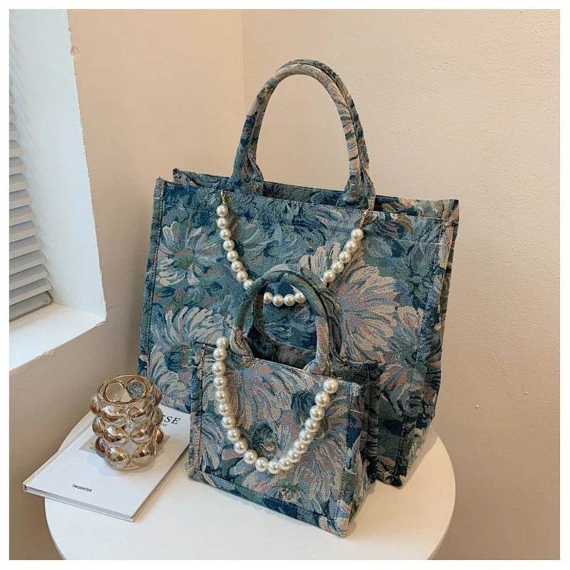 Unusual Design Denim Handbags for Women New Luxury Woman Canvas Tote Bag Pearl Bead Decorated Diagonal Cross bag Femme