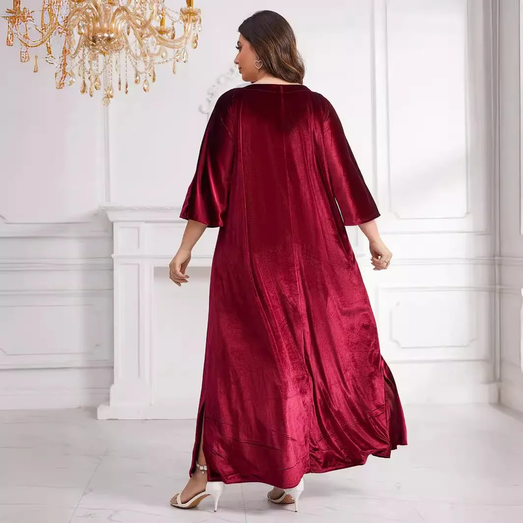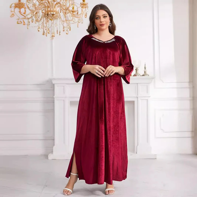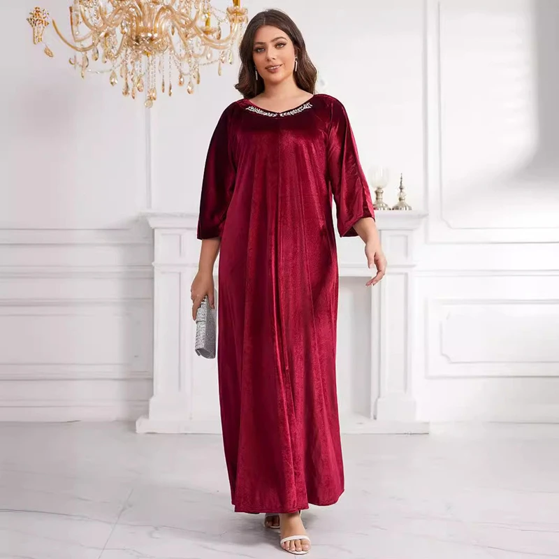 Vintage Loose Muslim Robe Fashion Casual Solid Velvet Red Long Dresses African Women Party Club Maxi Dress Islamic Clothing
