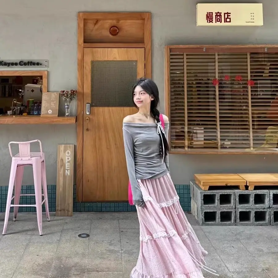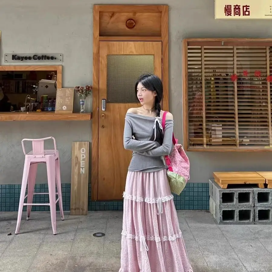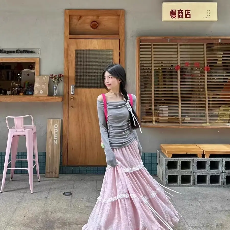 Wedbleser Fashion 2025 Sweet Ballet Style French Petite Outfit Slim Fit Gray Top Pink High Waisted Long Skirt Two-piece Set clothes