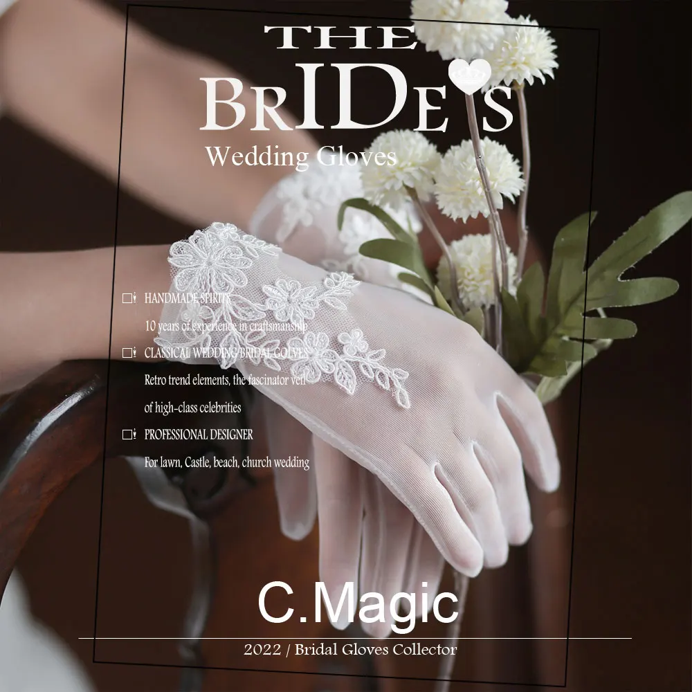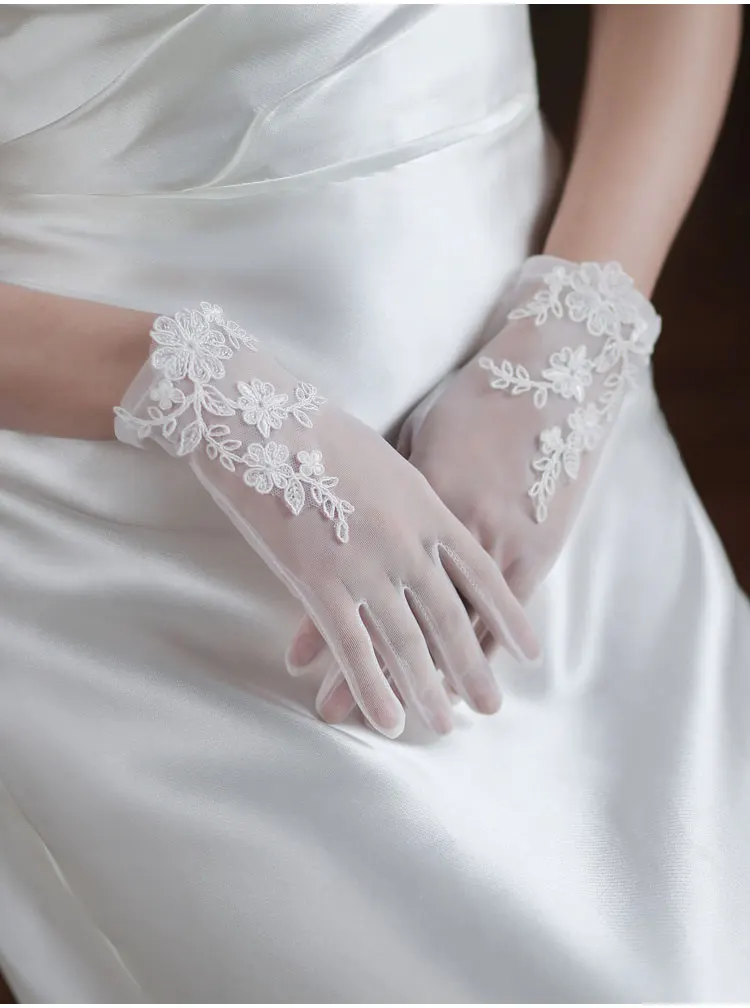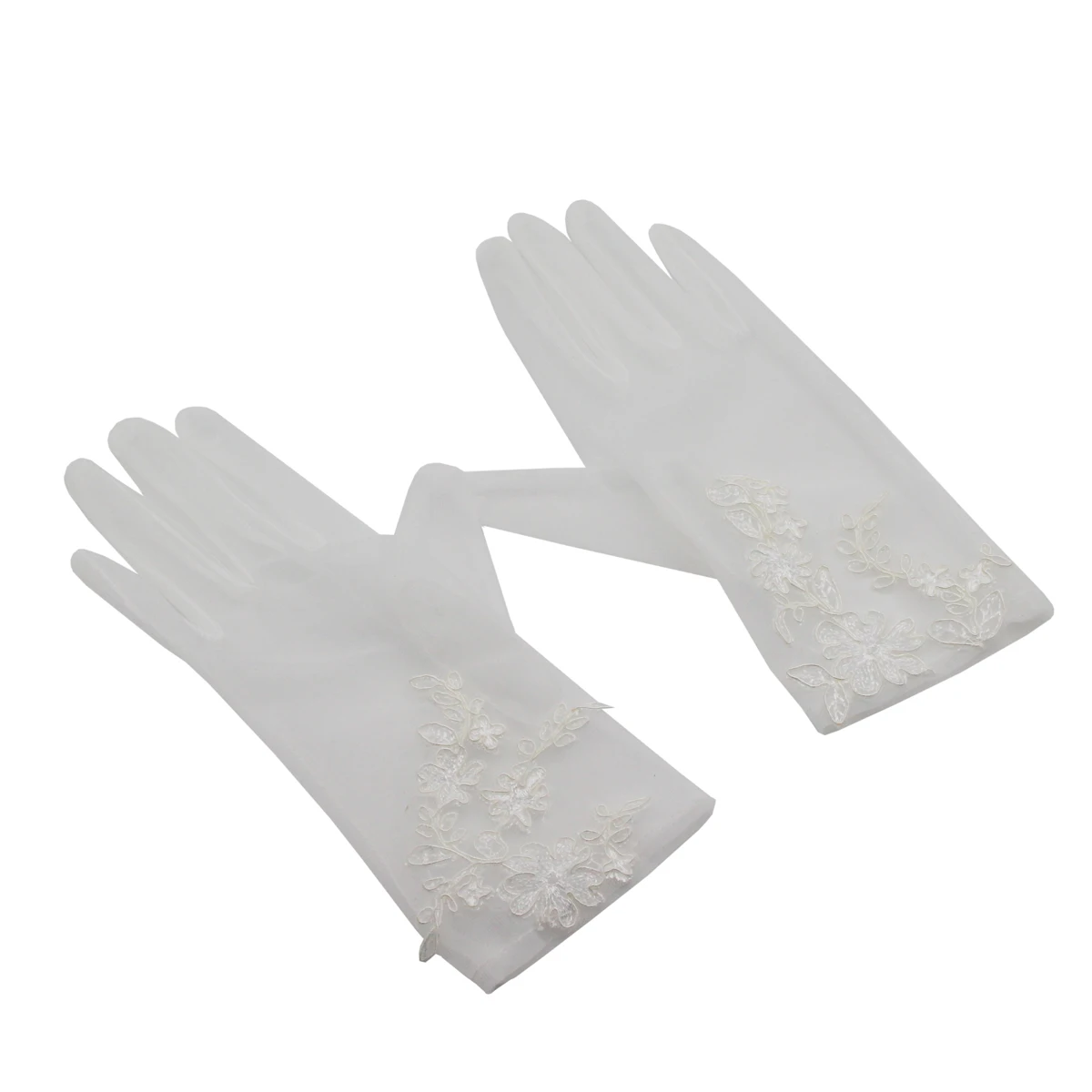WG060 Wedding Bridal White Gloves Handmade Soft Tulle Lace Appliqued Short Brides Gloves Women Pageant Prom Perform Handschuh