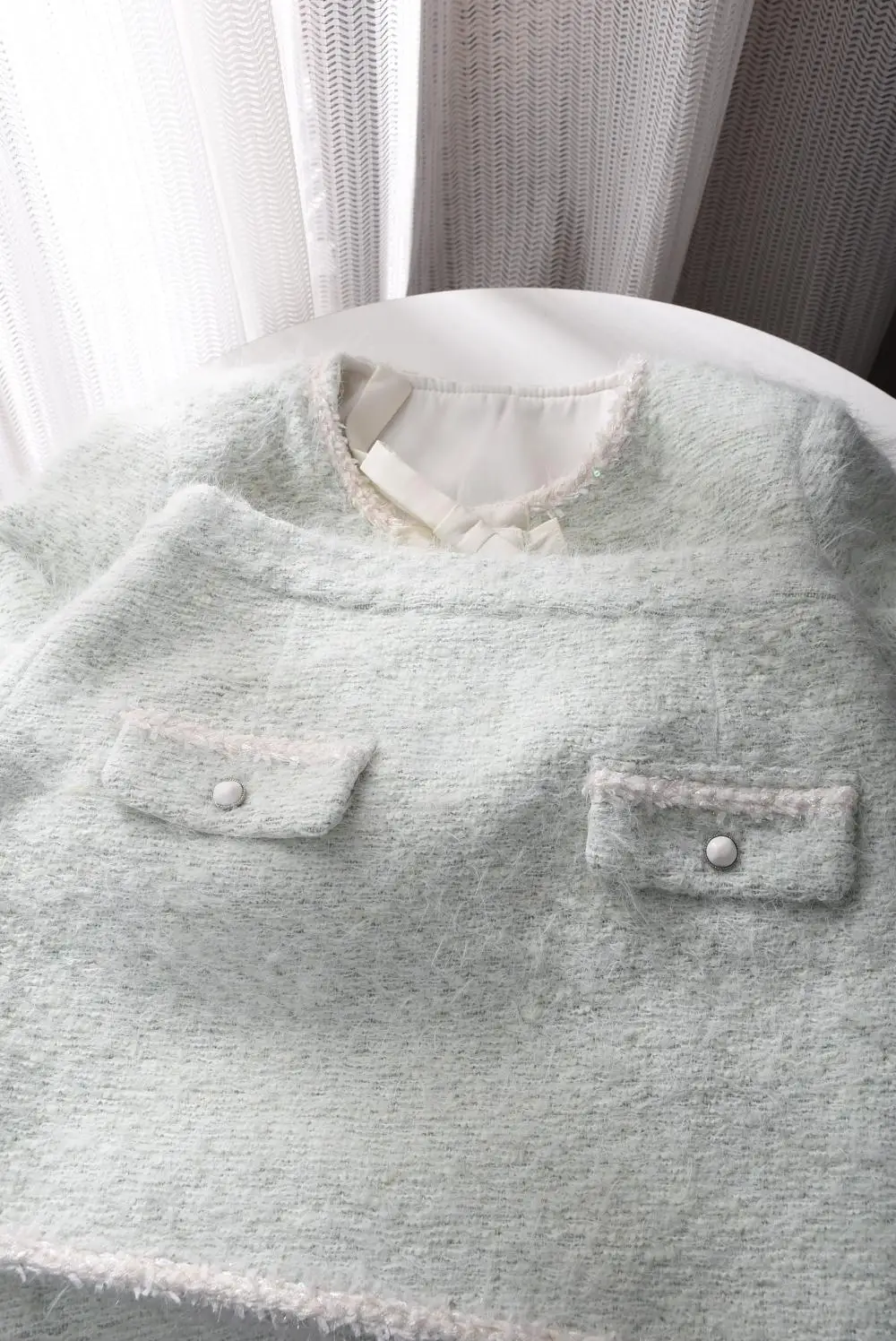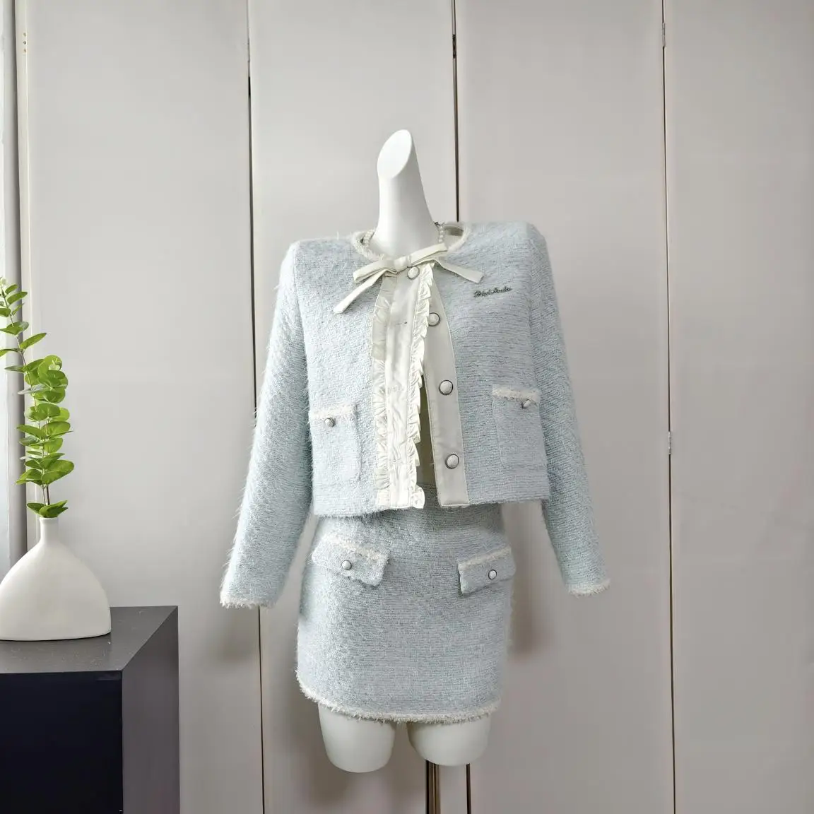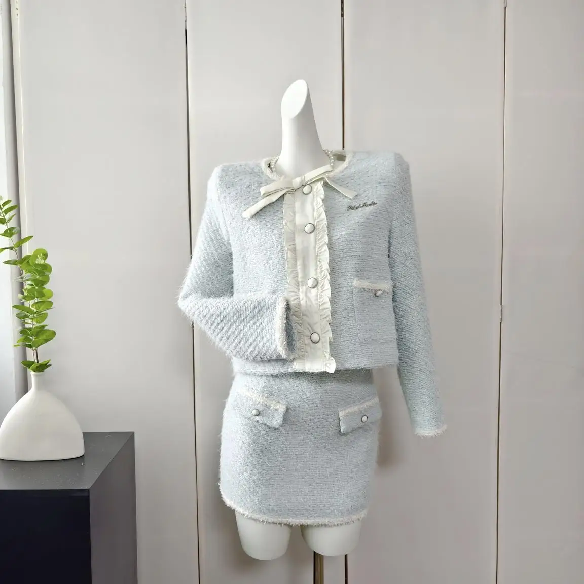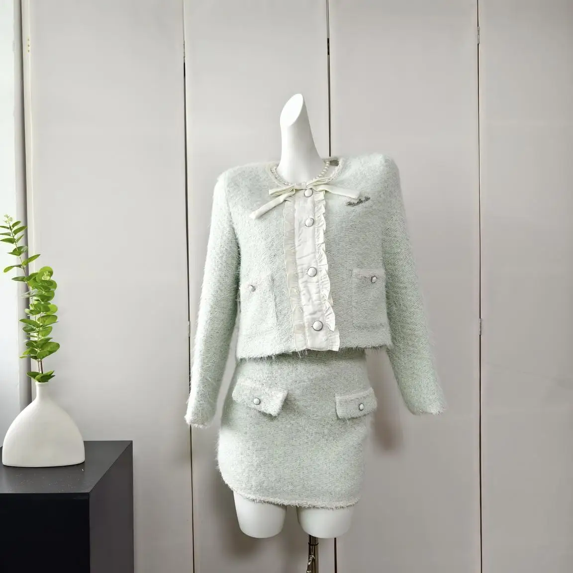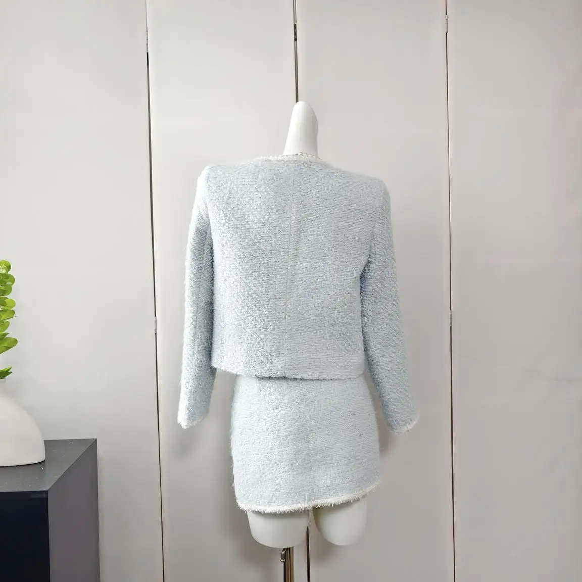 Frauen Elegante Tweed Luxus Anzug Strass Jacke Mantel Und Rock Zwei Stück Set Outfit Winter Pailletten Jacquard Party Kleidung 2023