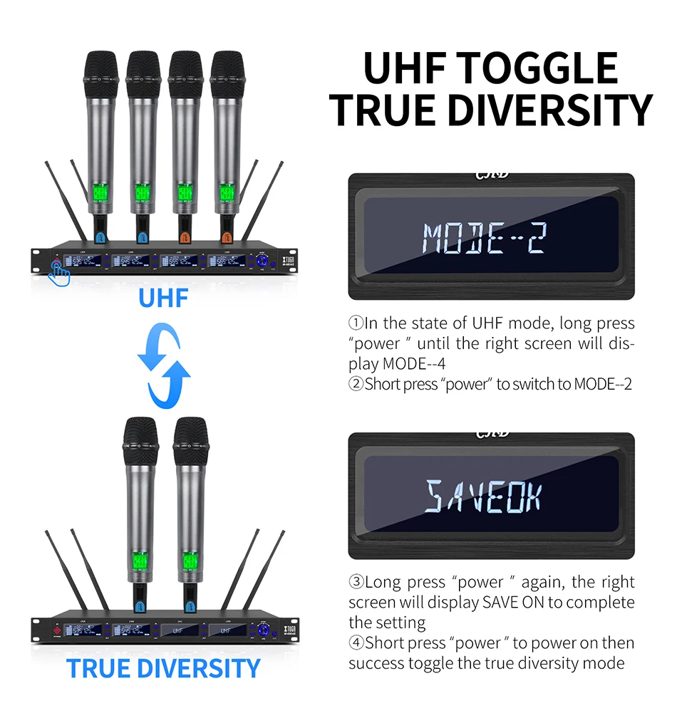 | 2. Dual-Modus -Umschaltfunktion: UHF-Modus (vier Mikrofone) Diversity-Systemmodus (2 Mikrofone) |
