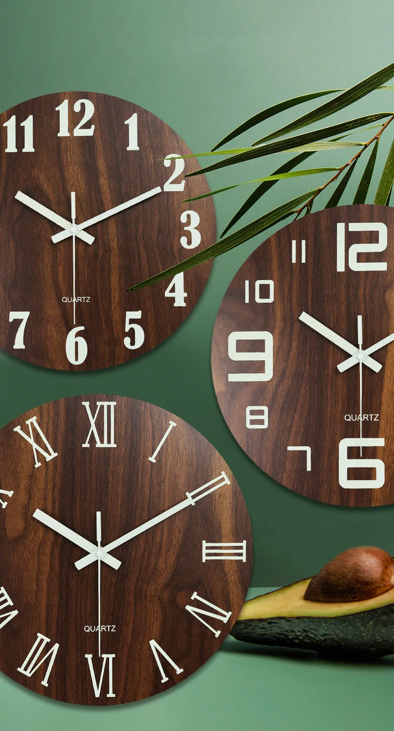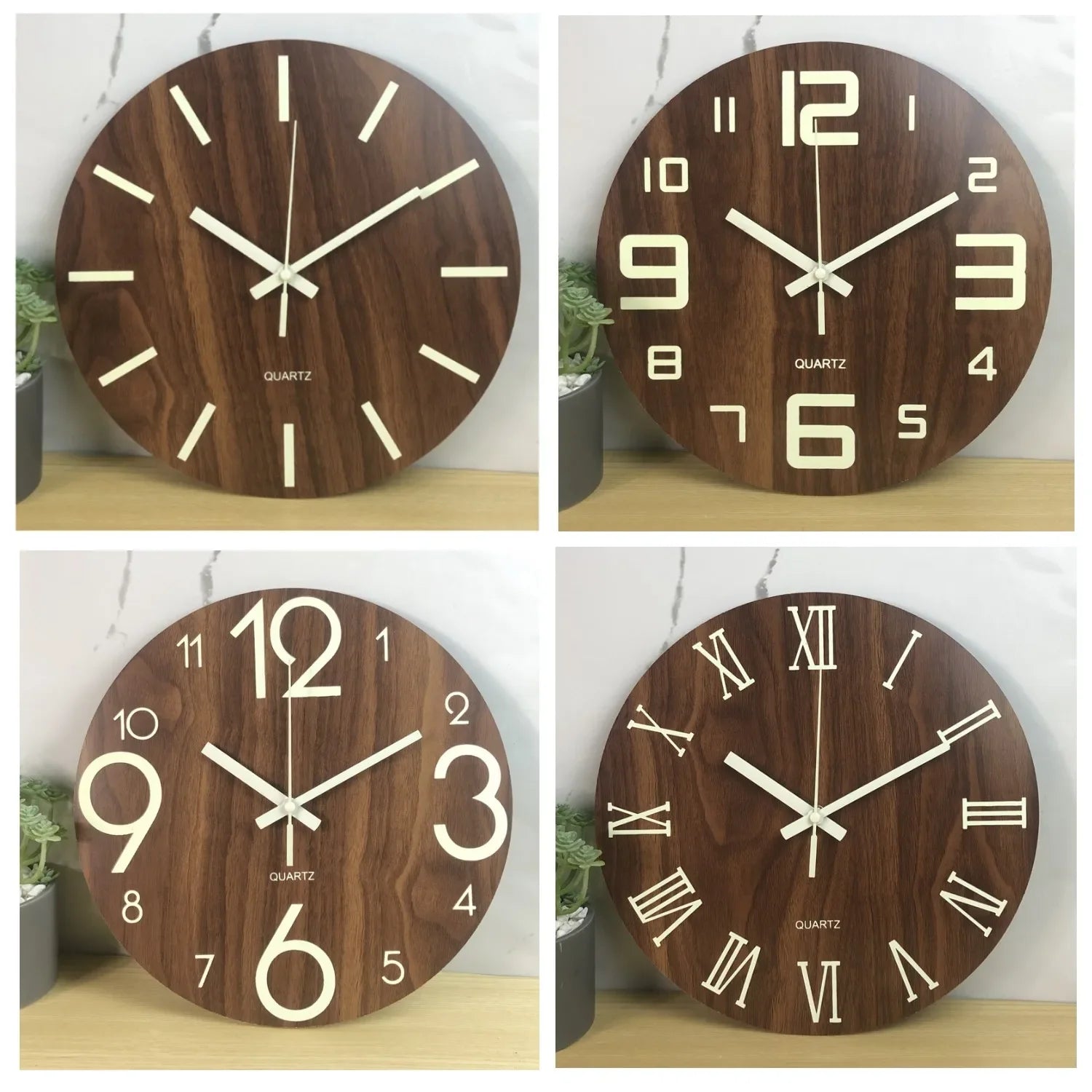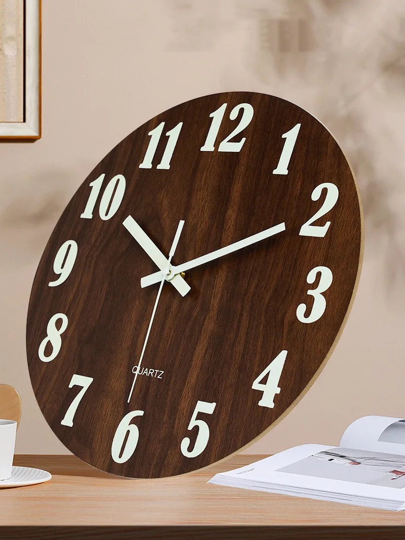 12 Inch Wall Clock Luminous Wood Night Glow Visible Nordic Silent Clock Decoration with Night Light for Bedroom Living Room Home