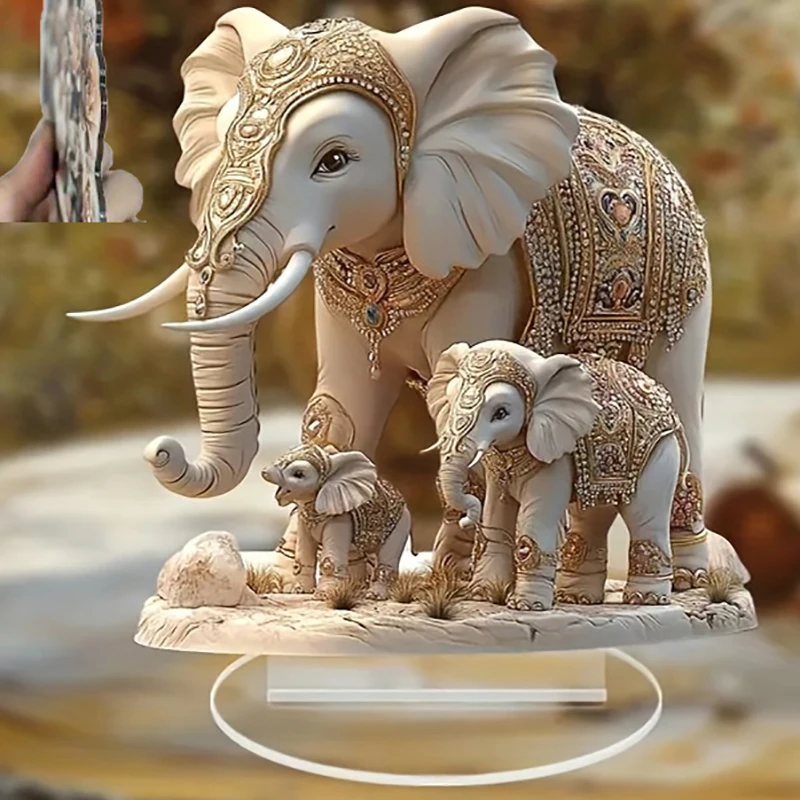 1PC White Elephant Family 2D Flat Acrylic Figurine Home Office Cafe Room Studio Display Case Table Ornament Desktop Decor Kit