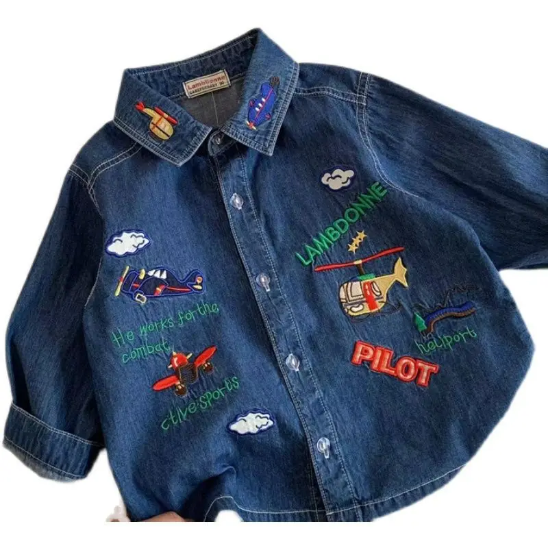 New Kids baby denim shirt cartoon letters embroidery long sleeve Tops Boys loose casual shirt Coat kids