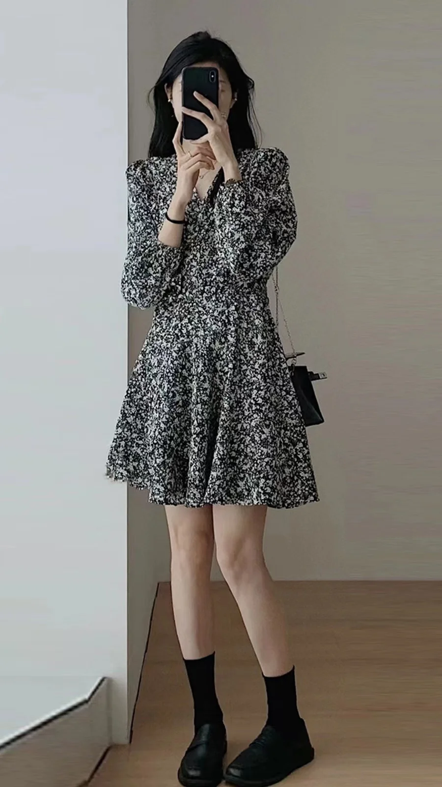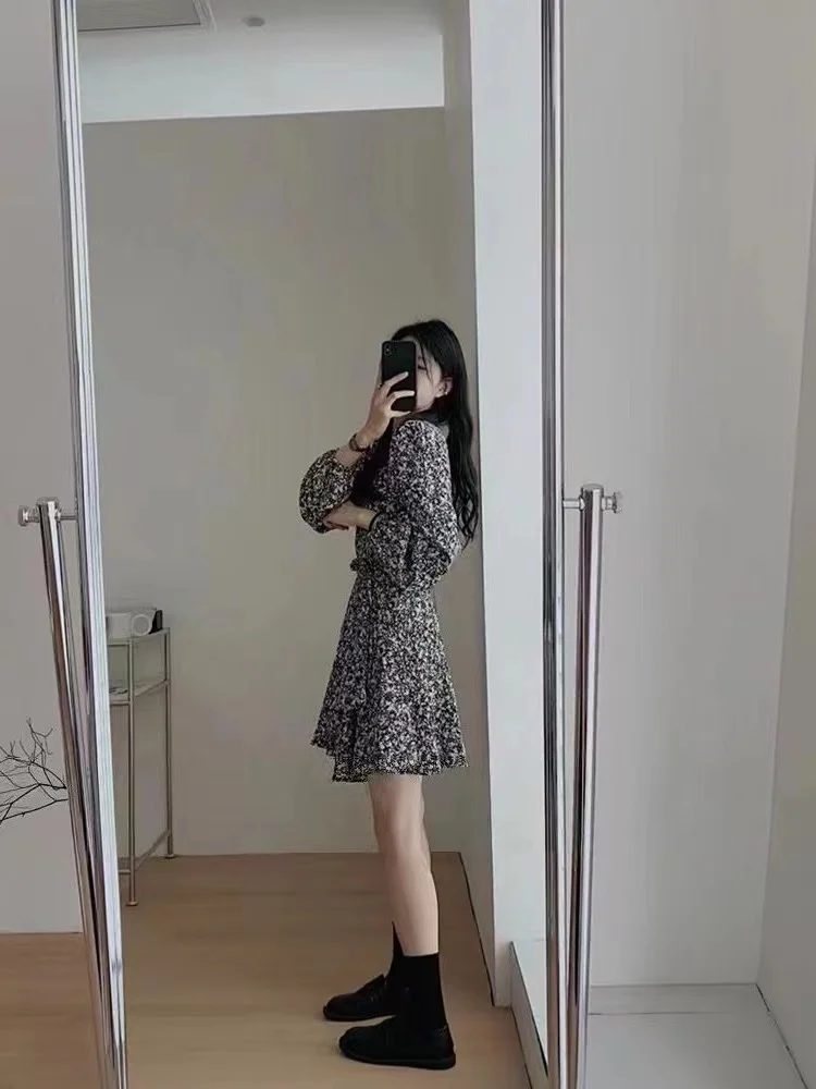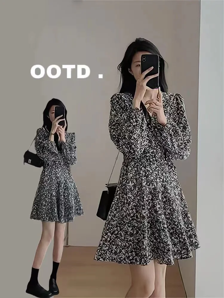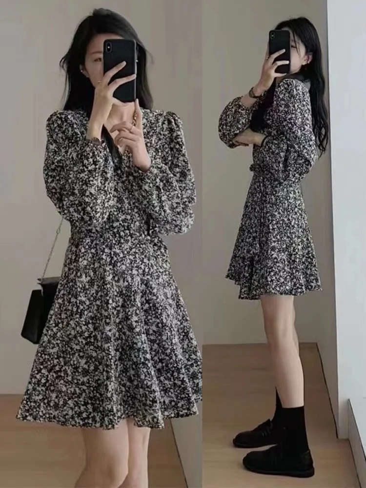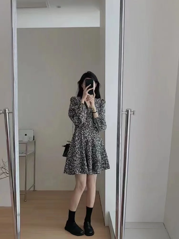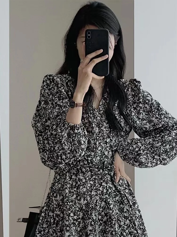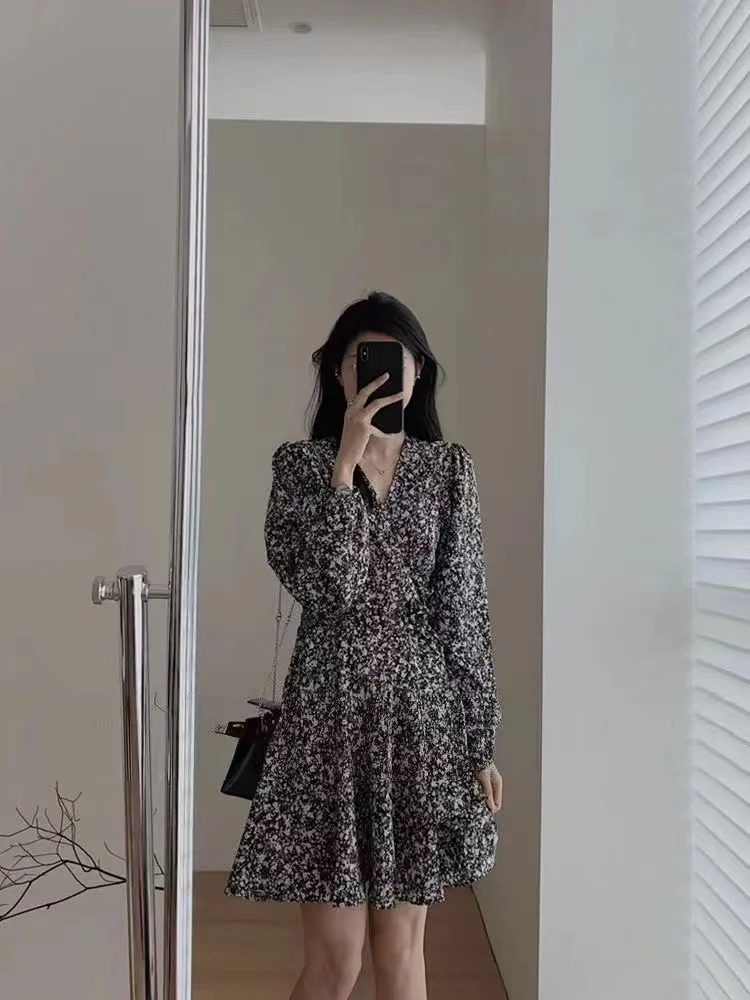 2024 Summer Autumn Clothes Large Size Women's Clothing Fashion Short Dresses Petite V-neck Floral Long Sleeve Black Dresses Traf