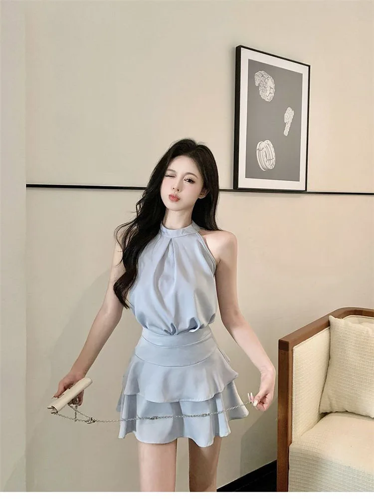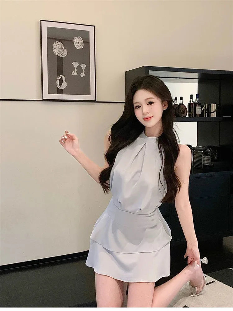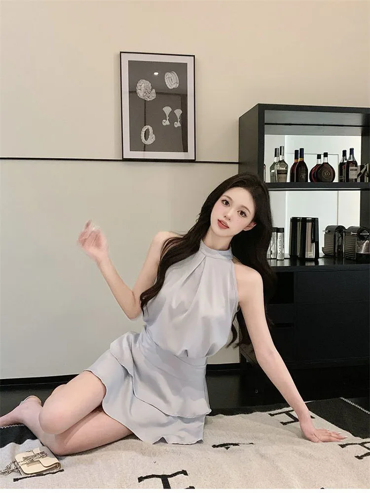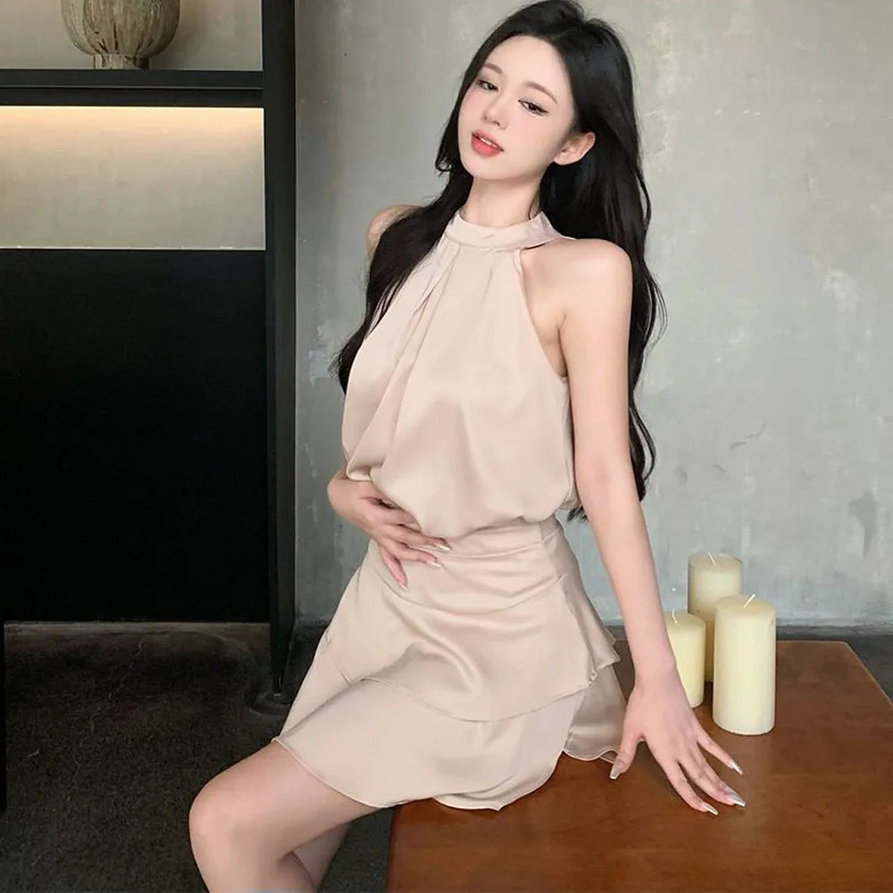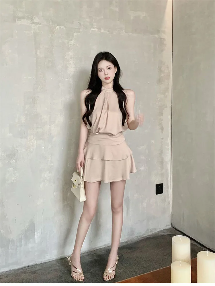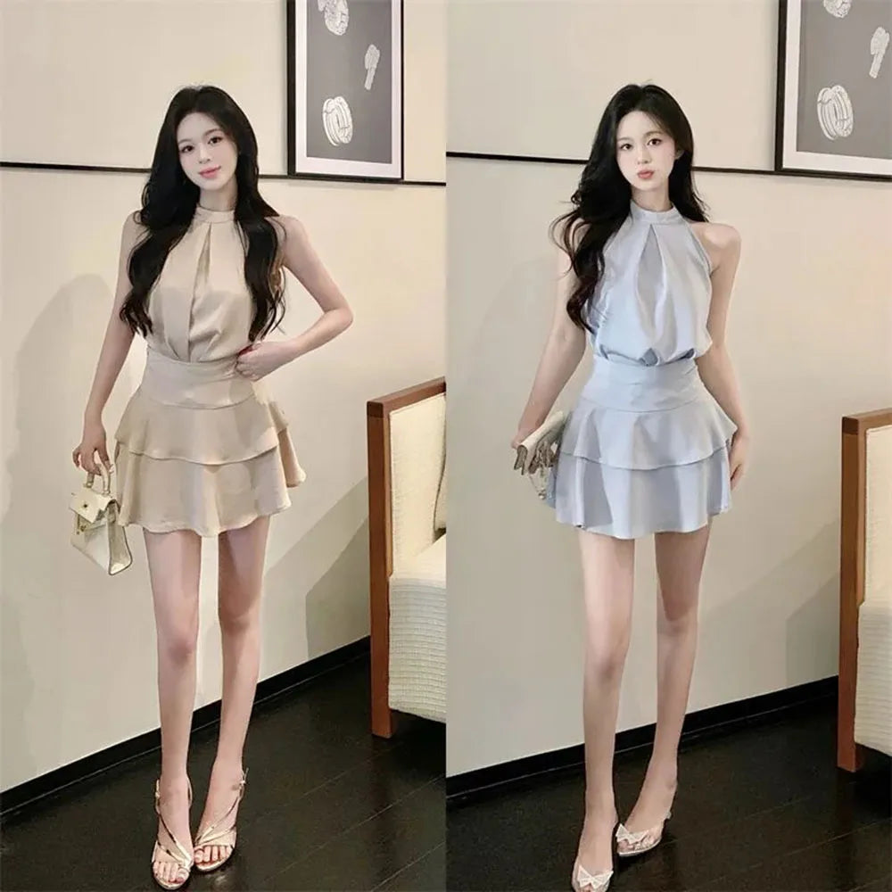 2024 Summer Satin 2 Piece Skirt Set Women Korean Sleeveless Y2k Crop Tops Shirt + Ruffles Mini Skirt Female Elegant Women's Sets