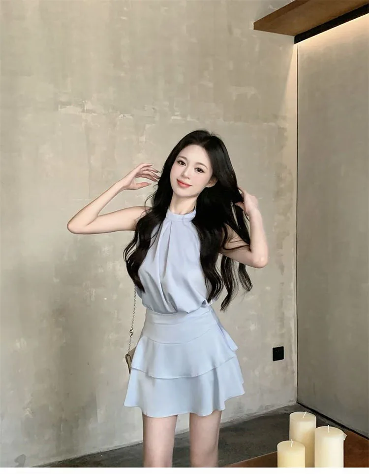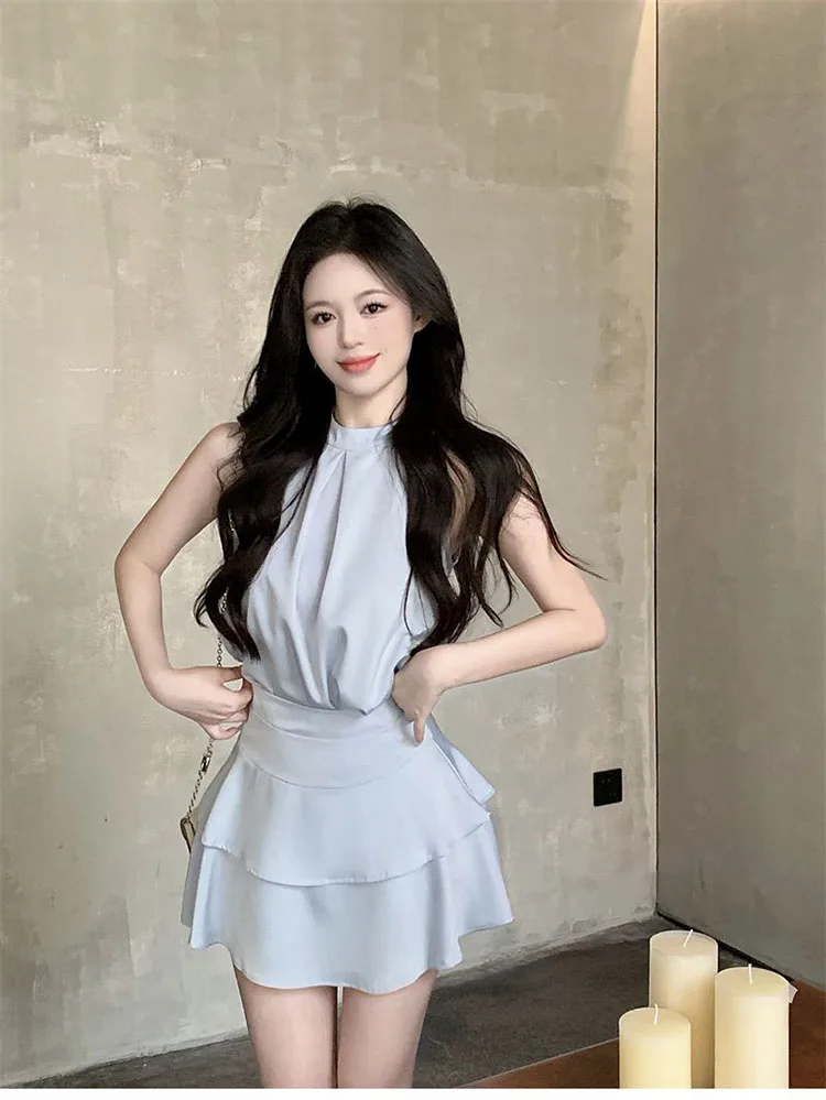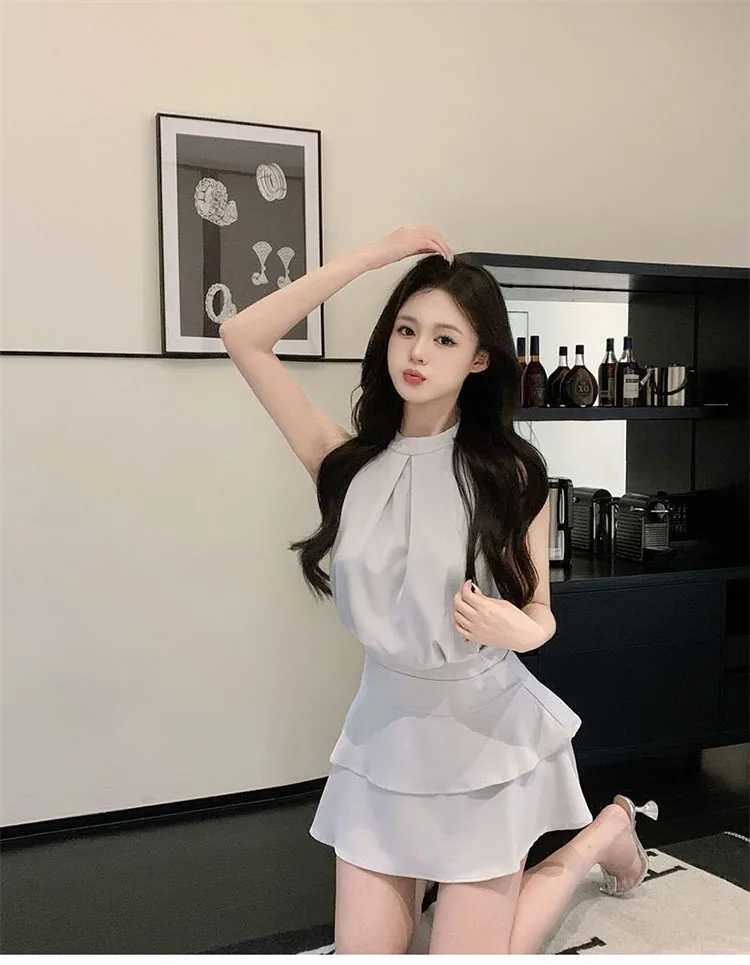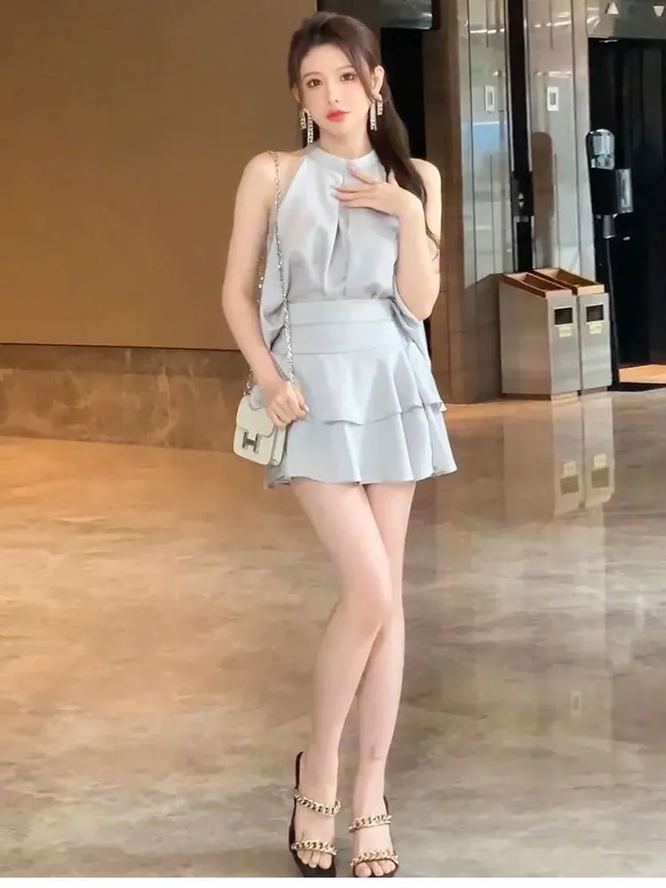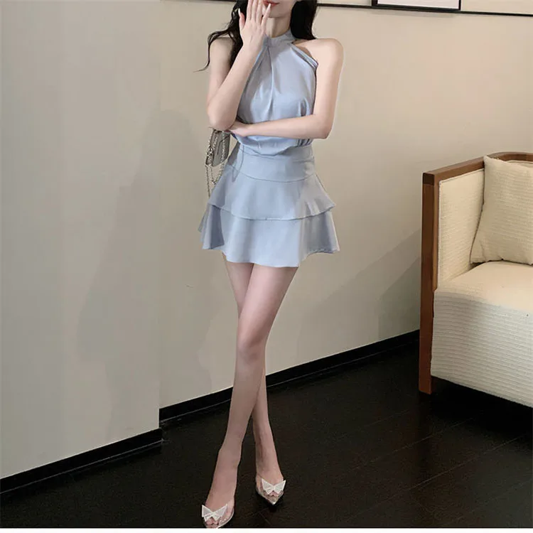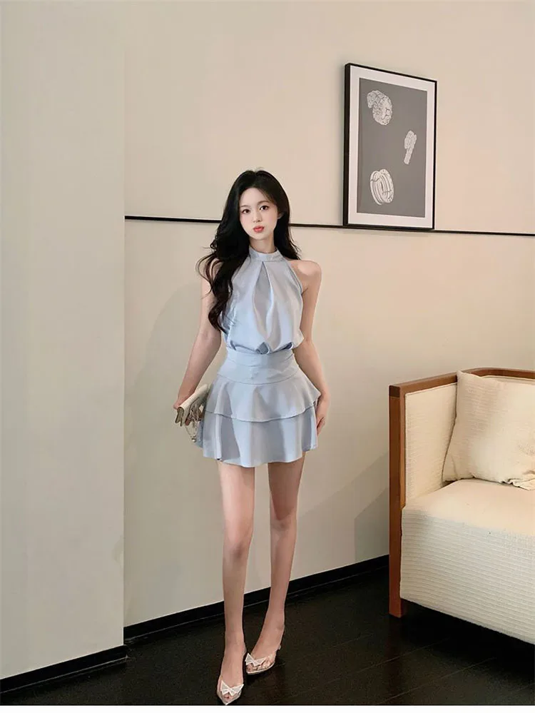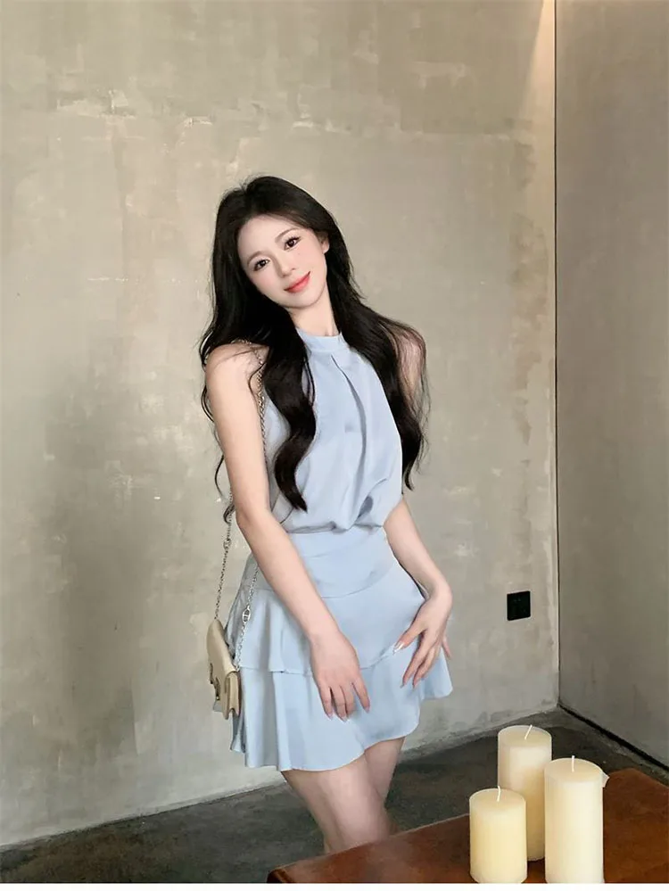 2024 Summer Satin 2 Piece Skirt Set Women Korean Sleeveless Y2k Crop Tops Shirt + Ruffles Mini Skirt Female Elegant Women's Sets
