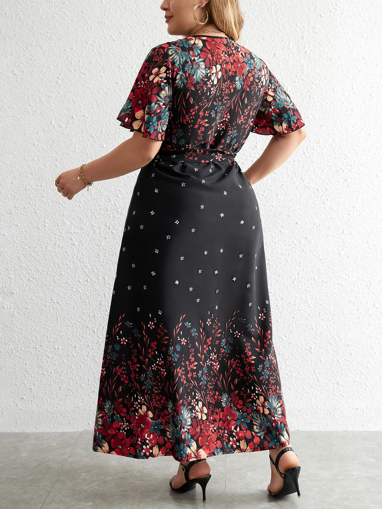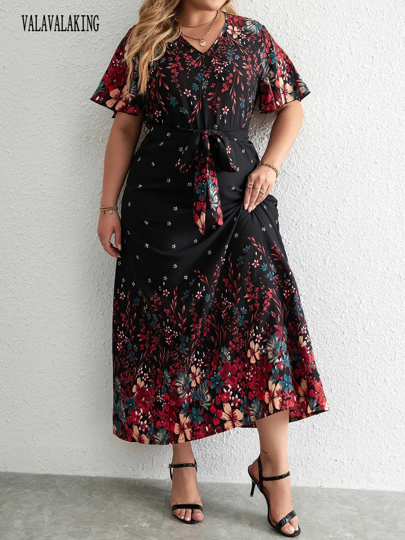 2025 Casual V-Neck Floral Print Plus Size Dress Women Ruffle Short Sleeve Large Midi Dress Lady Chubby Curvy Lace-Up Long Dress