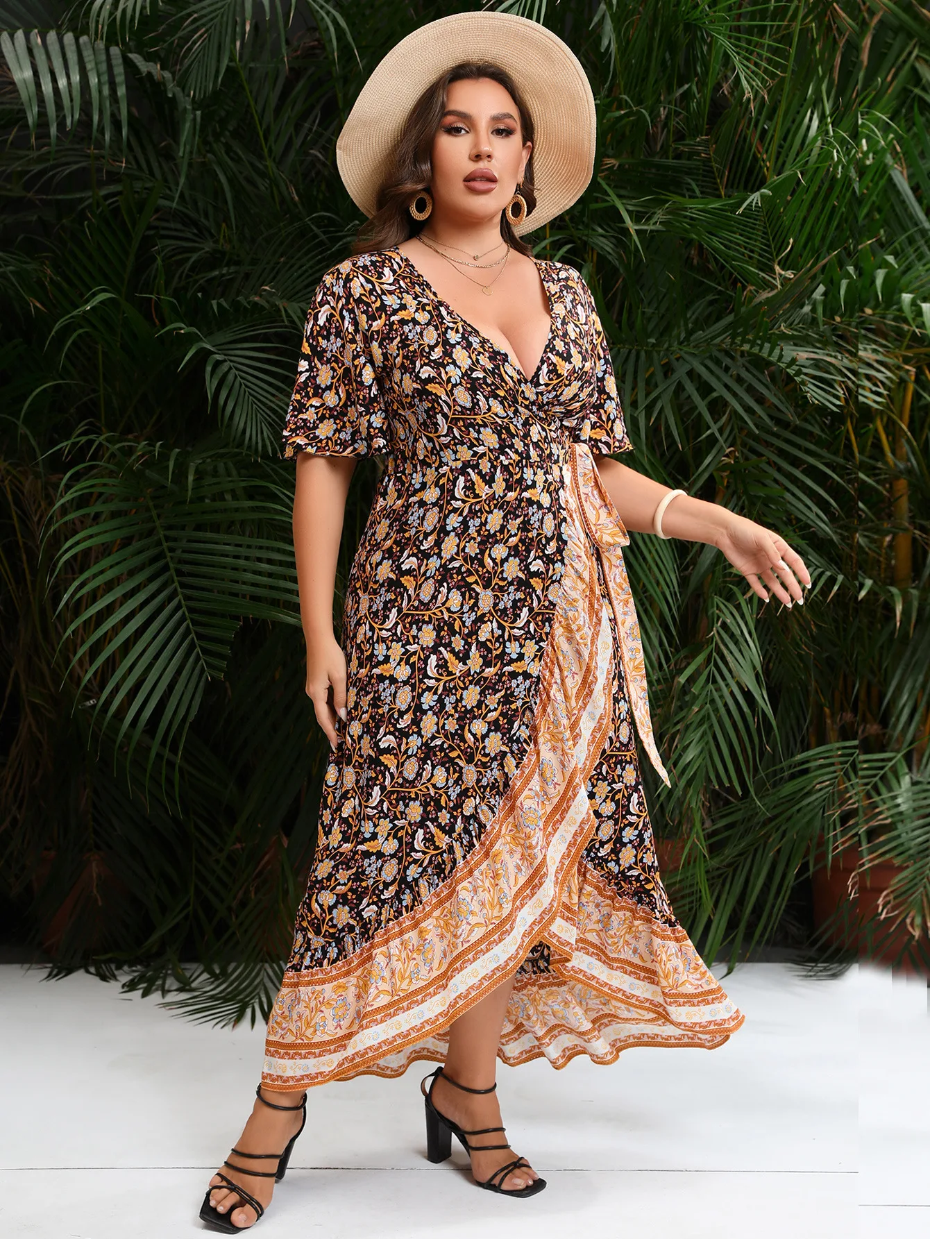 2025 Casual V-Neck Floral Print Plus Size Dress Women Ruffle Short Sleeve Large Midi Dress Lady Chubby Curvy Lace-Up Long Dress