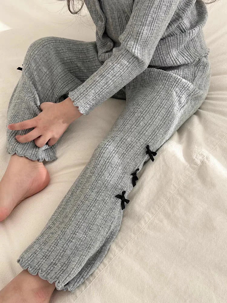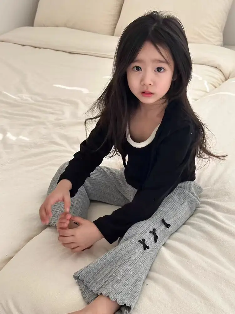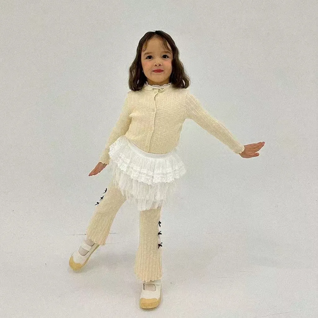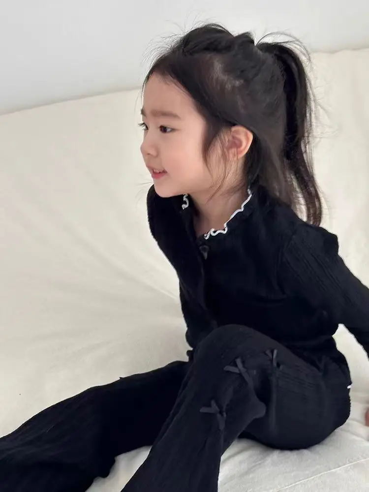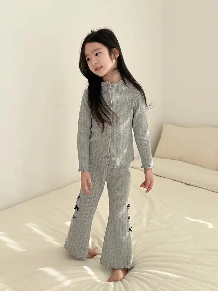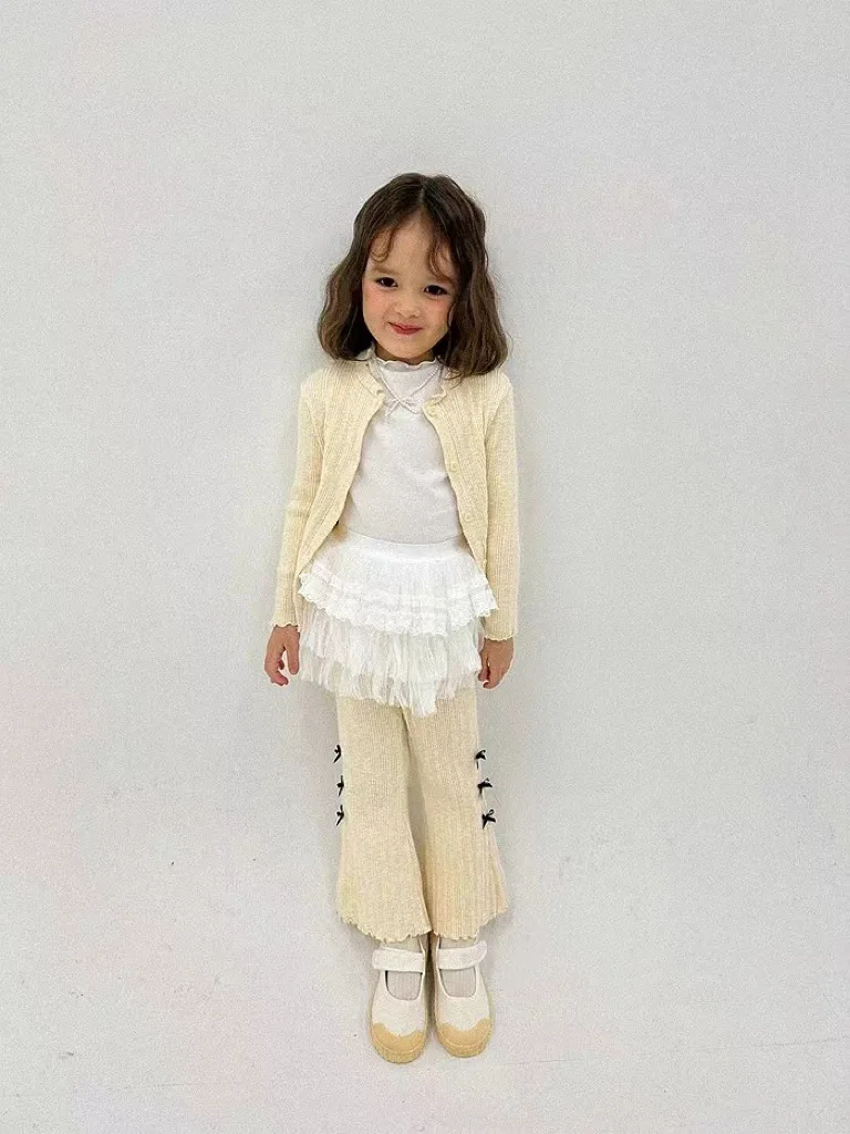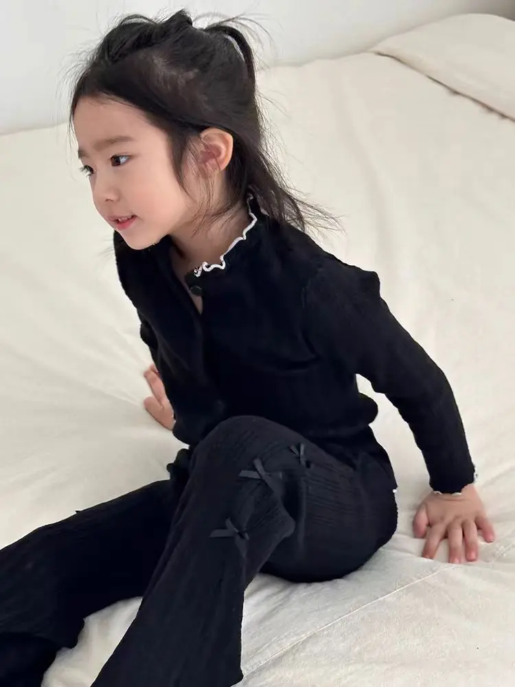 2025 Spring New Baby Girl Long Sleeve Clothes Set Toddler Ribbed Cardigan Coat + Bow Flared Pants 2pcs Suit Kids Casual Outfits