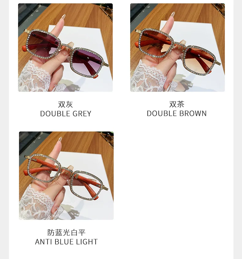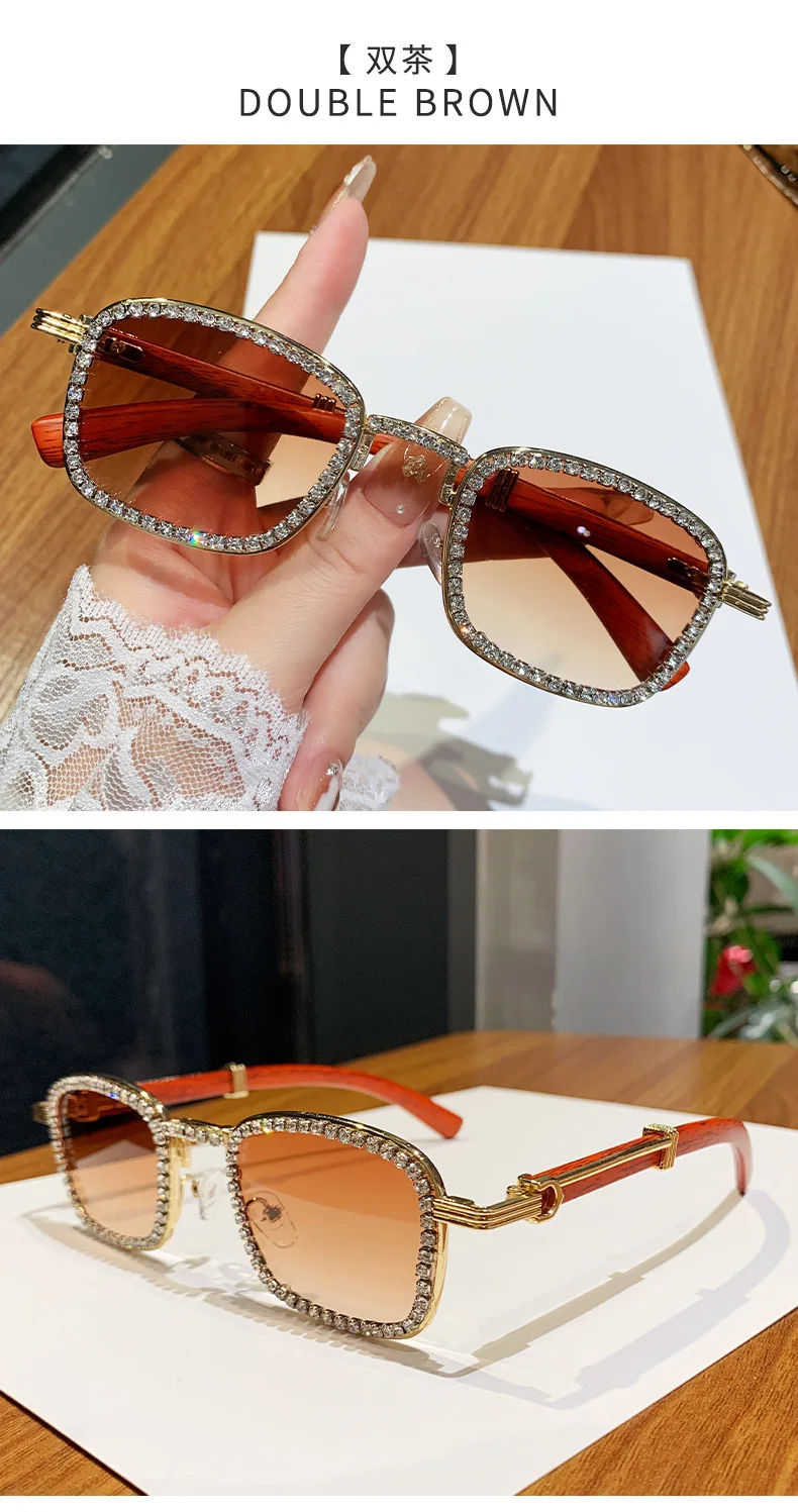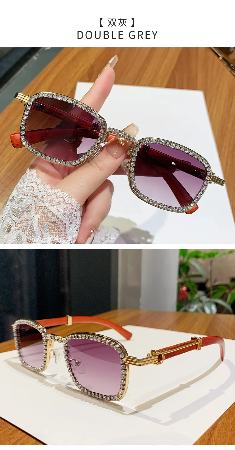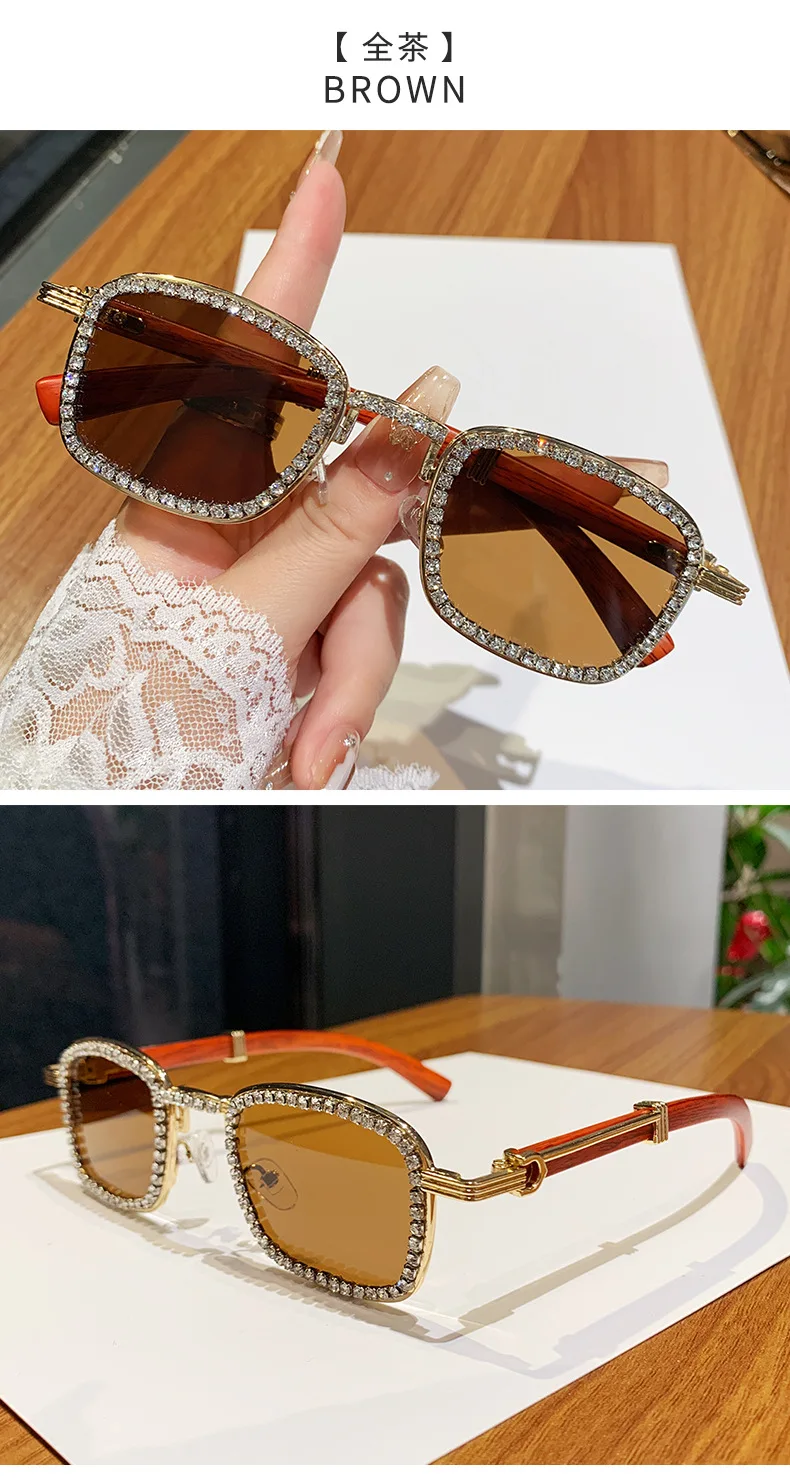2025 Square Diamond Sunglasses for Women with A High-end Feel Imitation Wood Grain Legs Girls Sunglasses with Rhinestone