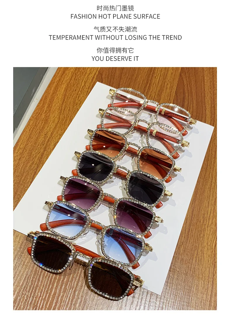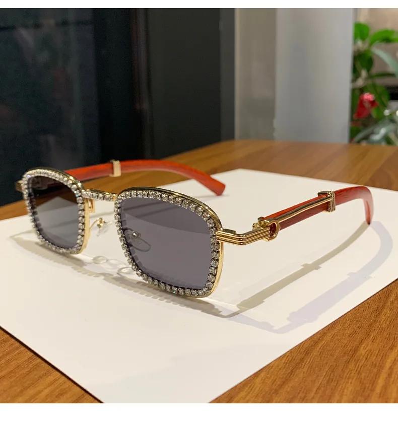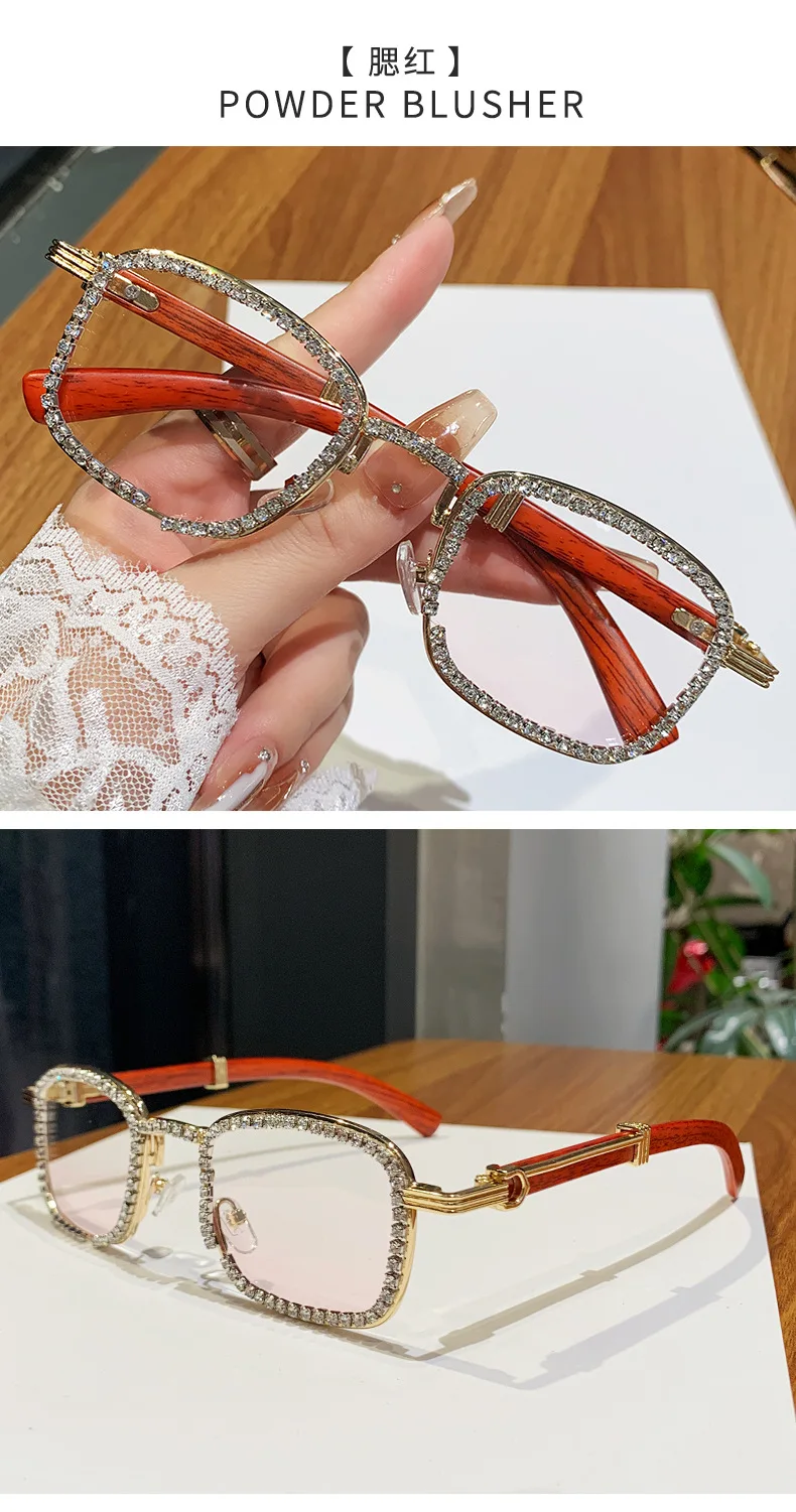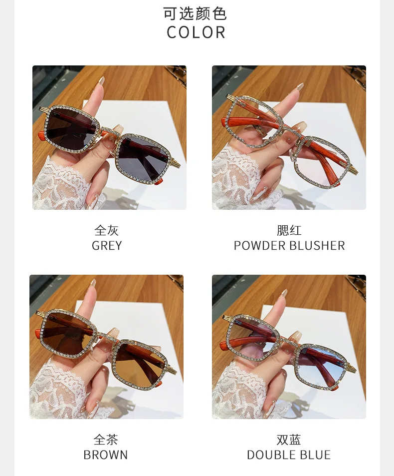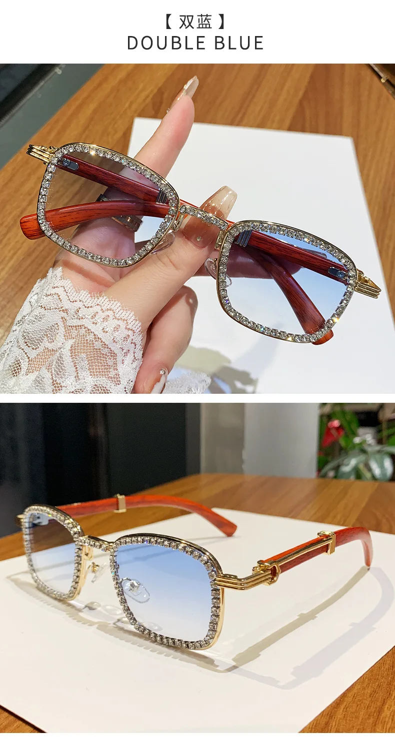 2025 Square Diamond Sunglasses for Women with A High-end Feel Imitation Wood Grain Legs Girls Sunglasses with Rhinestone