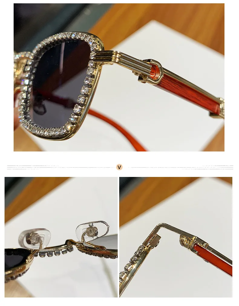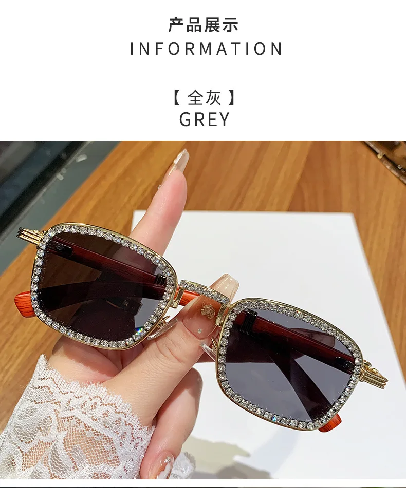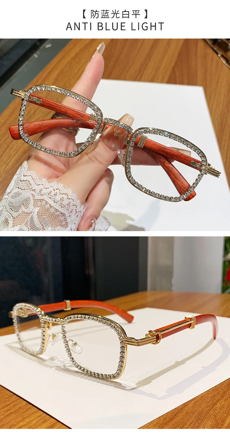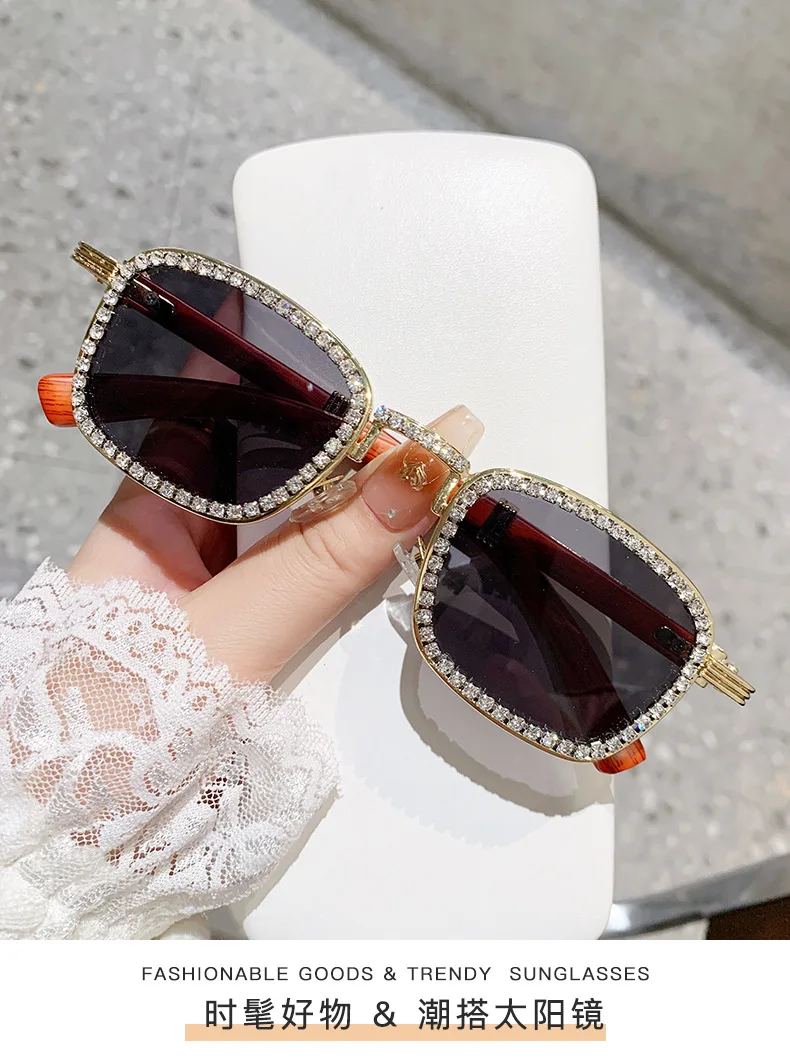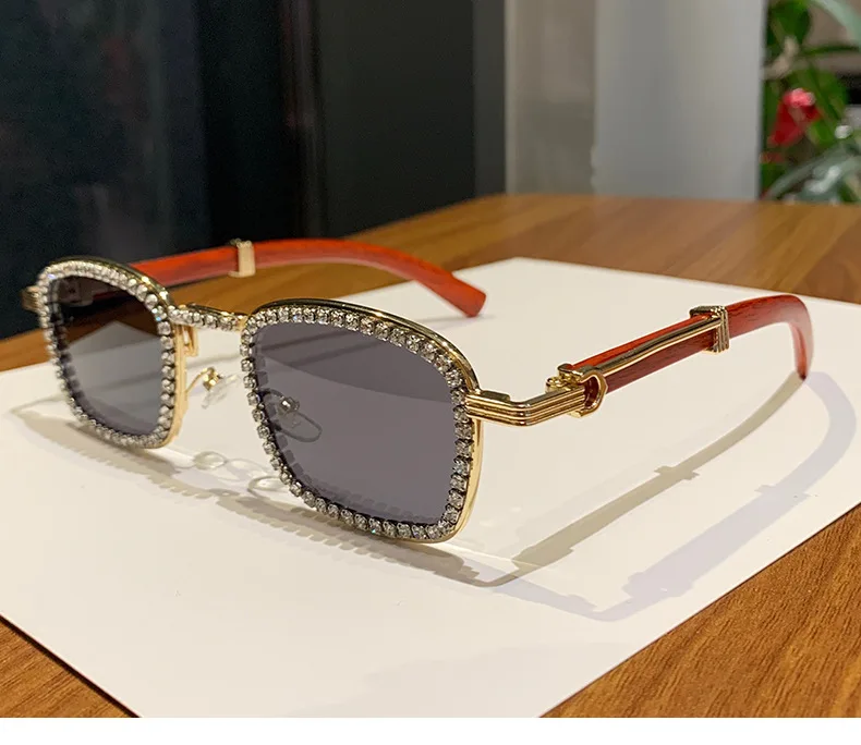 2025 Square Diamond Sunglasses for Women with A High-end Feel Imitation Wood Grain Legs Girls Sunglasses with Rhinestone
