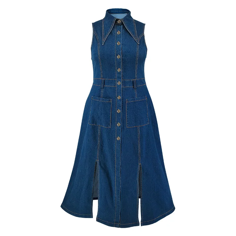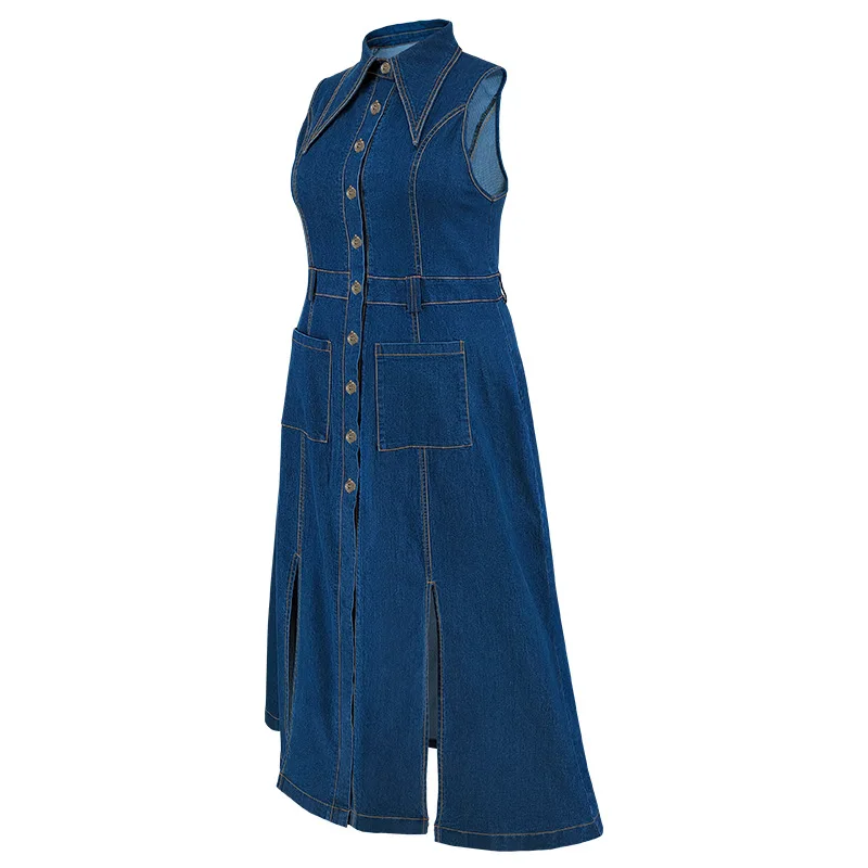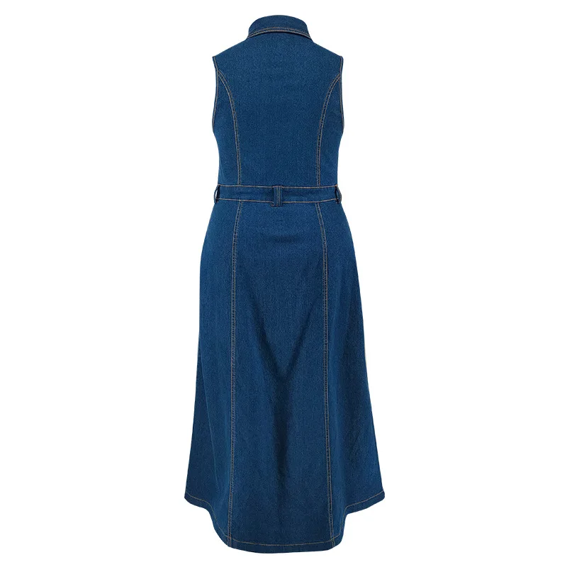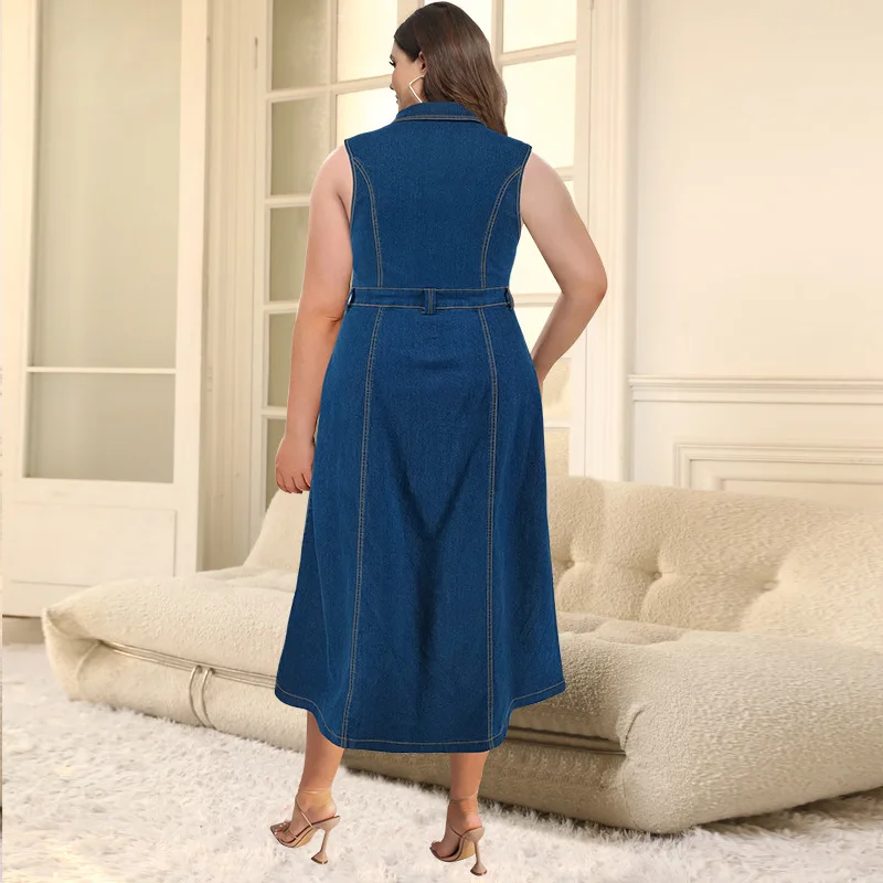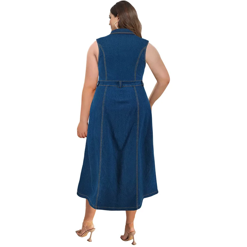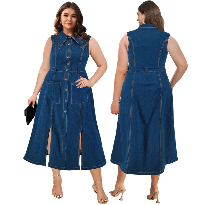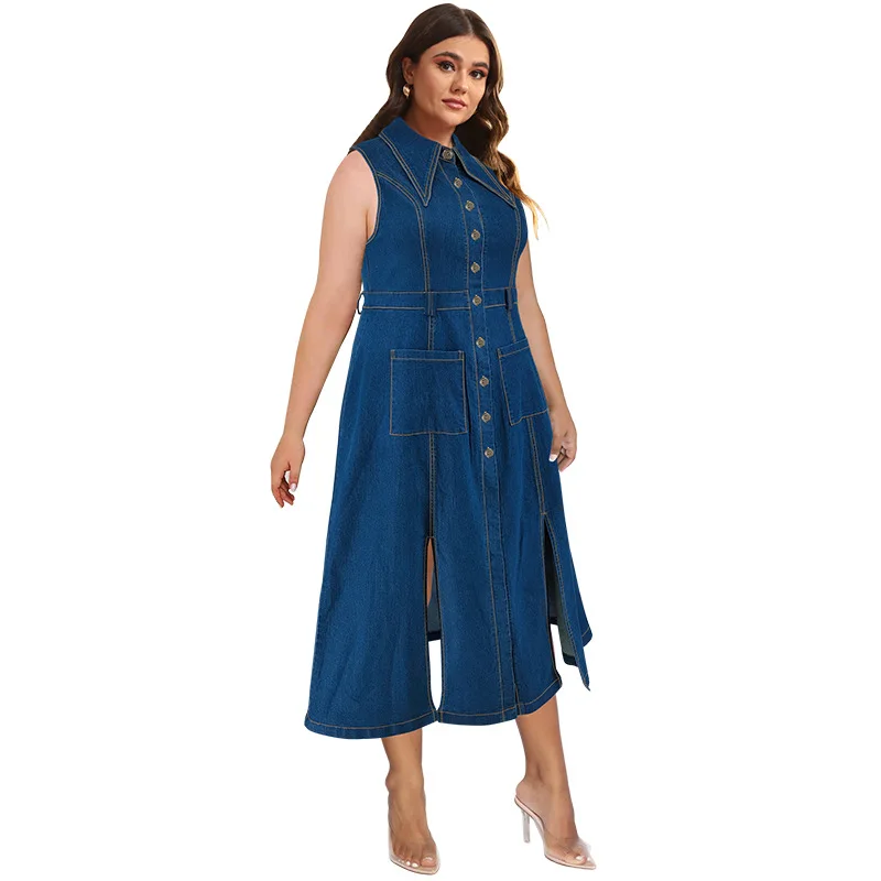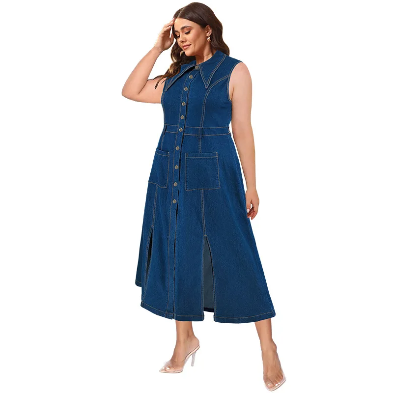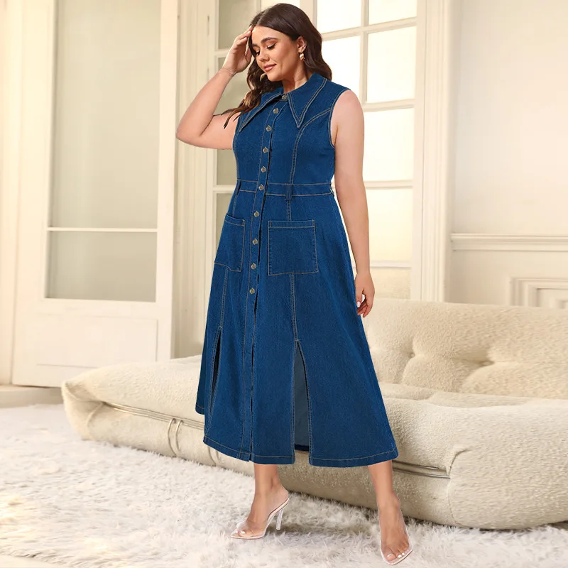 2025 Summer Button Plus Size Denim Dress Women Sleeveless Large Jean Dresses Ladies Big Turn-down Collar Split Curvy Long Dress