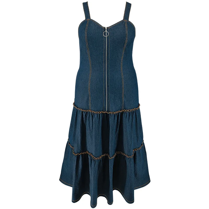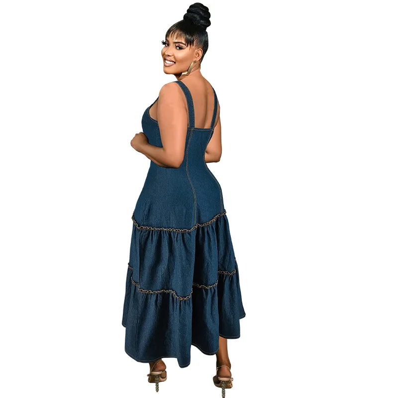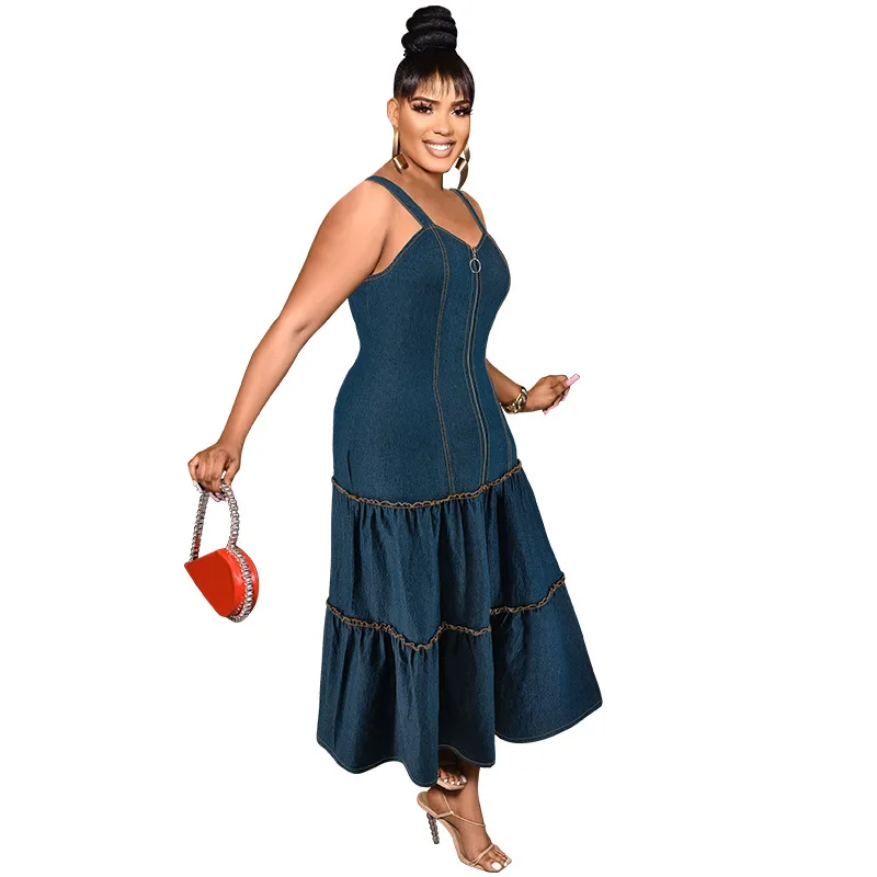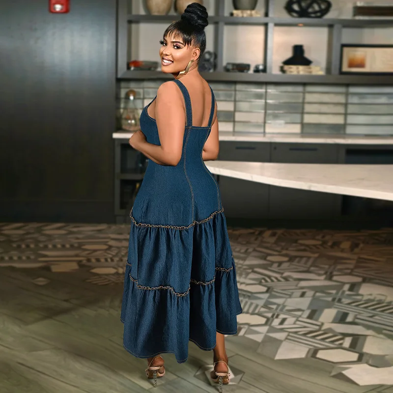 2025 Summer Spaghetti Strap Plus Size Denim Dress Women Sleeveless Large Midi Jean Dress Lady Backless Pleated Curvy Long Dress