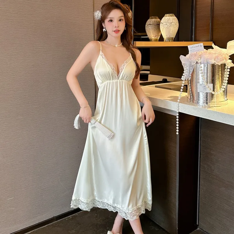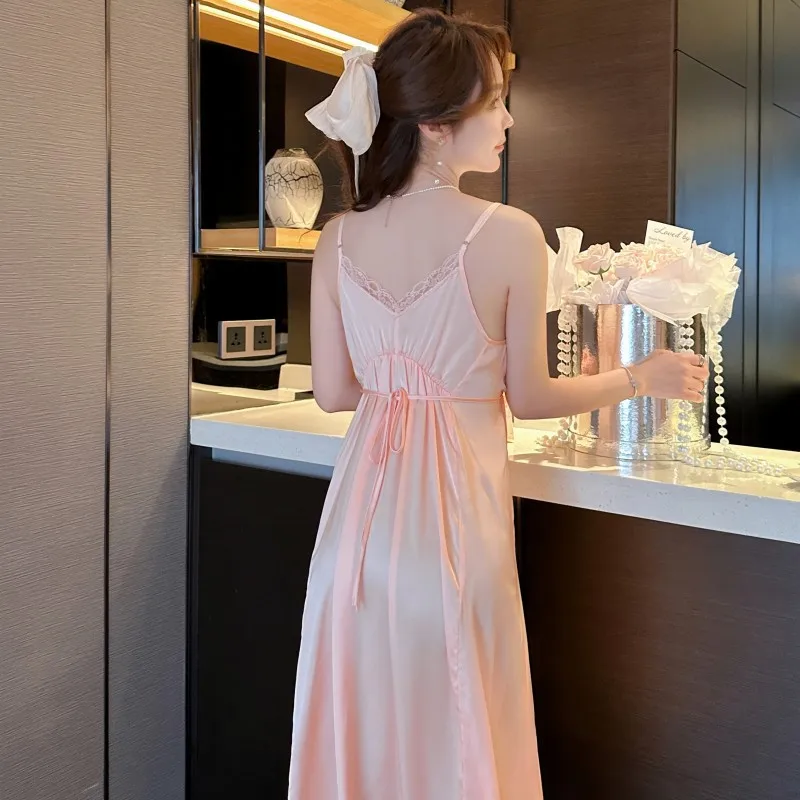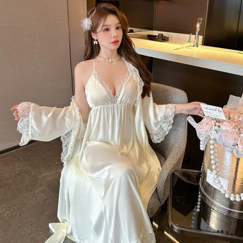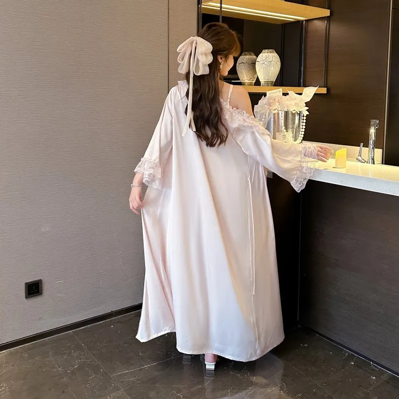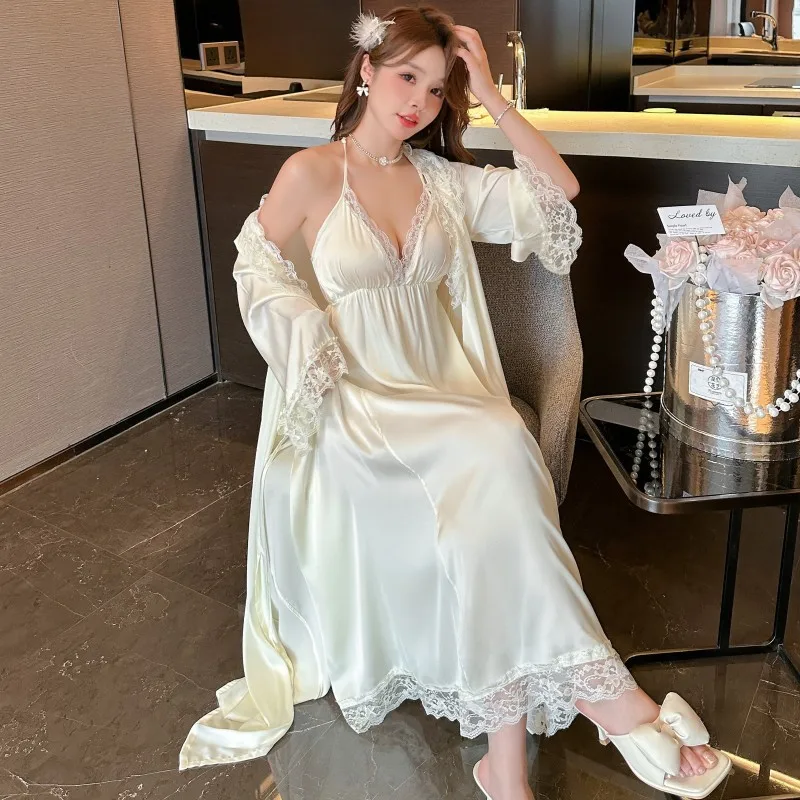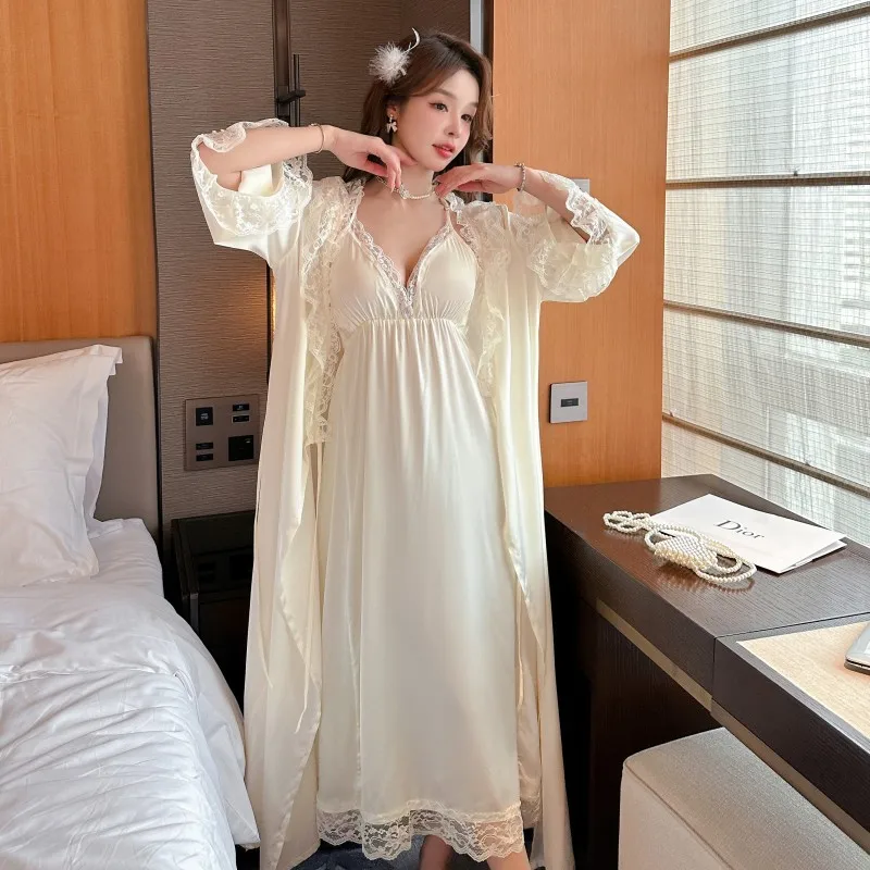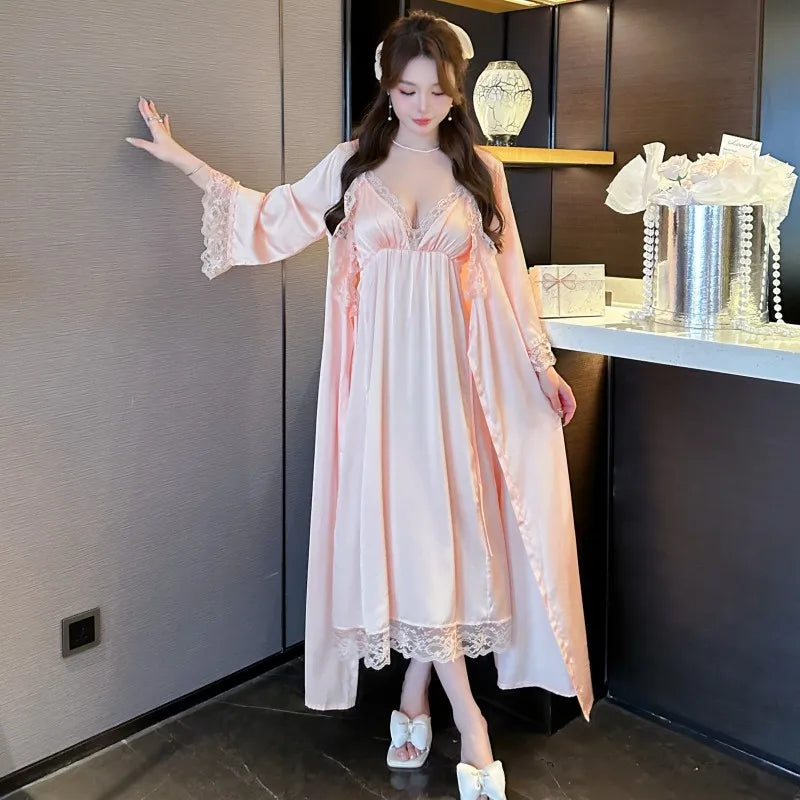2PCS Bathrobe Gown Set Summer Satin Nightgown Women Nighty&robe Suit Lace Nightdress Loungewear Kimono Sleepwear Lady
