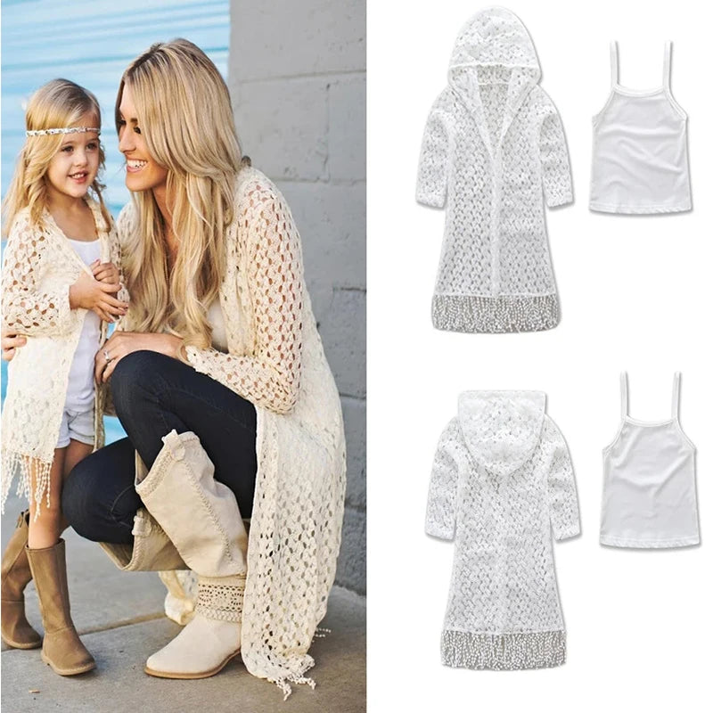 2Piece Spring Summer Family Matching Outfits Mother Daughter Clothes Hooded Girl Coat+White Tops Kids Boutique Clothes BC1040