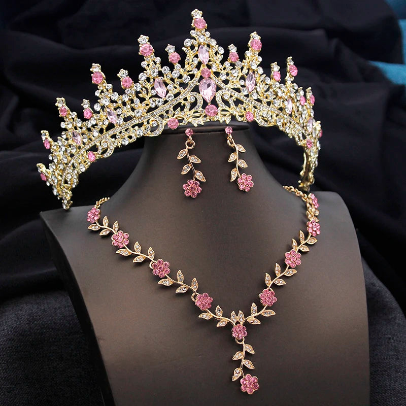 3 pcs Pink Bridal Jewelry Sets for Women Crown Flower Choker Necklace Earring Wedding Tiara Bride Costume Accessories