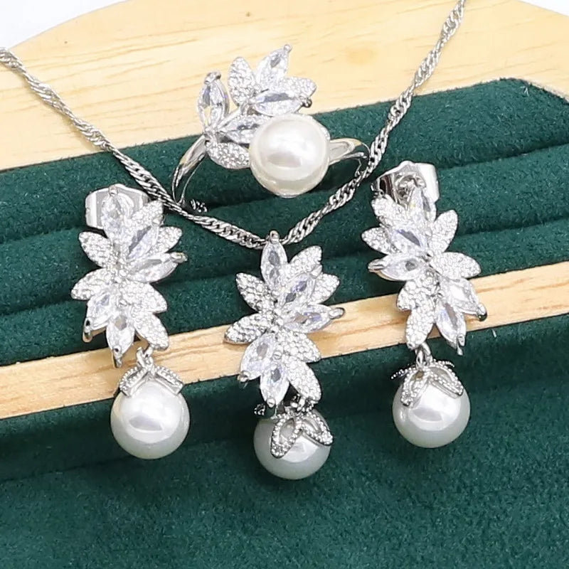 925 Sterling Silver Jewelry set for Women White Pearl Earrings Necklace pendant Ring Zircon Bracelet Birthday Gift