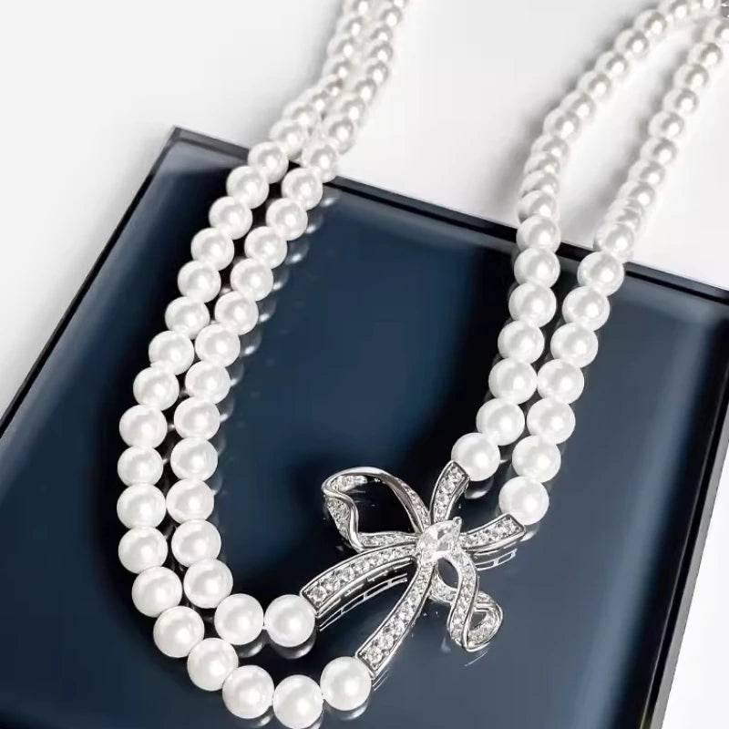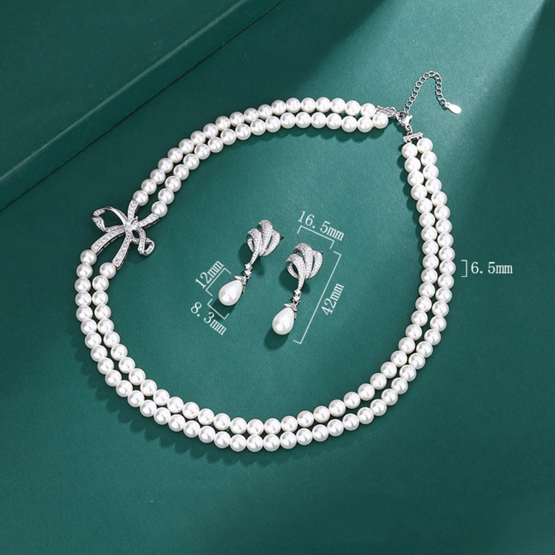 925 Sterling Silver Two Lines 6.5mm Pearl Necklace Earrings Set for Women Girls Fashion Bowknot Charm Ladies Wedding Jewelry