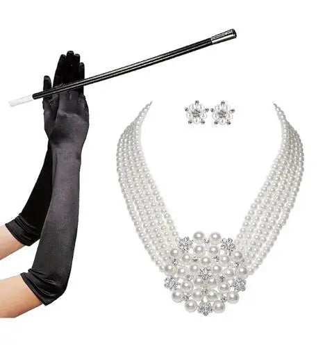 Audrey Hepburn Breakfast at Tiffanys 1950s Costume Jewelry Accessory Set Pearl Necklace Earring Bracelet Glove Cigarette Holder