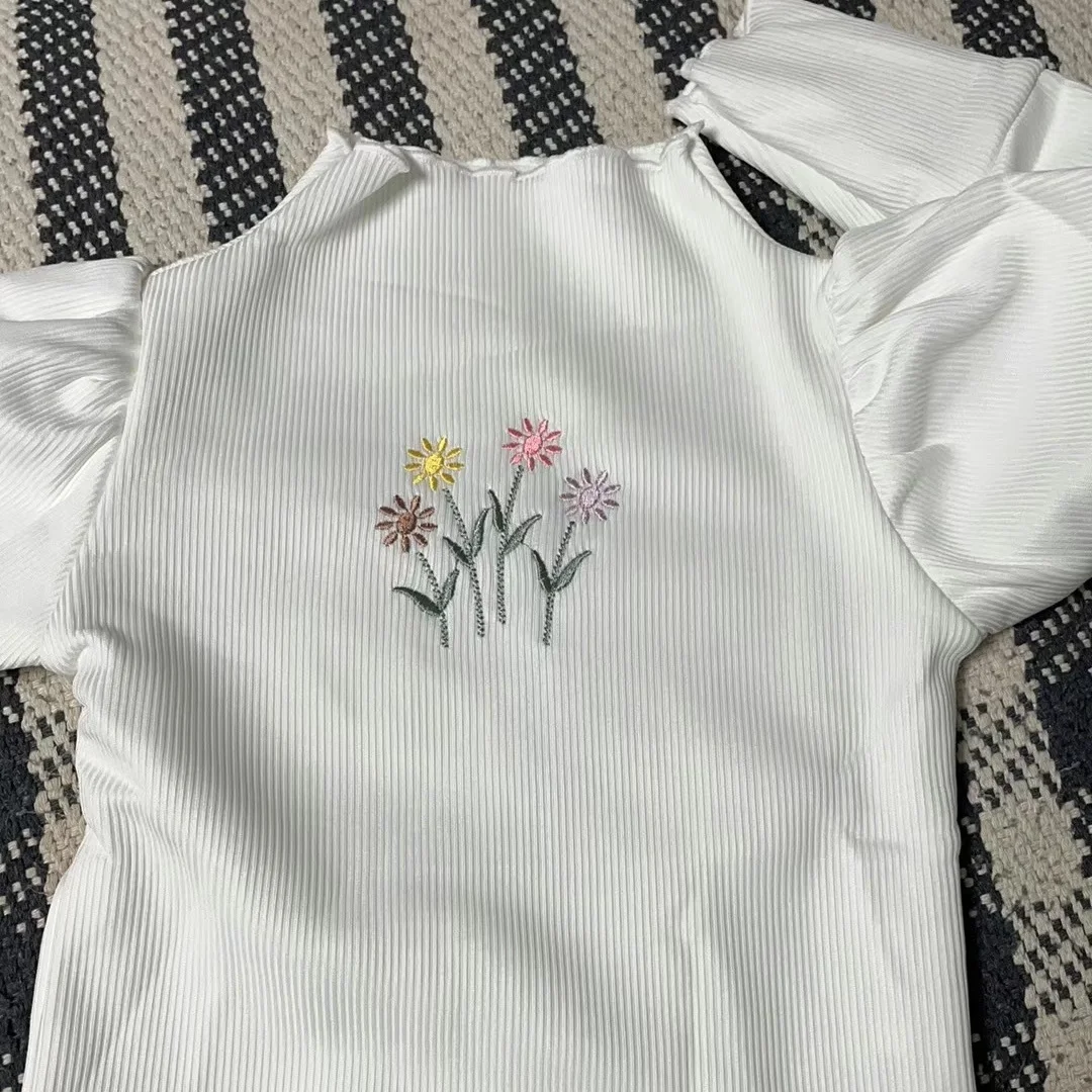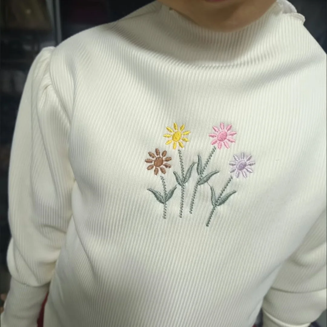 Autumn Winter Girls Bottoming Shirt Flower Embroidery Puff Sleeve Kids Baby Warm Thickening T-shirts Children Casual Tops