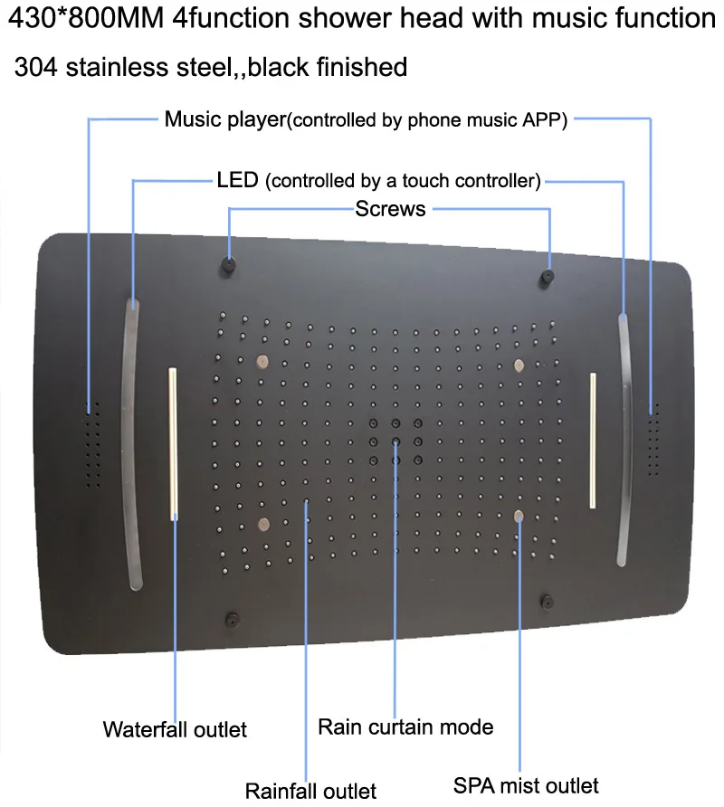 If you choose the shower head is with music,the shower head size is 430*800MM ,please noted ,thanks.
