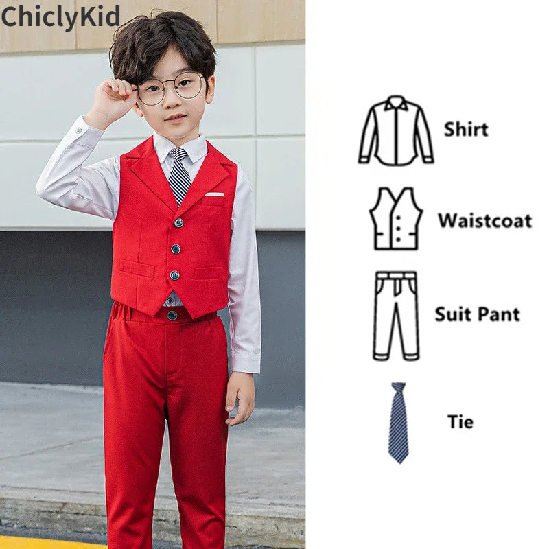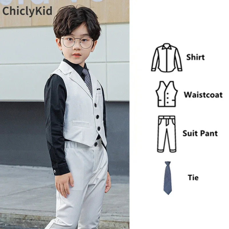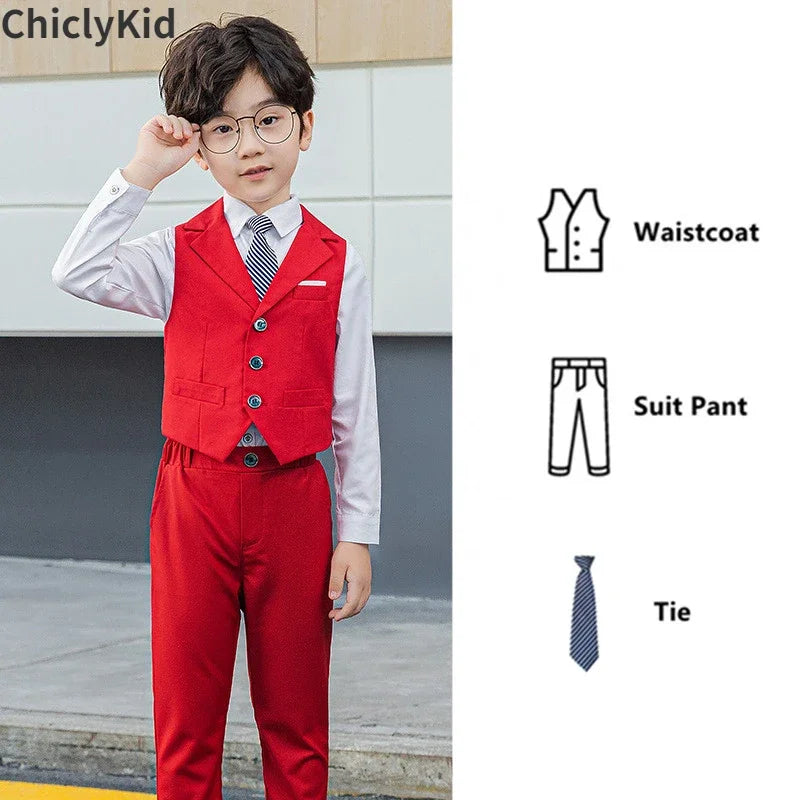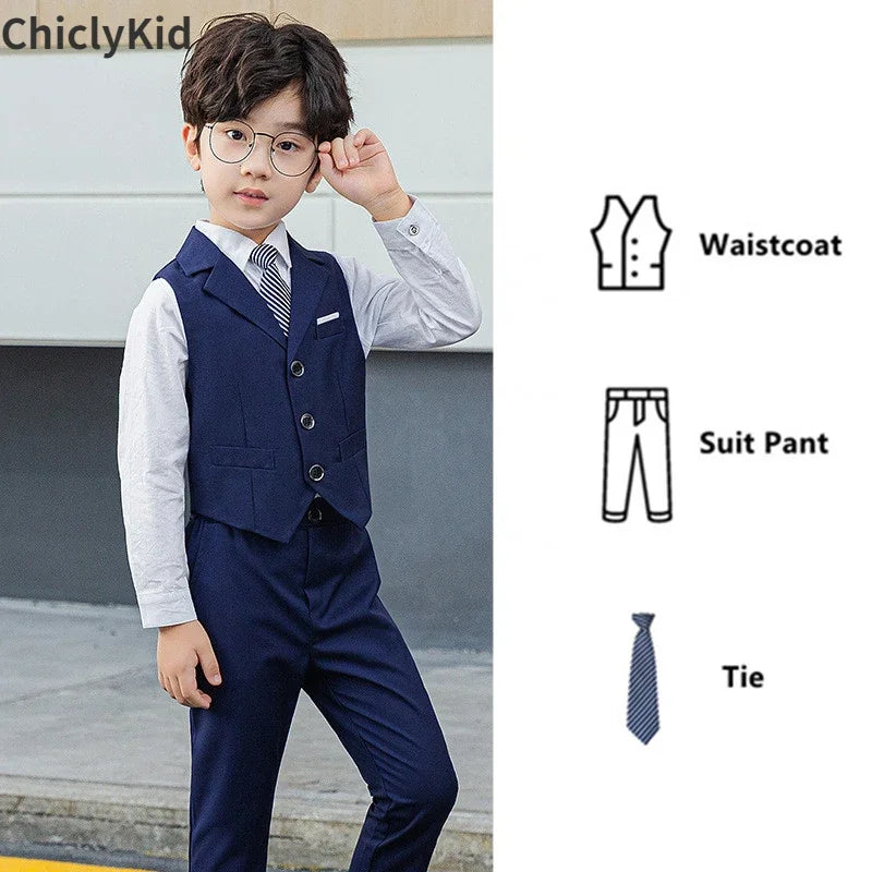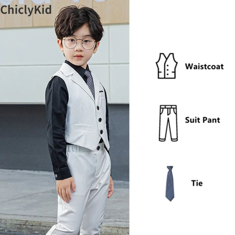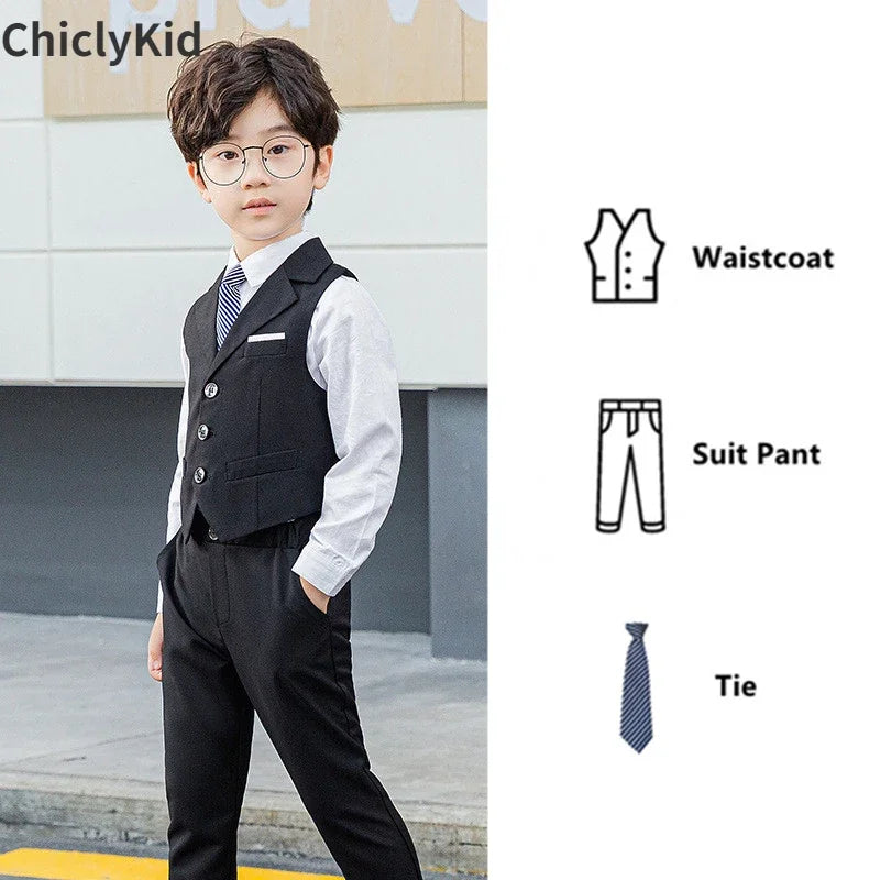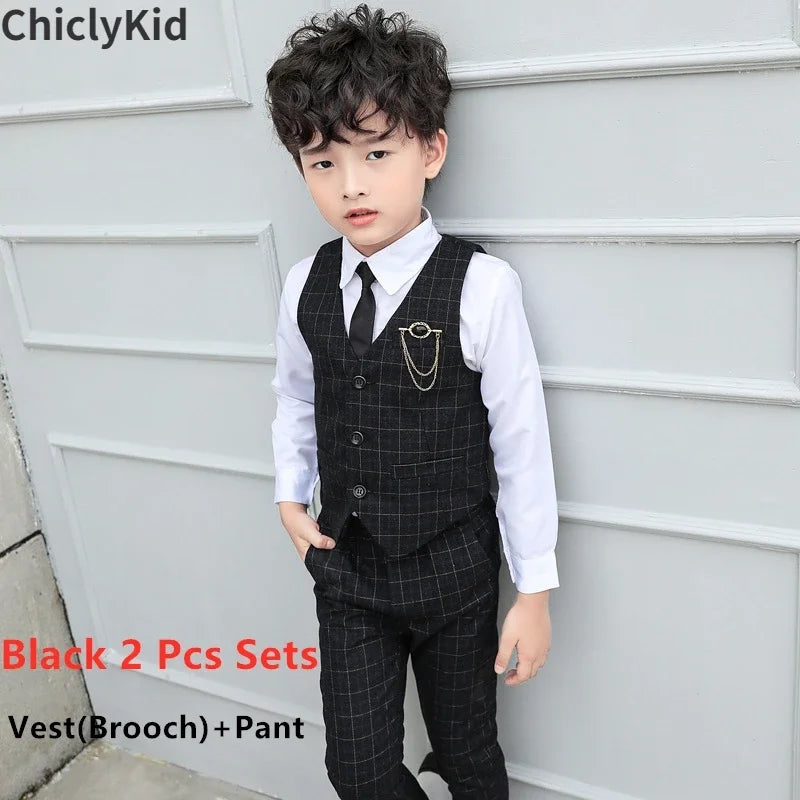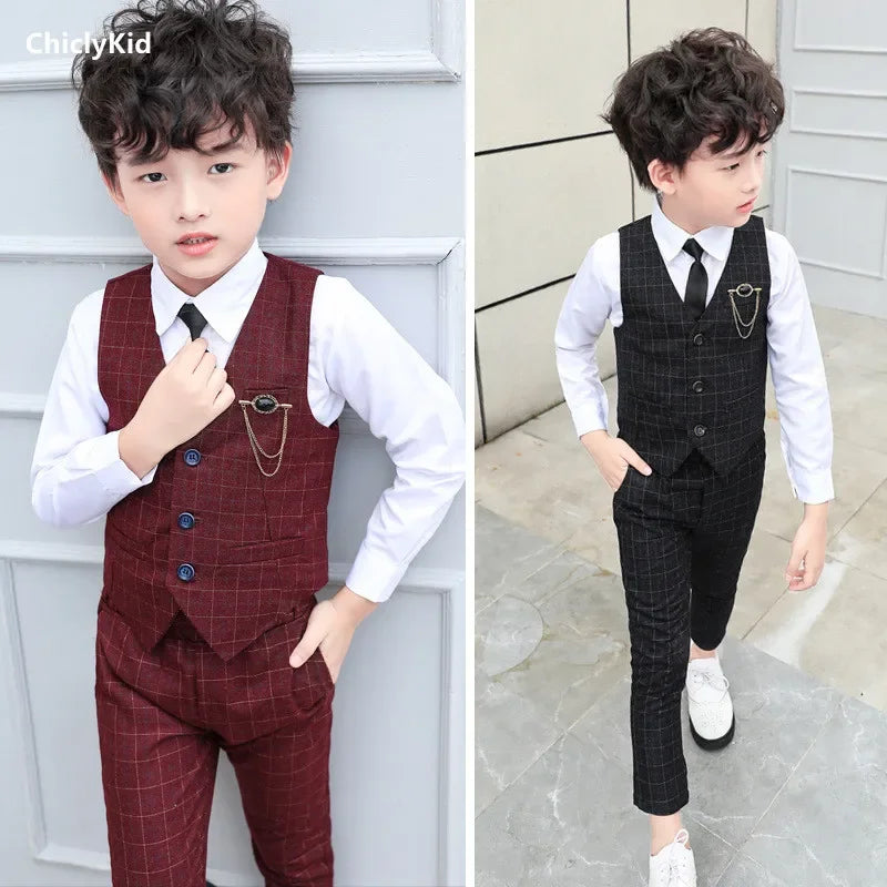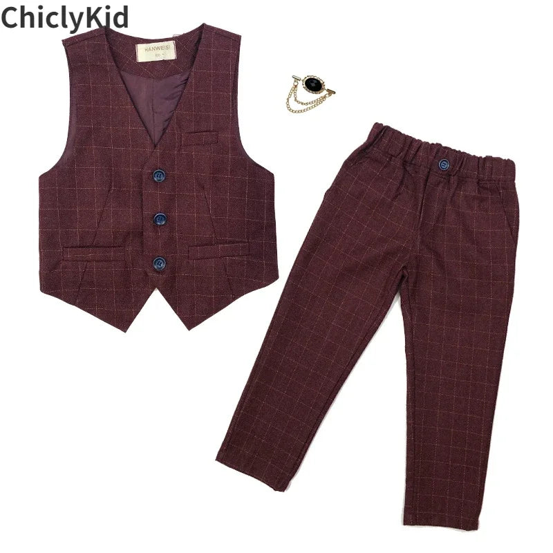Boy Plaid Vest Blazer Kids Waistcoat Wedding Clothes Set Toddler Formal Dress Suit Child Brooch Shirt Pant Baby Gentlemen Outfit