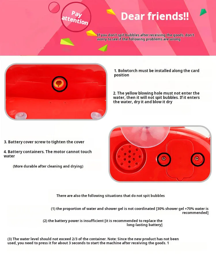 • Versatile Bath Toy :This bath toy is not just a bubble maker, but it can also be used as a soap machine. It's a versatile tool that can help your child stay clean and fresh after every bath.