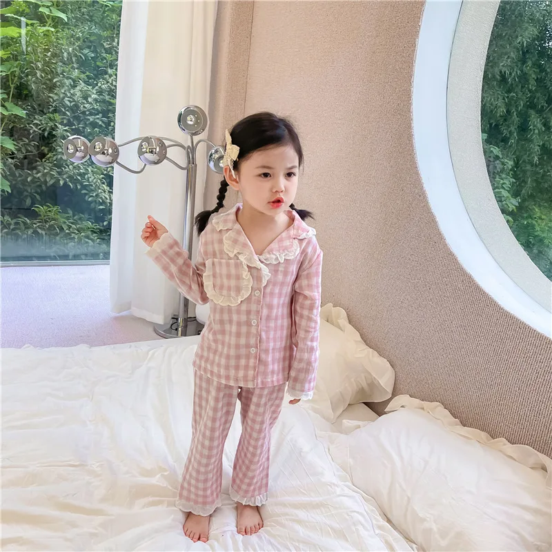 Children Pajamas 2024 Spring New Korean Children Clothing Girl Sweet Checkered Pajama Set Long sleeved Pants Home Fury