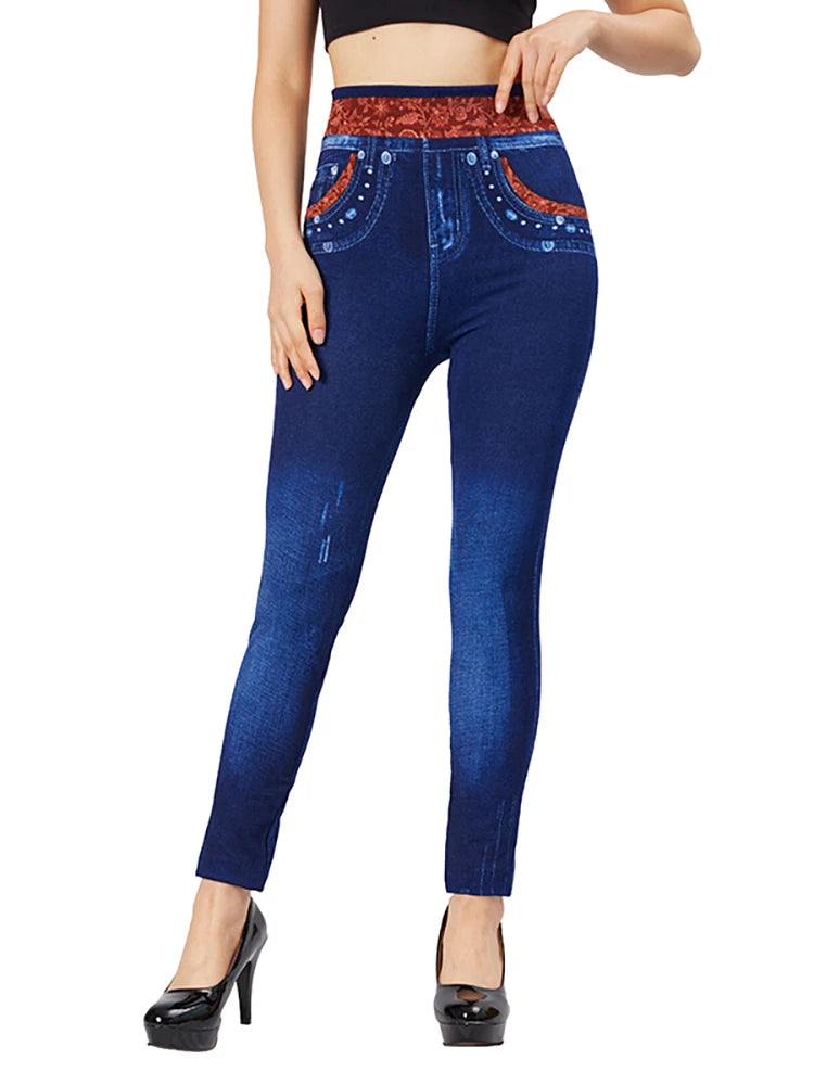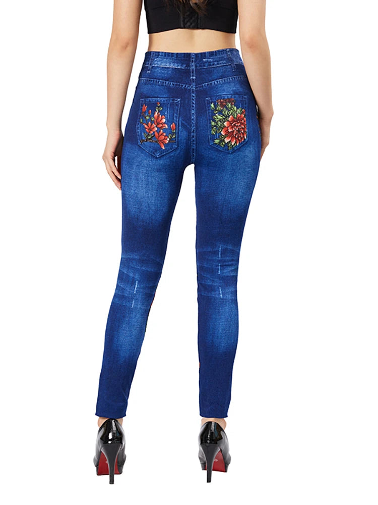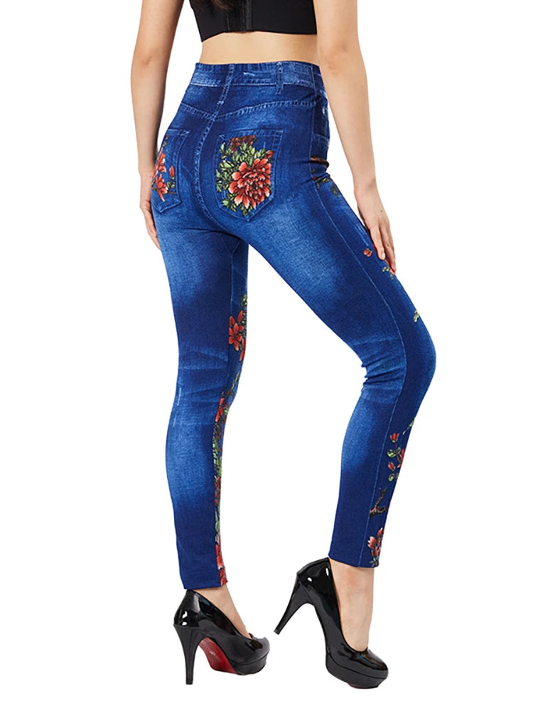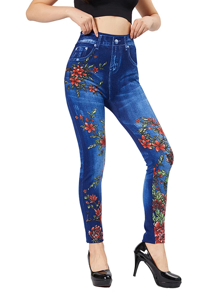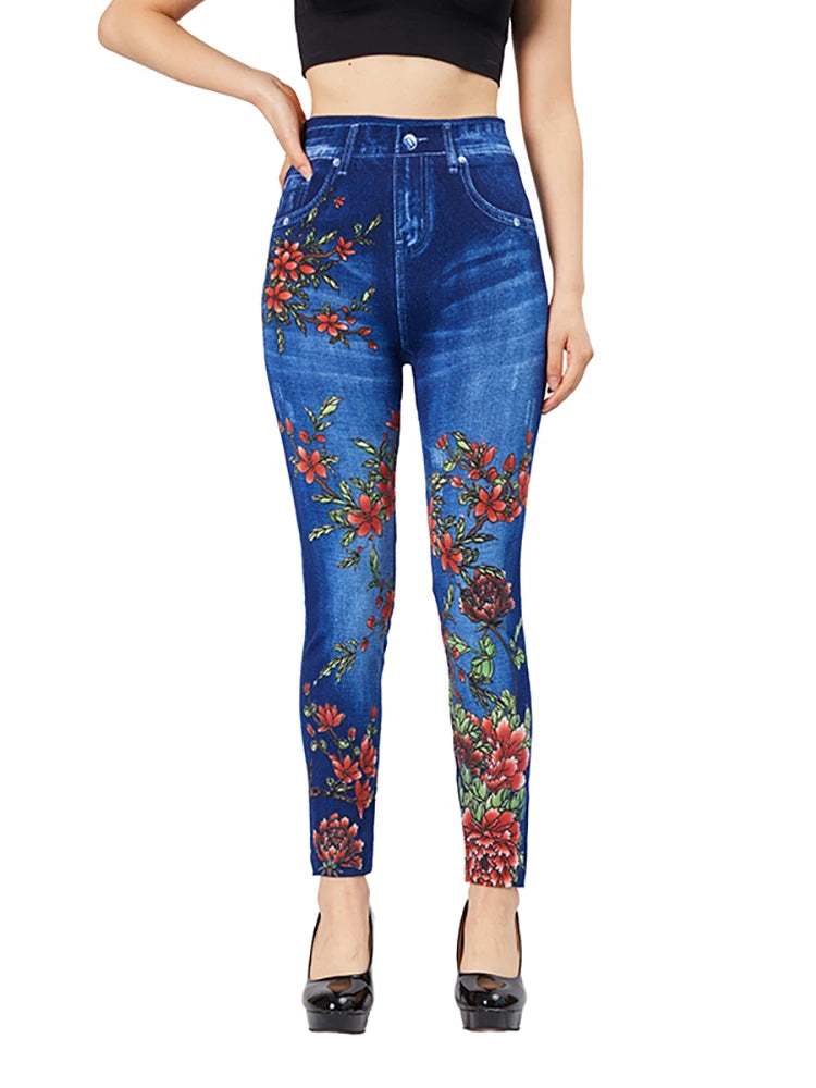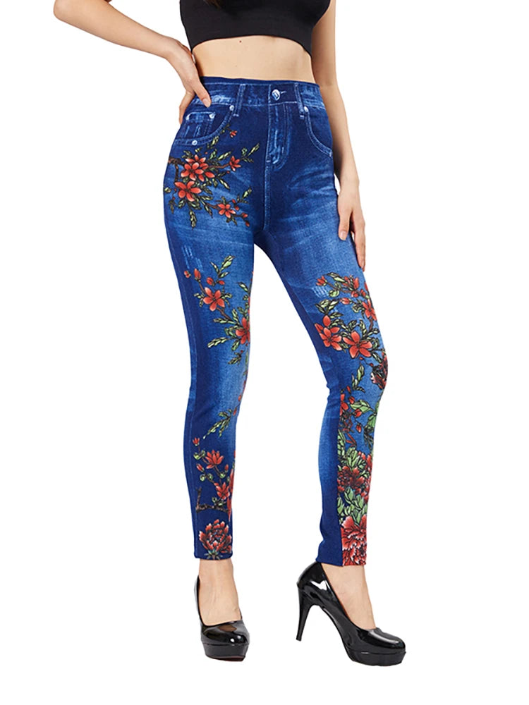 CUHAKCI Flame Flower Print Slim Fit Blue Jeggings Women's Casual Pencil Pants Elastic Fake Pocket Jeans Workout Yoga Leggings