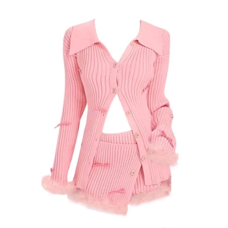 Cute Autumn Pink Knitted Suit Woman Kawaii Elegant Set Korea Fashion Clothing Woman Casual Sweater + Slim Bodycon Y2k Mini Skirt