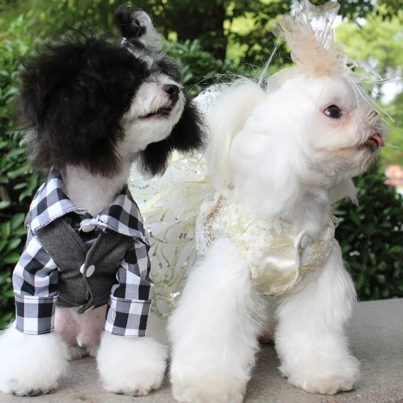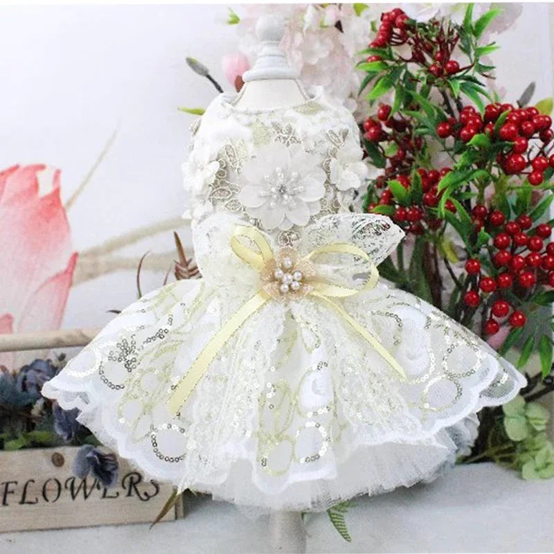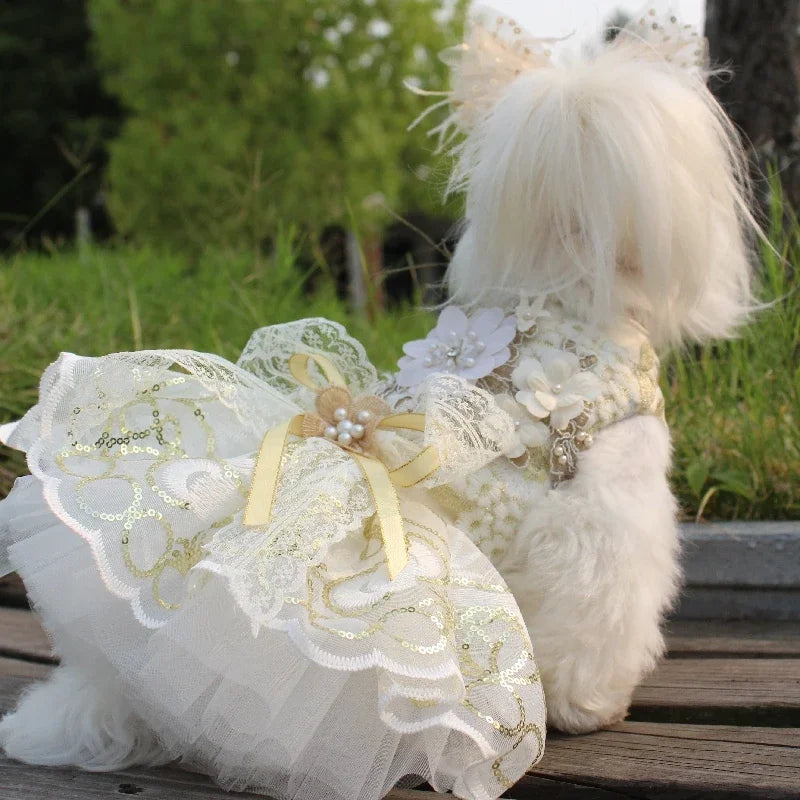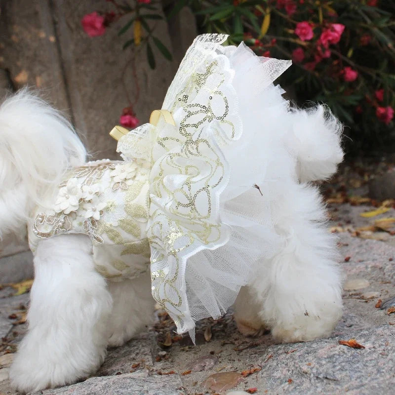 Cute Pet Dog Cats Clothes Luxury Handmade Golden Sequin Lace Flower Party Dress For Small Medium Dogs Fashion Outfits Puppy Coat