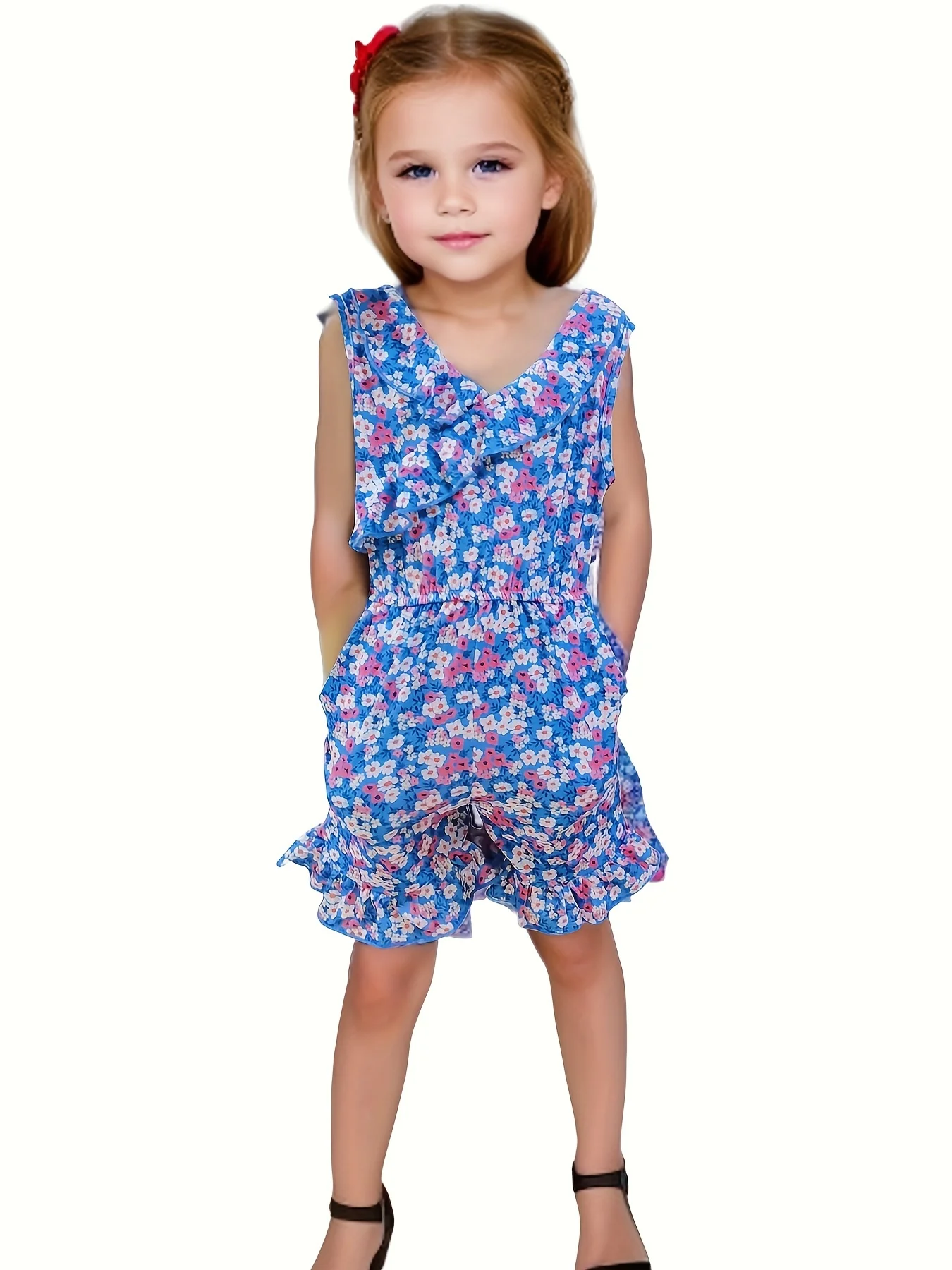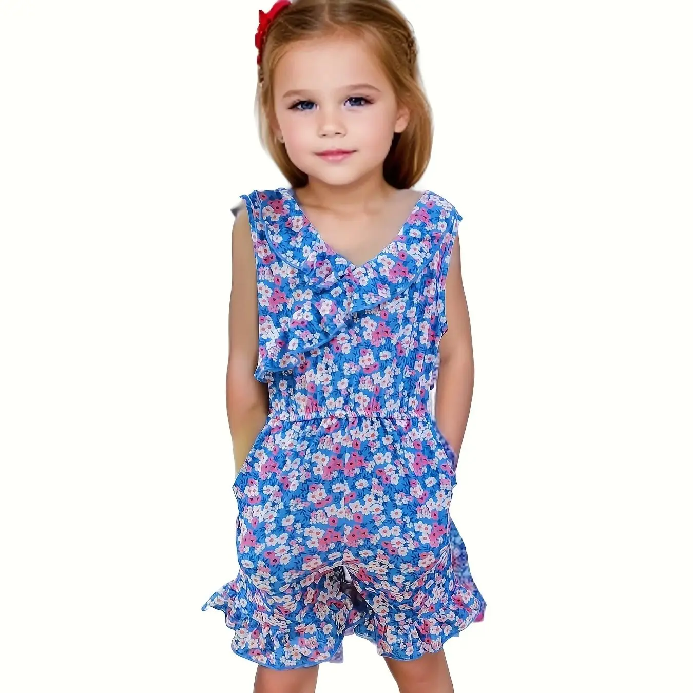 Cutest Girl Floral Printing Jumper With Pockets Summer and Spring Blue Flower Flutter Ruffle Casual Everyday Wear Clothes