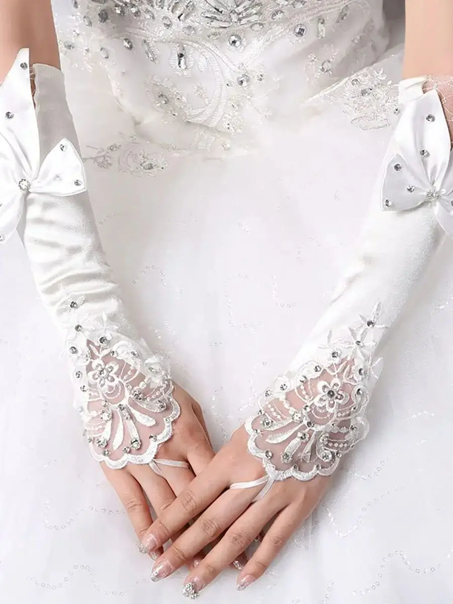 Elbow Length Fingerless Satin Embroidery Beads Bridal Wedding Gloves Tea Party Luva De Noiva Cosplay Bridal Accessories
