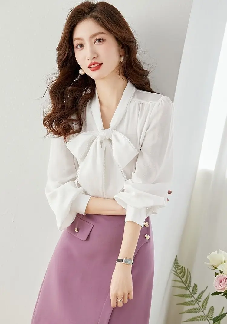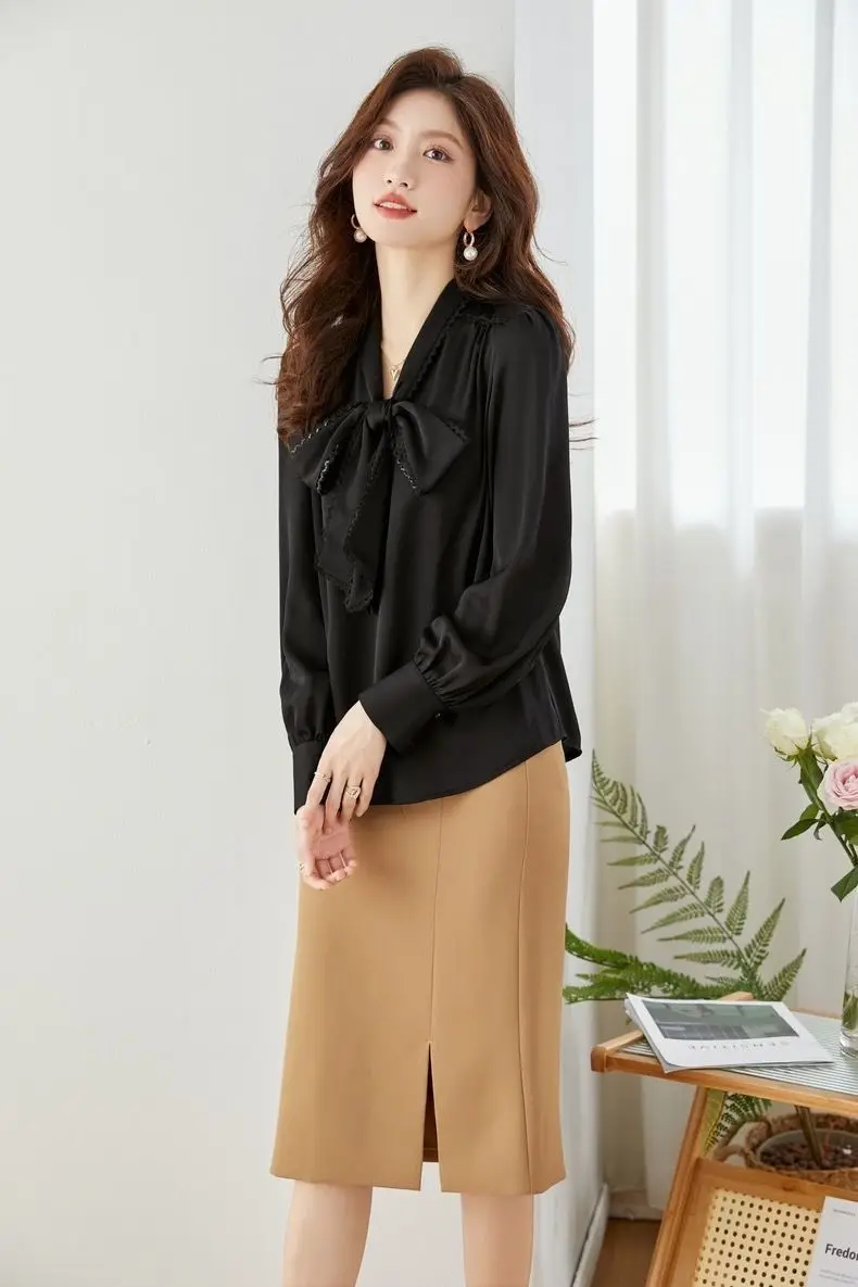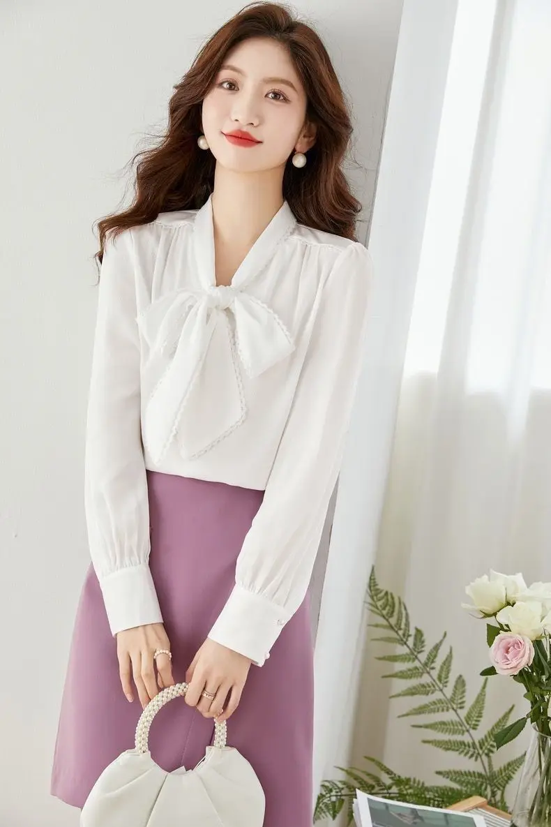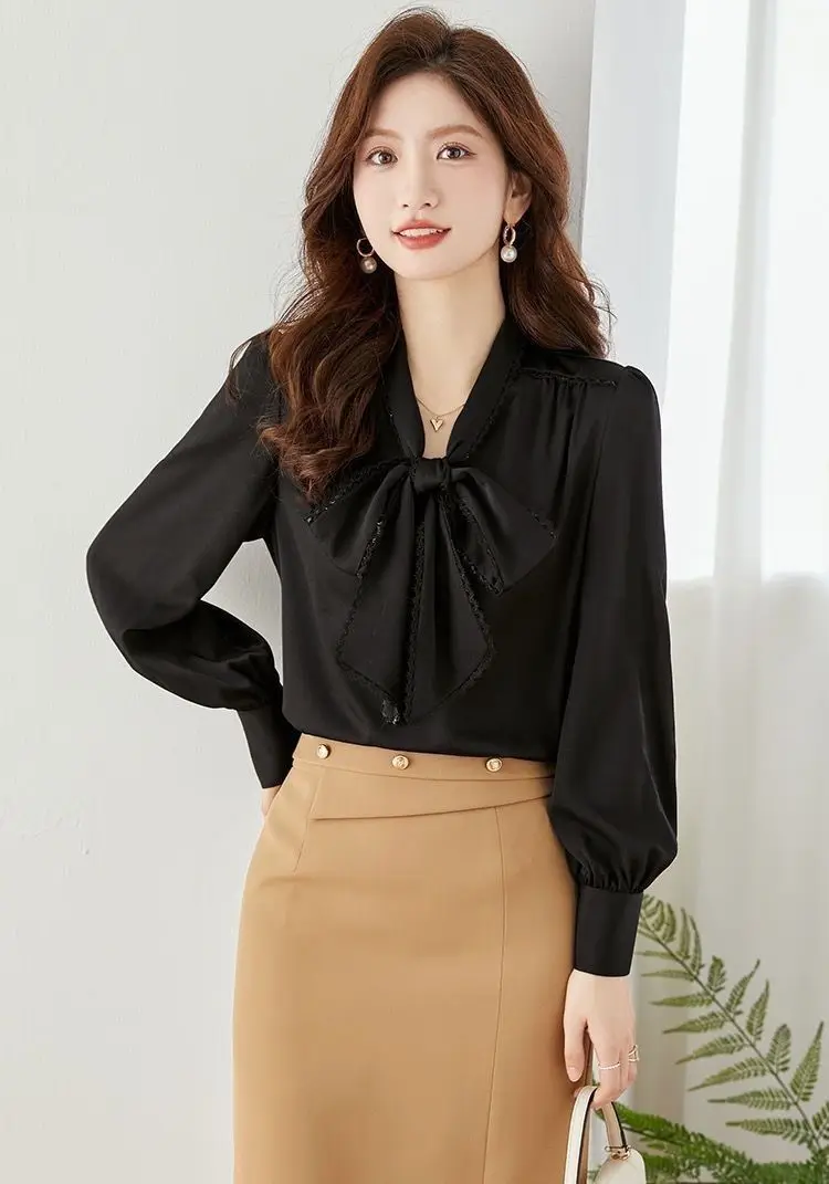 Elegant Bow Chiffon Blouses Office Women Fashion Autumn Winter Blusas Korean Clothing White Black Ladies Puff Sleeve Tops Shirts