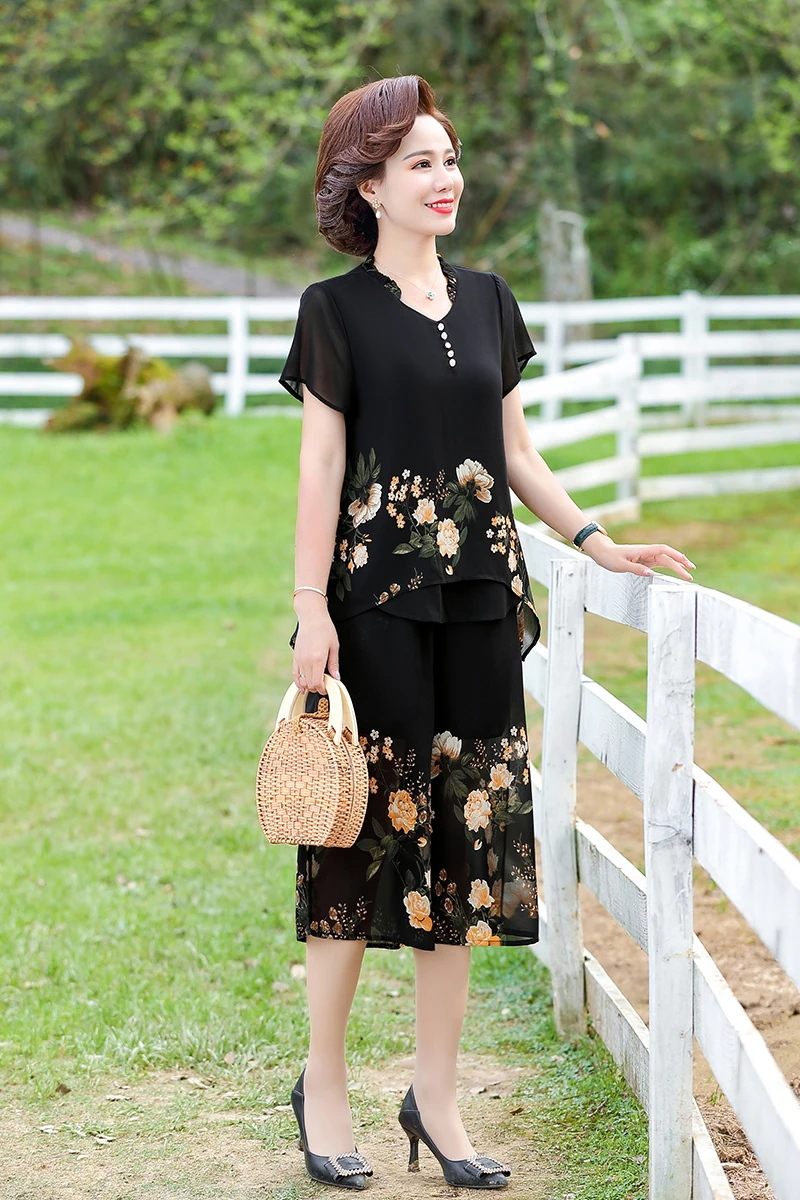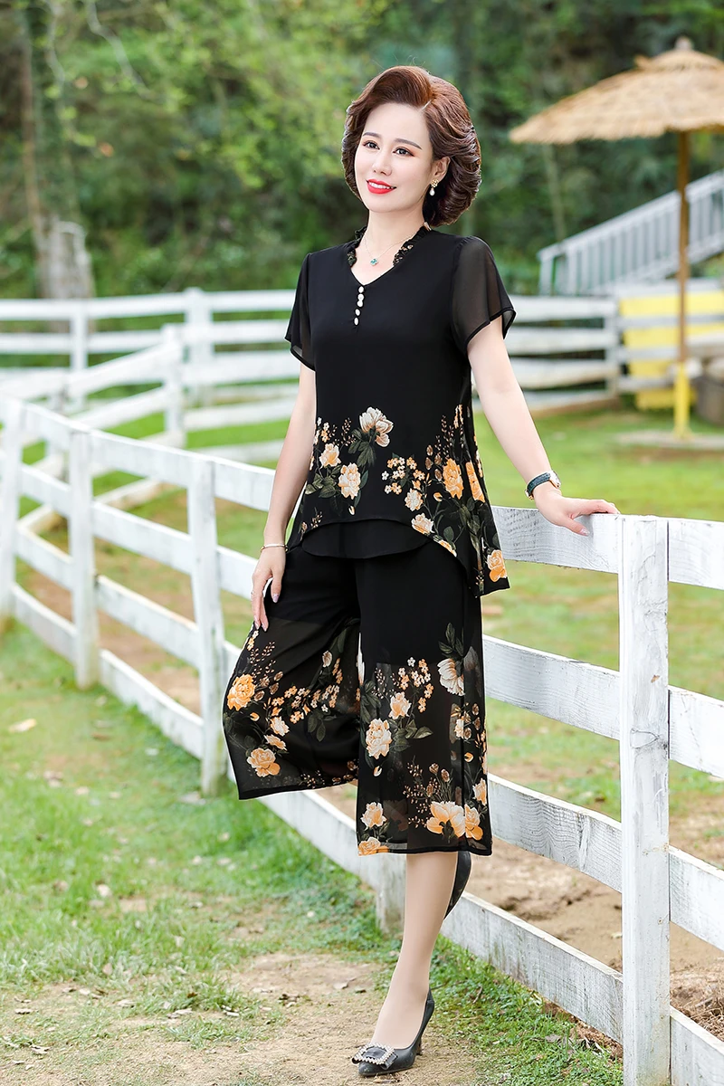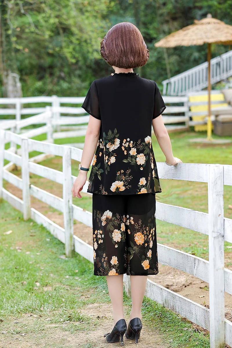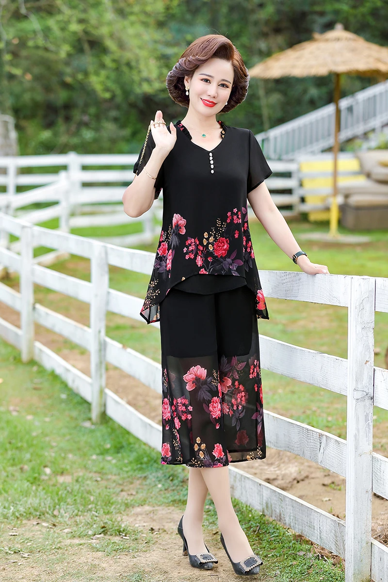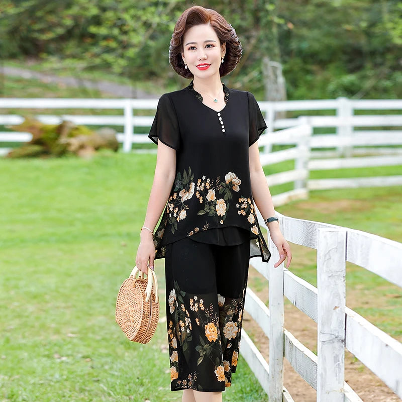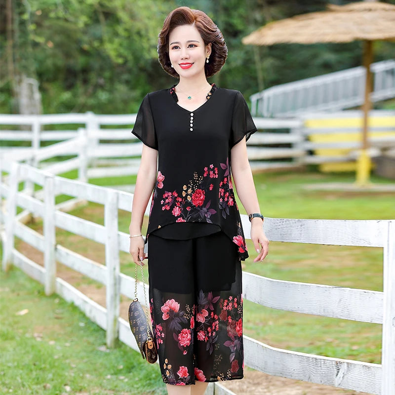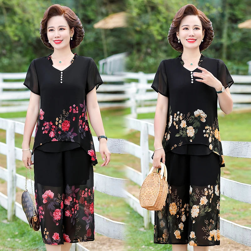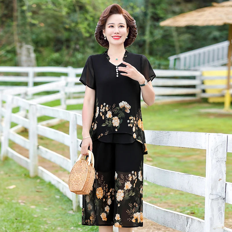 Elegant floral Middle-aged Womens Summer Suits Short Sleeve Chiffon T-shirt Top &Wide-leg Pants 2 Pcs Sets 5XL